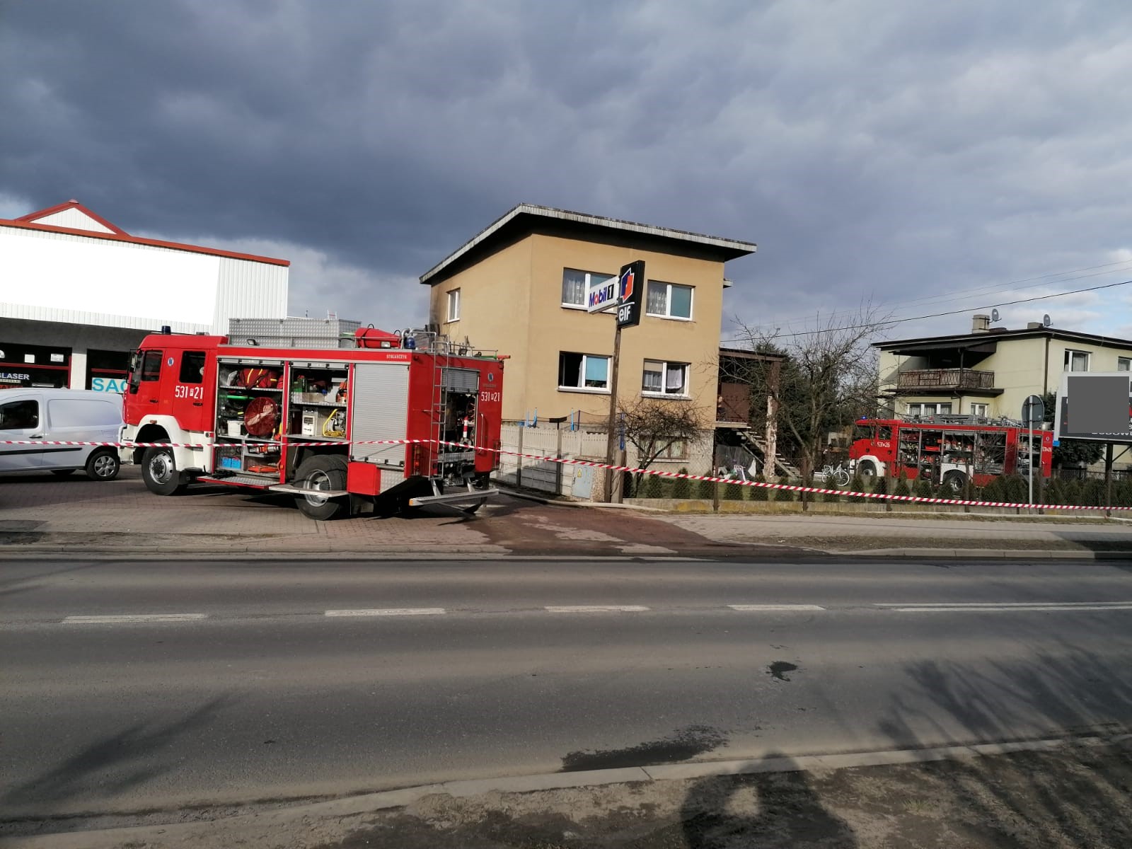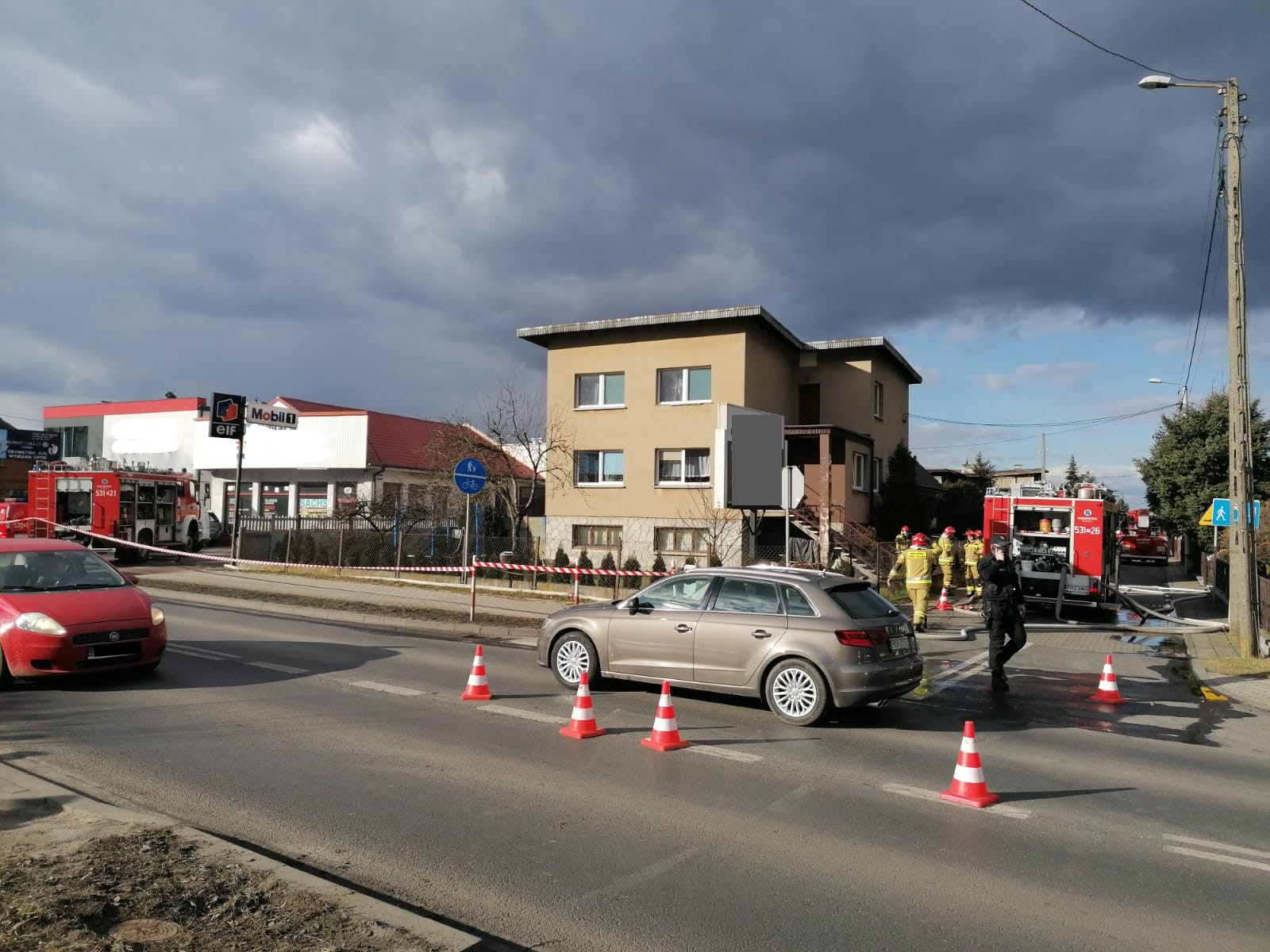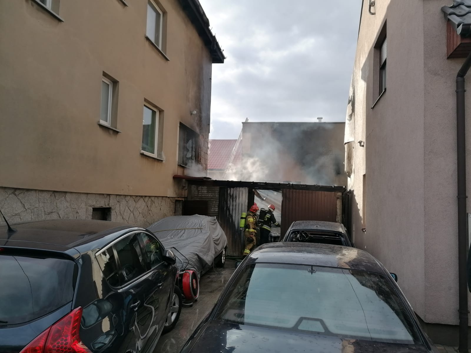 Na miejscu zdarzenia zastano objęty całkowicie pożarem garaż z pojazdem w środku, który zlokalizowany był bezpośrednio pomiędzy trzema innymi budynkami. Dodatkowo na podjeździe przed garażem znajdowało się kilka samochodów osobowych. Działania straży pożarnej polegały na zabezpieczeniu miejsca zdarzenia, podaniu jednego prądu wody w natarciu na palący się garaż oraz trzech prądów wody w obronie zagrożonych sąsiednich budynków. Jednocześnie strażacy ewakuowali z domu jednorodzinnego jedna osobę, która nie odniosła żadnych obrażeń - pozostali mieszkańcy i użytkownicy opuścili zagrożone budynki przed przybyciem zastępów straży pożarnej. Z uwagi na silne zadymienie, konieczna była praca w sprzęcie ochrony dróg oddechowych.