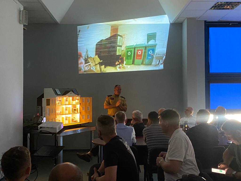 Spotkanie przeprowadzone przez funkcjonariuszy Wydziału kontrolno-rozpoznawczego miało na celu przede wszystkim przybliżenie zagadnień związanych z czynnościami odbiorowymi budynków. W przedstawionej prezentacji multimedialnej omówiono min. procedurę odbiorową prowadzoną przez organ PSP, techniczne zabezpieczenia przeciwpożarowe stosowane w obiektach budowlanych, oddzielenia/wydzielenia przeciwpożarowe, scenariusz pożarowy, drogi ewakuacyjne – przejście, a dojście ewakuacyjne, ekspertyzy techniczne, drogi pożarowe, zaopatrzenie w wodę do zewnętrznego gaszenia pożaru, a także usytuowanie budynku ze względu na bezpieczeństwo pożarowe.