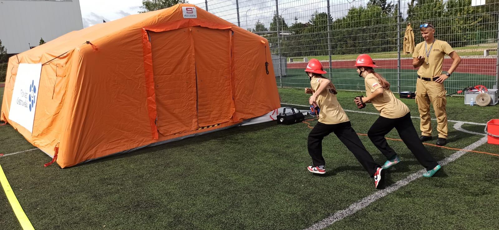 - odszukanie i ewakuacja osób poszkodowanych z obiektów, przy wykorzystaniu kamery termowizyjnej (zadanie symulowane poprzez zadymienie namiotu pneumatycznego, rolę osób poszkodowanych odgrywały maskotki),
