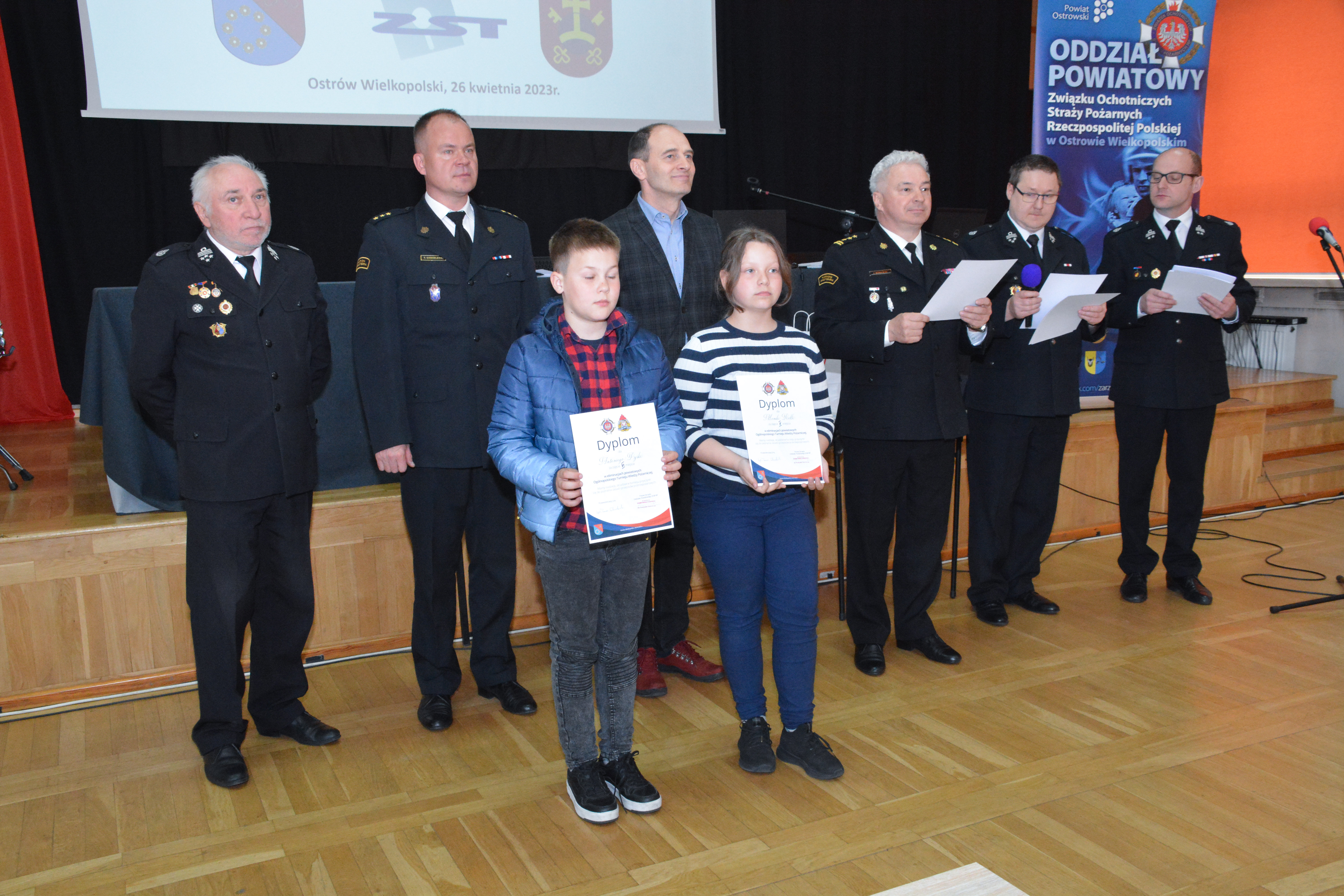 Nagrody oraz dyplomy wręczył Prezes Zarządu Oddziału Powiatowego ZOSP RP dh Przemysław Kaźmierczak wraz z Komendantem Powiatowym Państwowej Straży Pożarnej w Ostrowie Wielkopolskim st. bryg. Jackiem Wiśniewskim.
