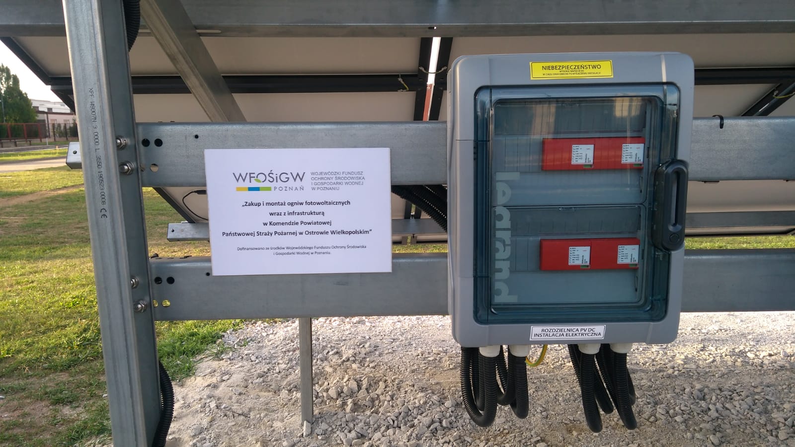 "Zakup i montaż ogniw fotowoltaicznych wraz z infrastrukturą w Komendzie Powiatowej Państwowej Straży Pożarnej w Ostrowie Wielkopolskim" dzięki wsparciu Wojewódzkiego Funduszu Ochrony Środowiska i Gospodarki Wodnej w Poznaniu zrealizowany został w miesiącu sierpniu . Instalacja składa się z 48 szt. modułów fotowoltaicznych zamontowanych na konstrukcji szkieletowej w gruncie o łącznej mocy wynoszącej 23,04 kWp. Wartość inwestycji wyniosła 110.454,00 zł. Jest to pierwszy etap budowy odnawialnych źródeł energii elektrycznej w KP PSP Ostrów Wielkopolski.