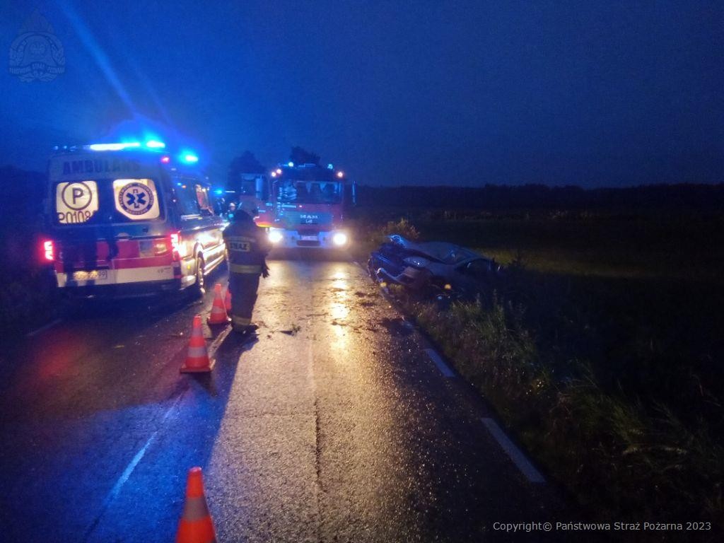 Na miejsce zdarzenia zadysponowano dwa zastępy z Jednostki Ratowniczo-Gaśniczej Ostrów Wielkopolski oraz zastęp OSP KSRG Tarchały Wielkie. Po przybyciu na miejsce stwierdzono wypadek samochodu osobowego na prostym odcinku drogi. Po przeprowadzonym rozpoznaniu ustalono, że w zdarzeniu udział brały dwie osoby. W momencie przybycia osoby poszkodowane znajdowały się przytomne poza pojazdem.