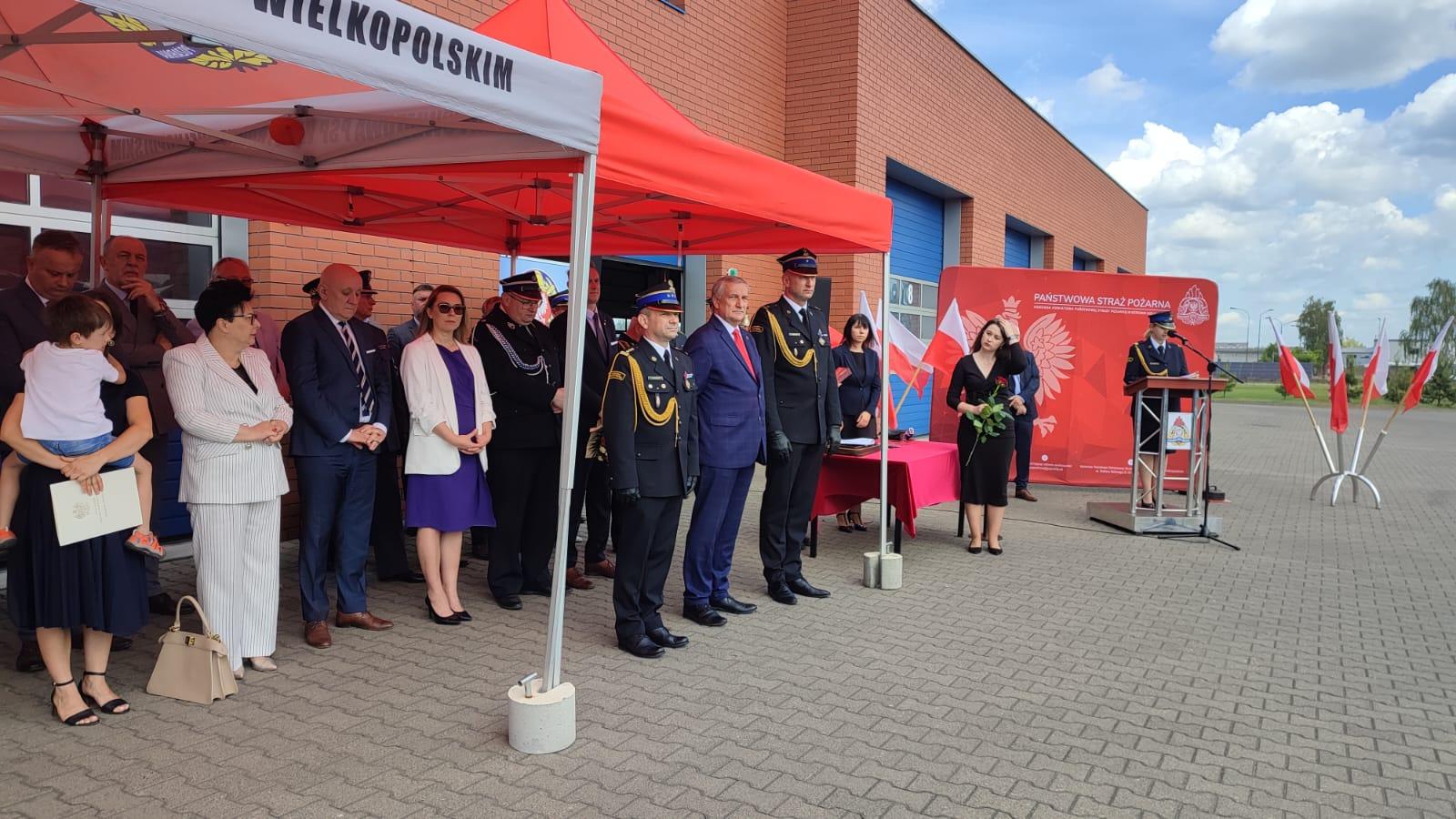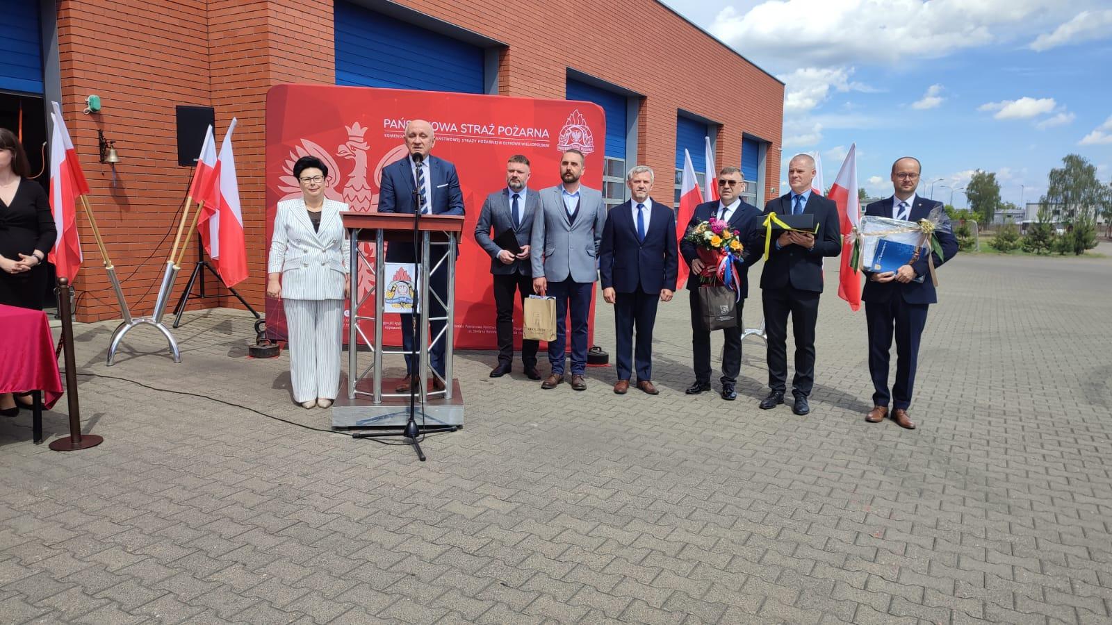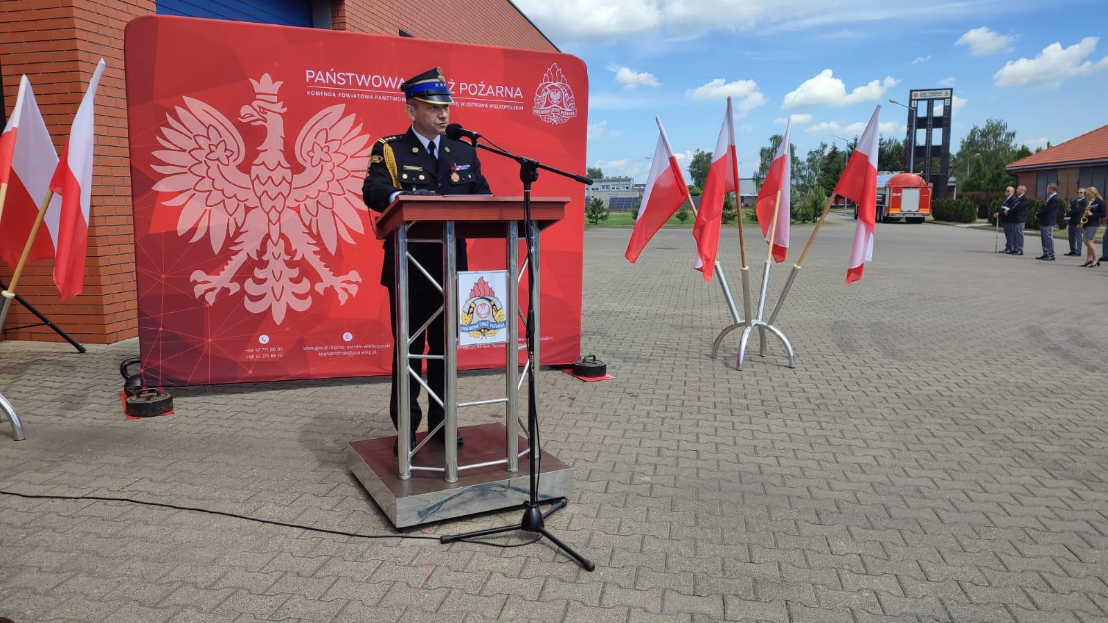 Przybyłych na uroczystość gości powitał mł. bryg. Łukasz Frątczak – Komendant Powiatowy PSP w Ostrowie Wielkopolskim, dziękując również wszystkim za uczestnictwo w tym szczególnym dla ostrowskich strażaków dniu.