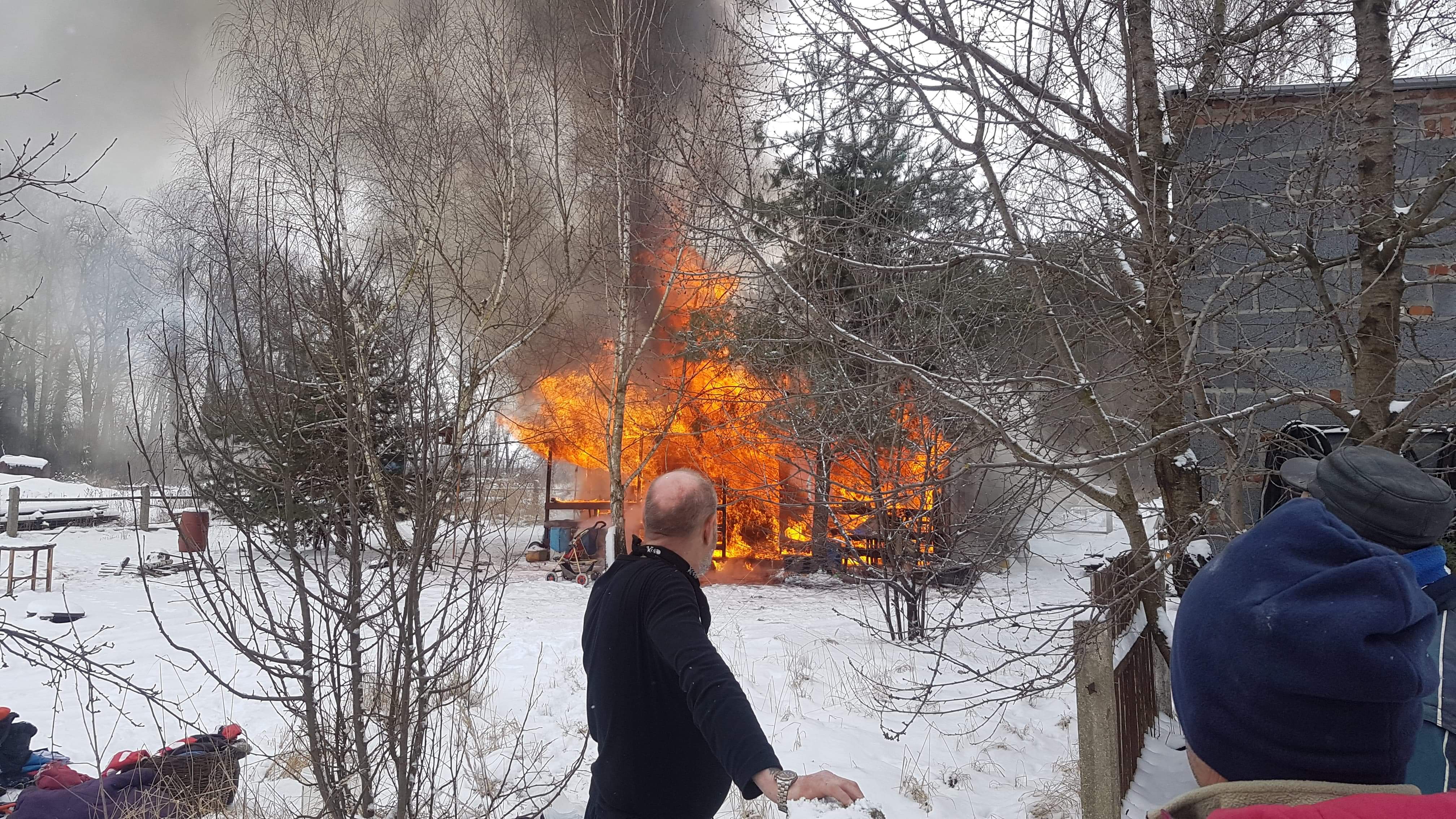 Przed przyjazdem straży pożarnej, użytkownik domku próbował sam ugasić pożar, w wyniku czego doznał niewielkich poparzeń. Strażacy udzieli mu na miejscu kwalifikowanej pierwszej pomocy, a następnie przekazali go przybyłemu na miejscie Zespołowi Ratownictwa Medycznego.