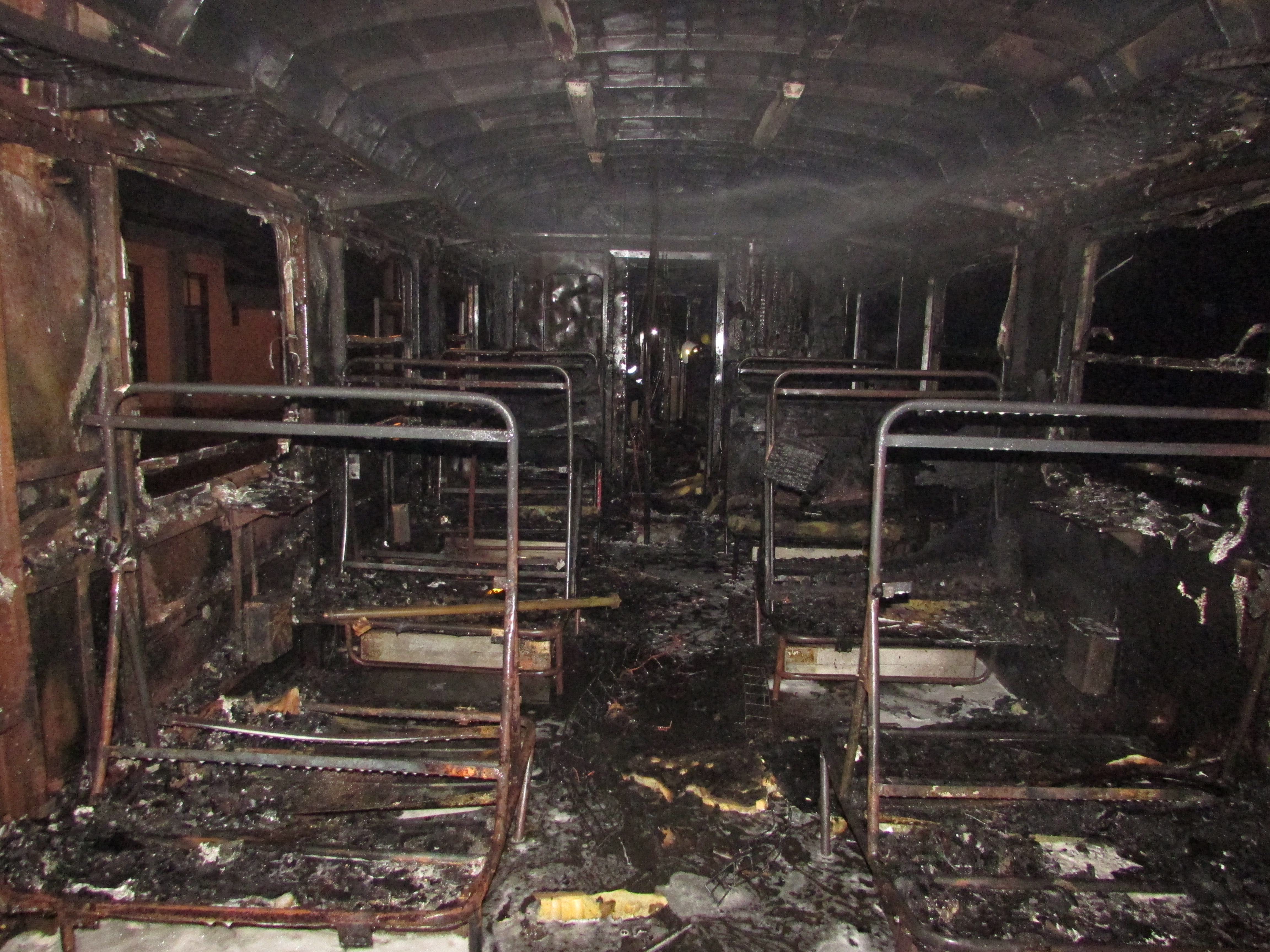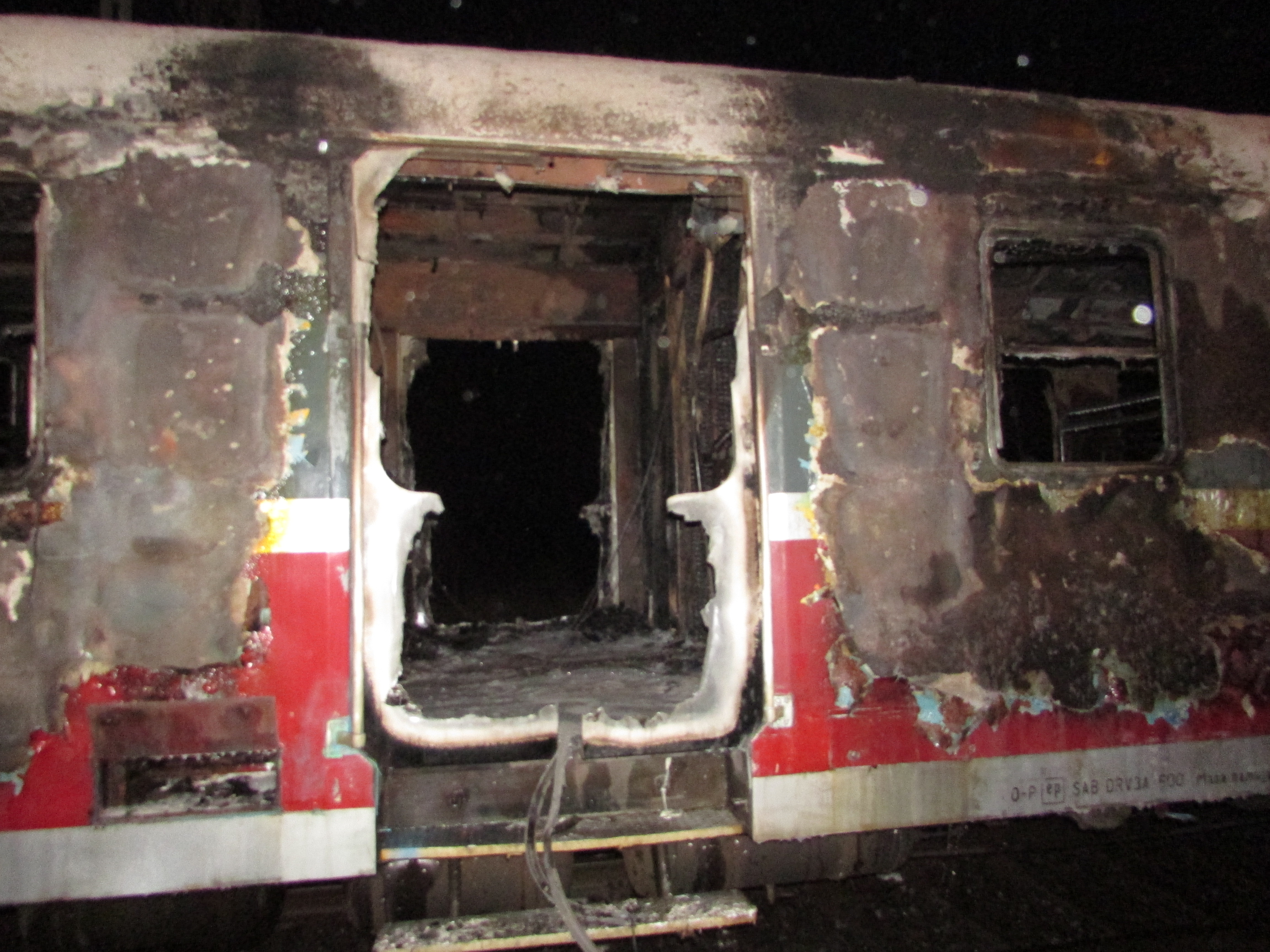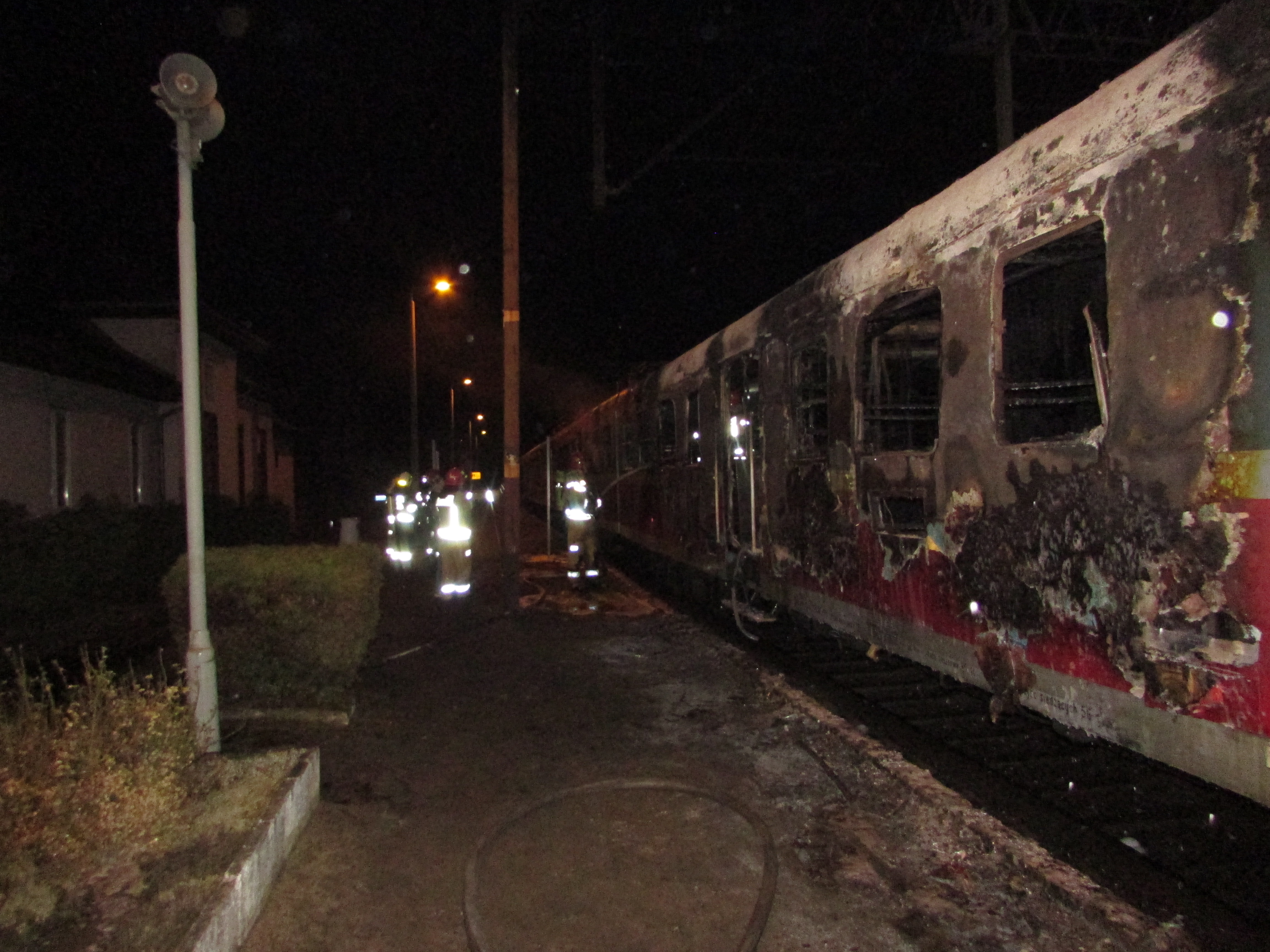 Działania strażaków, którzy ze względu na bardzo duże zadymienie musieli pracować w aparatach ochrony układu oddechowego, polegały na zabezpieczeniu miejsca zdarzenia oraz przeszukaniu składu pociągu z jednoczesnym podaniem prądów gaśniczych piany ciężkiej w natarciu na objęte pożarem wnętrze pociągu. W wyniku przeprowadzonego rozpoznania nie stwierdzono osób poszkodowanych wewnątrz.