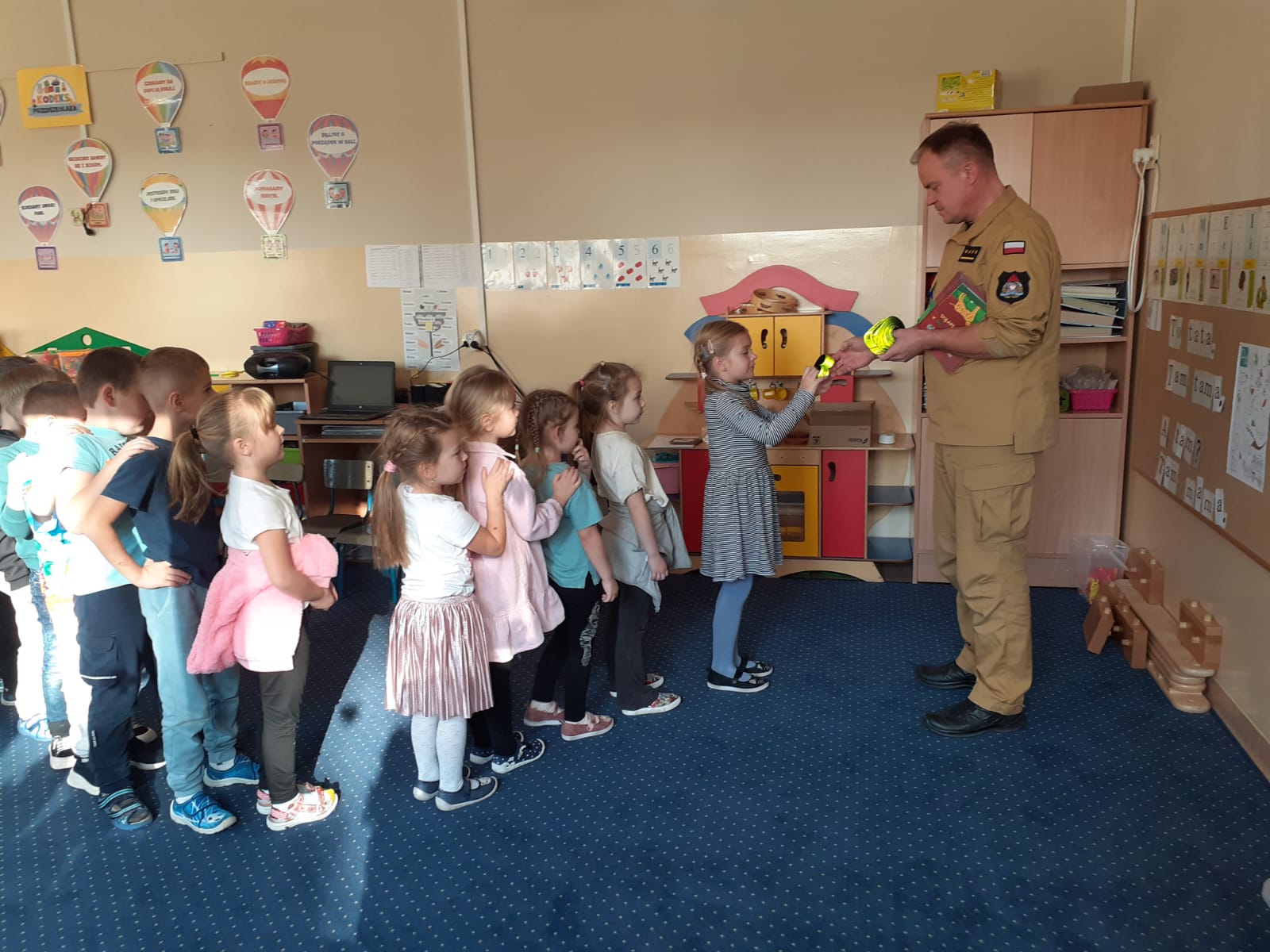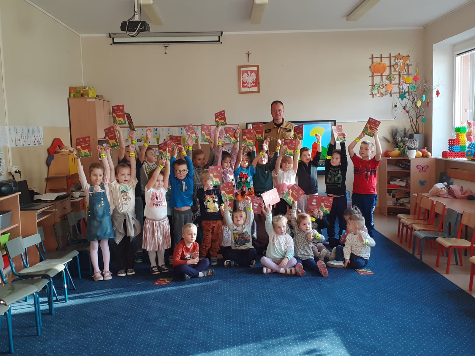 W ramach projektu pn. „Podnoszenie świadomości ekologicznej społeczeństwa poprzez zakup sprzętu i produkcję filmów do celów edukacji ekologicznej `dla Komendy Powiatowej Państwowej Straży Pożarnej w Ostrowie Wielkopolskim” wspartego między innymi przez Wojewódzki Fundusz Ochrony Środowiska i Gospodarki Wodnej w Poznaniu pozyskano kolorowanki z bohaterką filmików żyrafą Florką oraz opaski odblaskowe, które to rozdano uczestniczącym w spotkaniu maluchom.