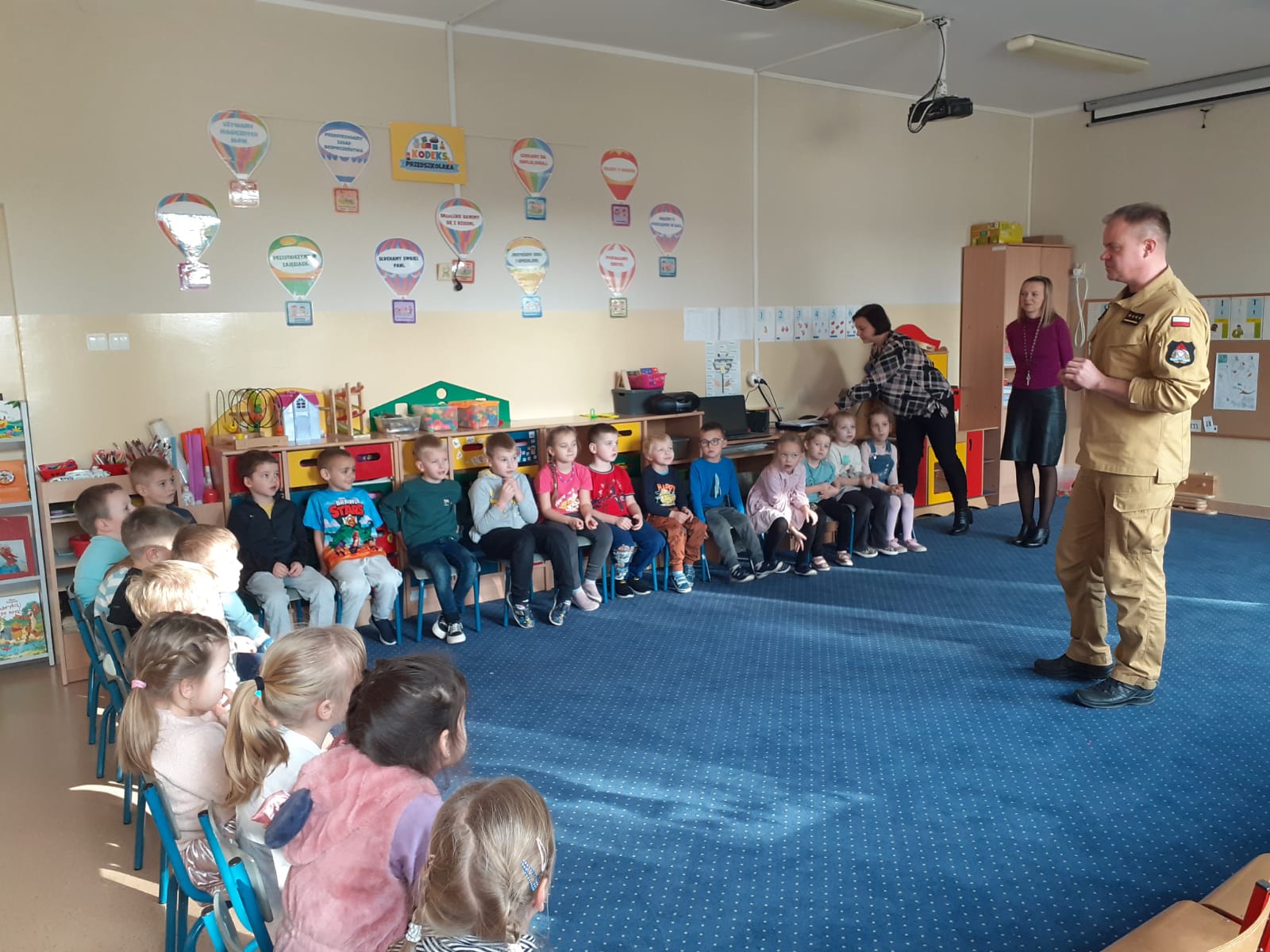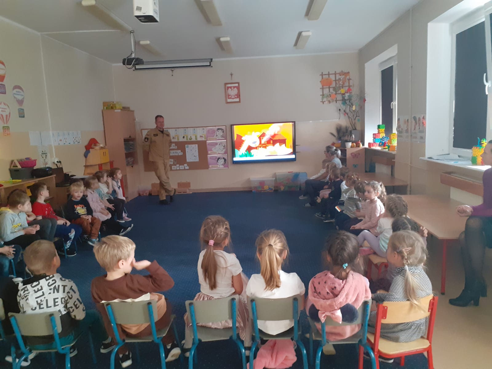 Głównym tematem spotkania było przybliżenie przedszkolakom pracy strażaków. Przedstawiono również sprzęt, pojazdy i wyposażenie osobiste jakim dysponują ostrowscy strażacy. W trakcie pogadanki poruszono również tematykę związaną z podniesieniem świadomości ekologicznej mającej na celu ograniczenie do minimum możliwości wystąpienia pożarów. W tym celu dzieci miały okazję obejrzeć filmy edukacyjne dotyczące zagrożeń czyhających na nie w domu, a także na terenie zielonym. Przedszkolakom bardzo spodobała się główna bohaterka projekcji – żyrafa Florka.