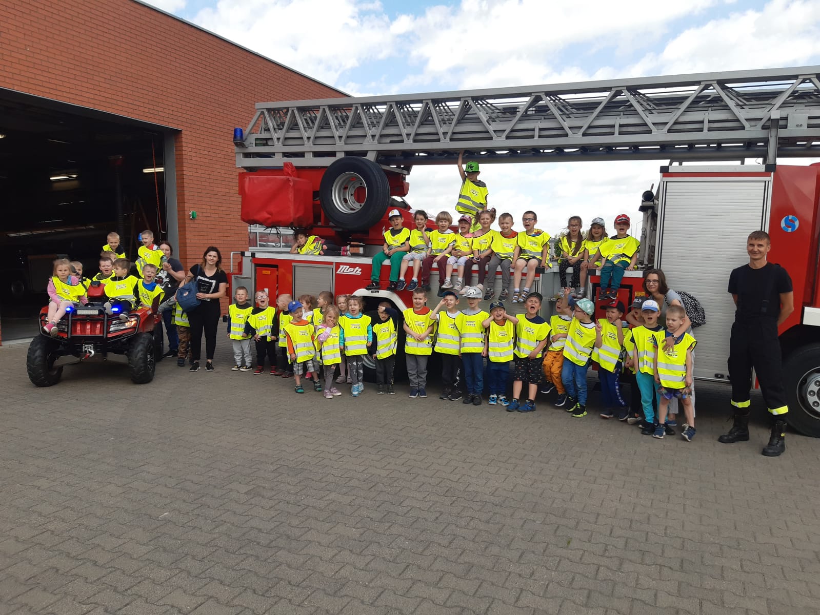 Podczas zorganizowanej wycieczki do Komendy Powiatowej Państwowej Straży Pożarnej w Ostrowie Wielkopolskim, dzieci miały okazję spotkać się ze strażakami zapoznać się z ich pracą, a także obejrzeć pojazdy i sprzęt pożarniczy. Podczas spotkania przedstawiono również informacje na temat bezpiecznego zachowania się podczas wystąpienia niebezpieczeństwa. Taka forma edukacji pozwala dzieciom na łatwiejsze zrozumienie tematyki dotyczącej zagrożeń, które mogą wystąpić w codziennym życiu. W dzisiejszych zajęciach udział wzięło 42 dzieci i 4 wychowawców, dziękujemy i zapraszamy ponownie.