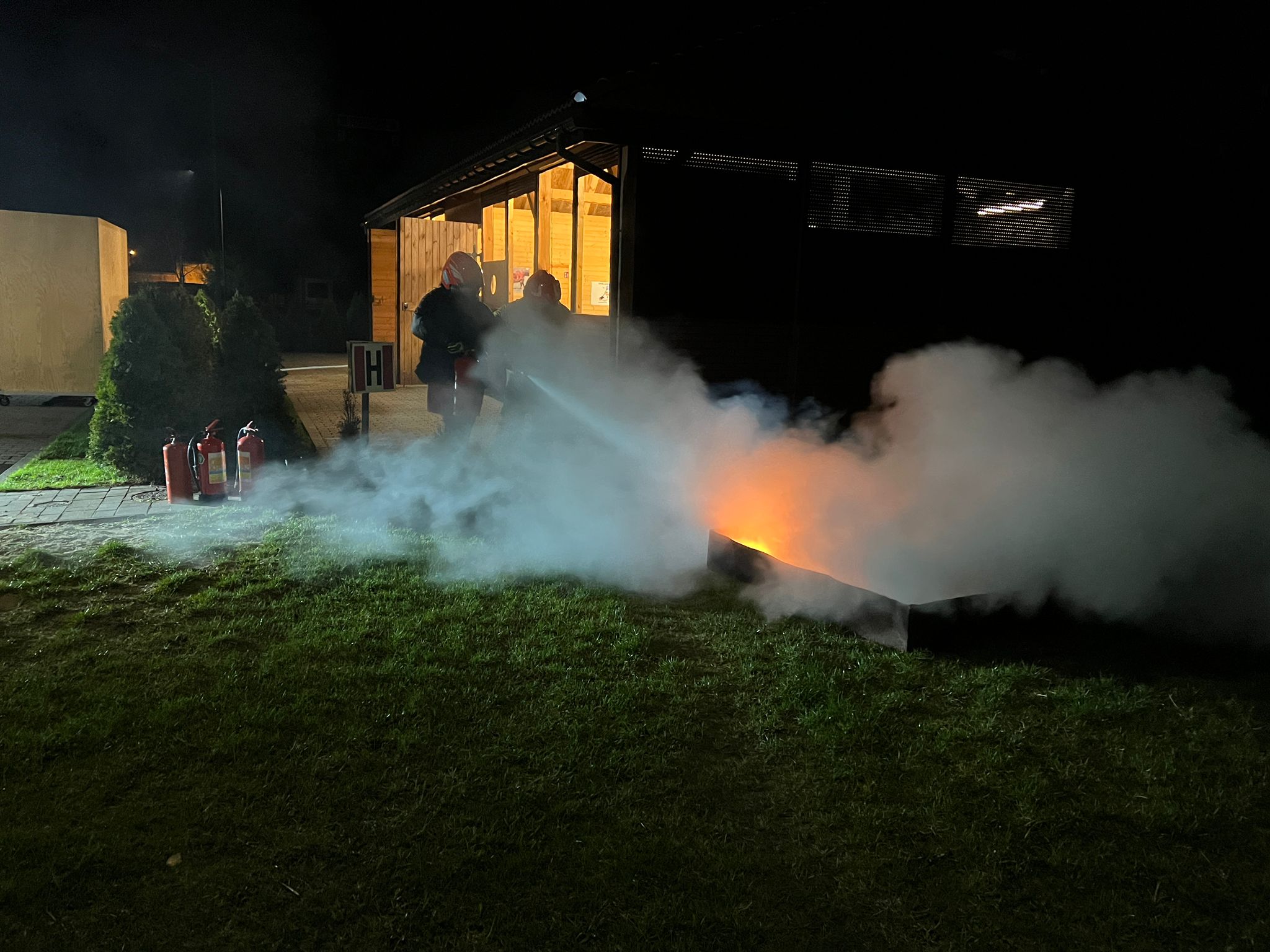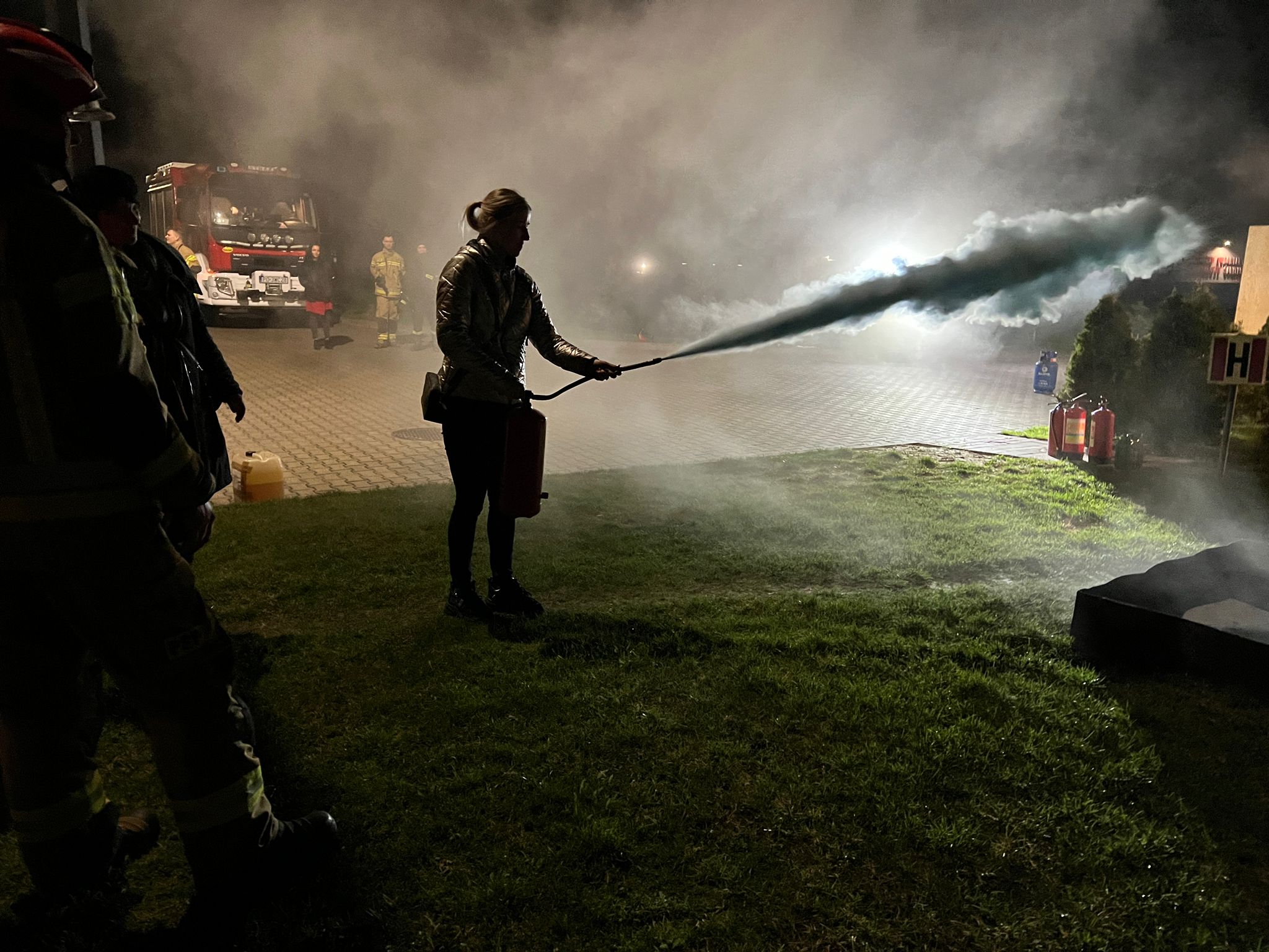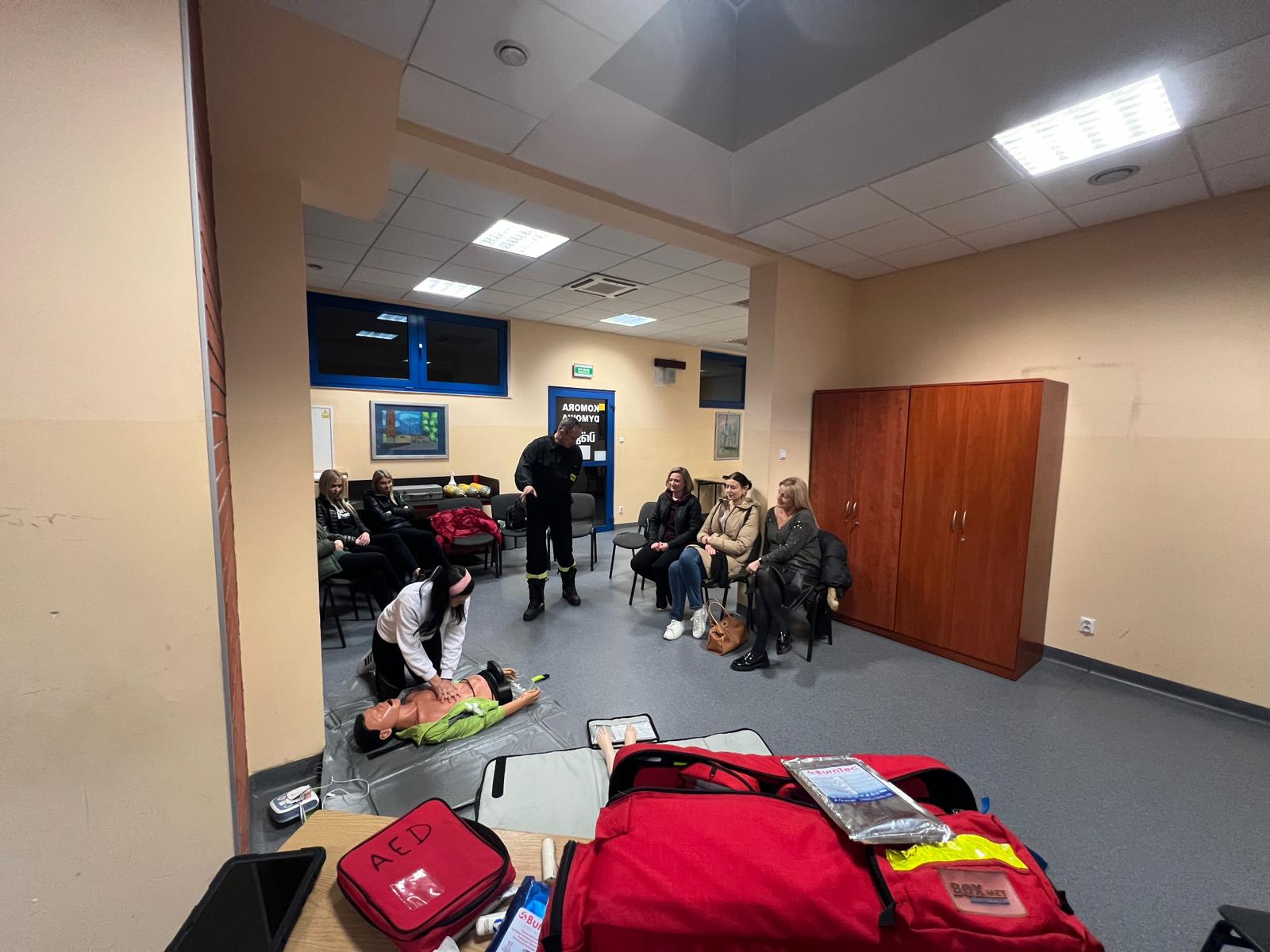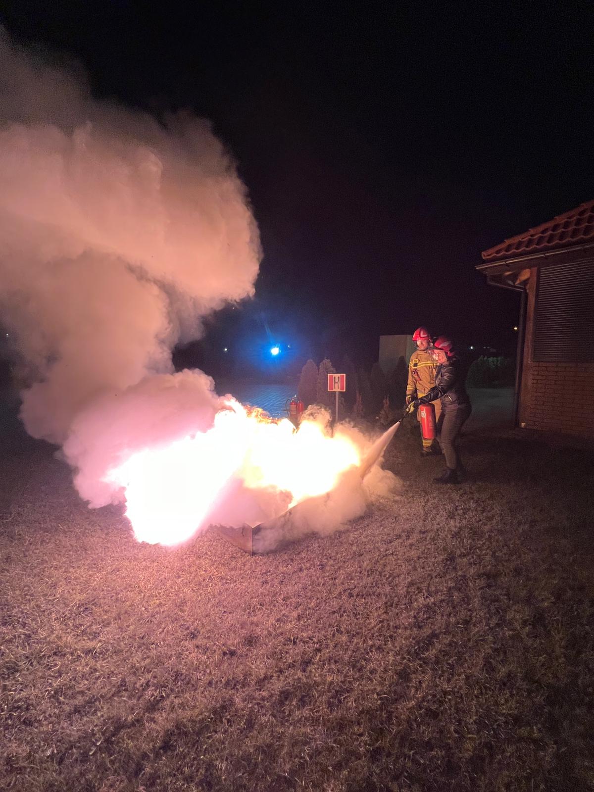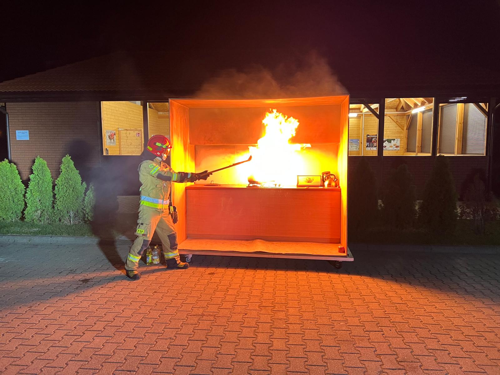 Omówiono również temat udzielenia pierwszej pomocy osobom poszkodowanym w zdarzeniach drogowych oraz prowadzenie resuscytacji krążeniowo-oddechowej u osób z nagłym zatrzymaniem krążenia. Przybyłe na spotkanie panie miały także okazję praktycznego użycia gaśnicy proszkowej gasząc palącą się ciecz ropopochodną. Strażacy zainscenizowani też symulowany pożar butli z gazem oraz oleju na specjalnie do tego celu wykonanej makiecie domowej kuchni.
