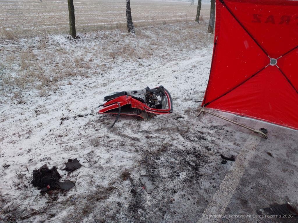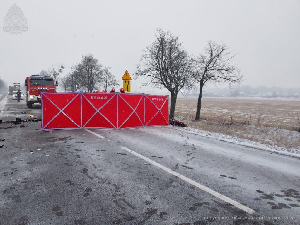 Po przybyciu pierwszych zastępów na miejsce zdarzenia stwierdzono zderzenie samochodu osobowego oraz ciężarówki na odcinku drogi krajowej nr 11. Ze względu na znaczne uszkodzenia karoserii samochodu osobowego, strażacy zmuszeni byli do użycia narzędzi hydraulicznych w celu wydobycia osoby poszkodowanej z rozbitego pojazdu. Niestety, zespół ratownictwa medycznego, który przybył na miejsce, stwierdził zgon mężczyzny w wieku około 50 lat.