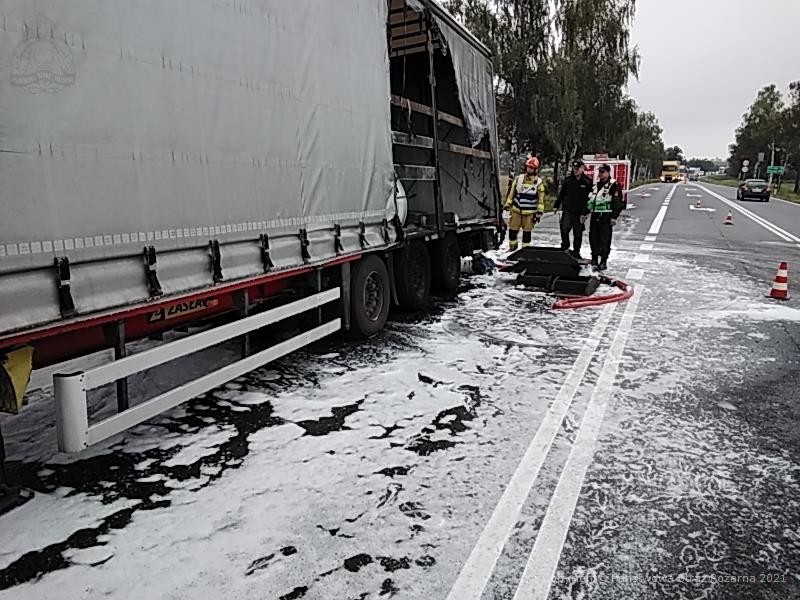 Przewożony ładunek nie stanowił dodatkowego zagrożenia, w naczepie znajdowały się trzy kręgi blachy, kierowca w celu ograniczenia zagrożenia i strat odczepił ciągnik siodłowy od naczepy i odjechał na bezpieczną odległość. Ruch na drodze krajowej na czas prowadzonych działań, był całkowicie zablokowany. Działania SP polegały na zabezpieczeniu miejsca zdarzenia oraz podaniu dwóch prądu piany w natarciu na palącą się naczepę. Po ugaszeniu pożaru, naczepę sprawdzono kamerą termowizyjną. Działania były długotrwałe i spowodowane były oczekiwaniem na przyjazd ciężkiego sprzętu potrzebnego do przeładowania przewożonego ładunku..