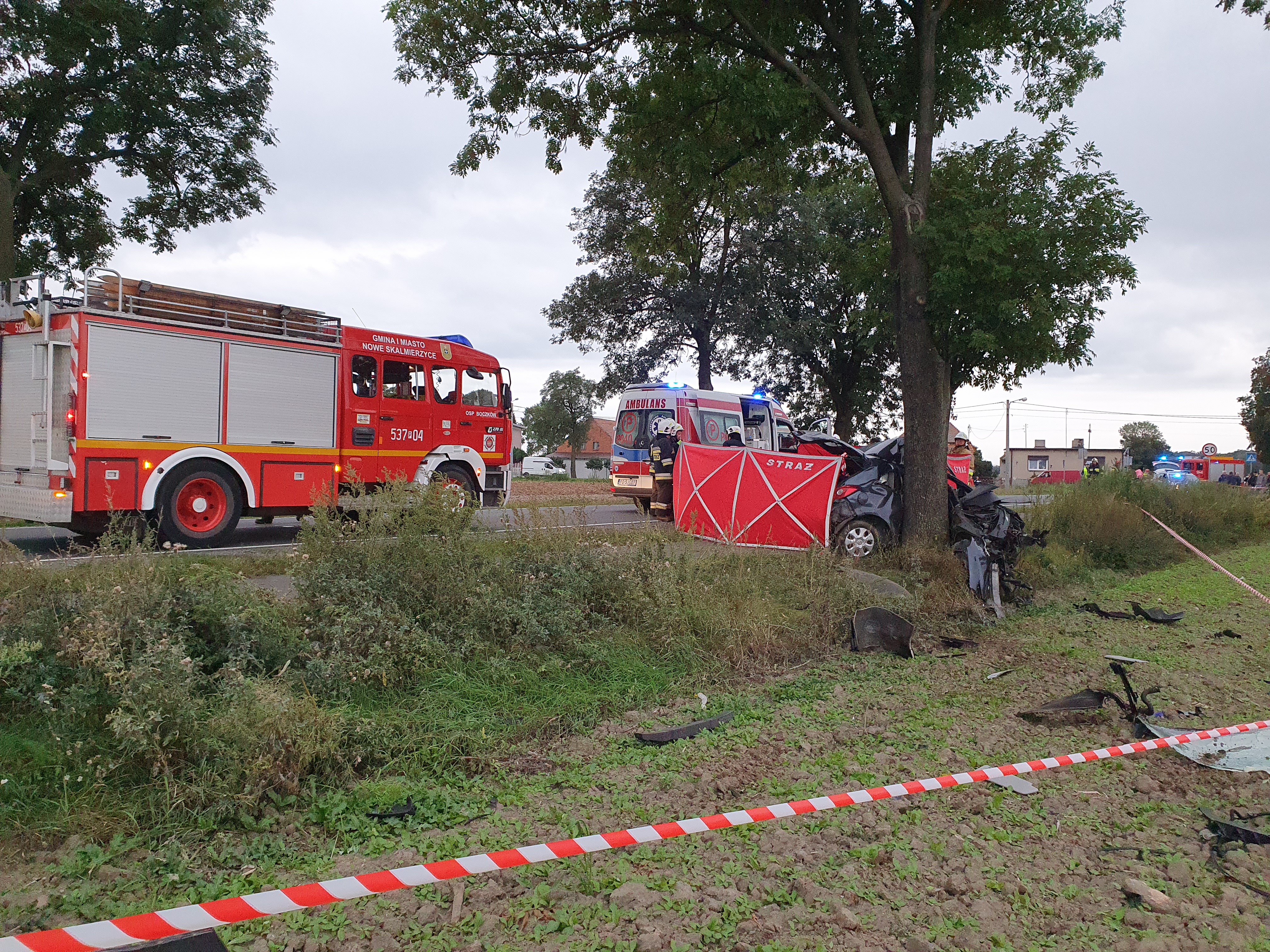 Po przybyciu na miejsce zdarzenia JOP zastano zderzenie samochodu osobowego z drzewem na prostym odcinku drogi. W pojeździe znajdował się uwięziony kierowca, który podróżował sam. Na miejscu zdarzenia obecny był ZRM, który sprawdzał funkcje życiowe poszkodowanego. Działania SP polegały na zabezpieczeniu miejsca zdarzenia oraz uwolnieniu poszkodowanego przy użyciu sprzętu hydraulicznego i przekazaniu go ZRM. Zespół medyczny stwierdził zgon kierowcy pojazdu. Dalsze działania polegały na oświetleniu terenu akcji na potrzeby prac dochodzeniowo-śledczych Policji. Następnie przystąpiono do usunięcia pozostałości po wcześniejszym wypadku.