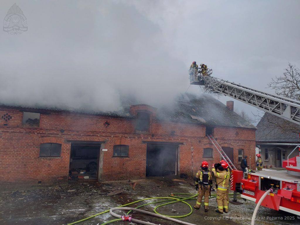 Pożarem została objęta cała powierzchnia dachu budynku gospodarczego. Działania gaśnicze utrudniała duża ilość materiału palnego wewnątrz budynku. W wyniku prowadzonego przeszukania zadymionego obiektu strażacy znaleźli ofiarę śmiertelną pożaru – 29-letniego mężczyznę.
