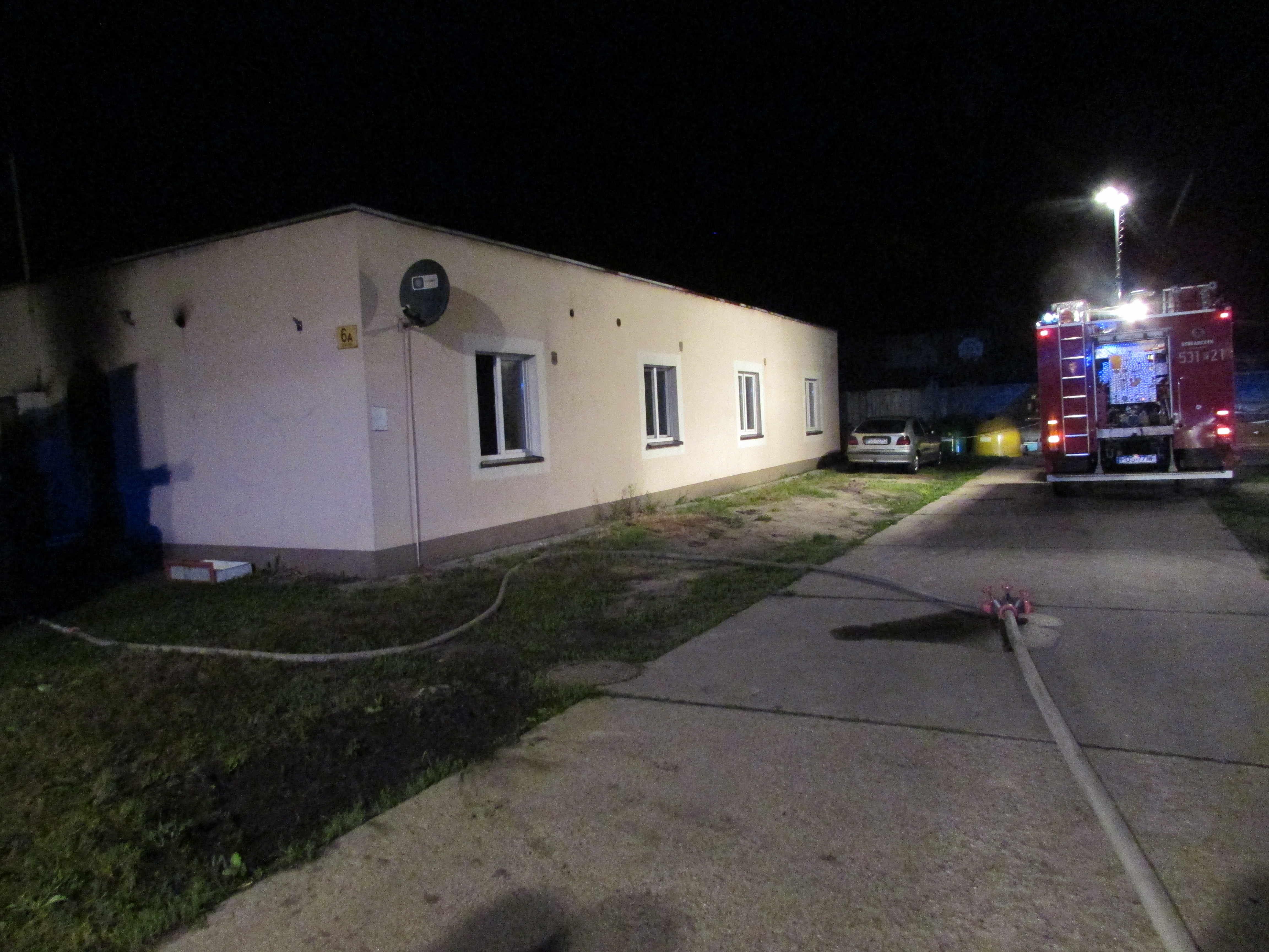 W chwili przybycia na miejsce zdarzenia pierwszych zastępów straży pożarnej zostało przeprowadzone rozpoznanie, w wyniku którego ustalono, że pożarem objęte jest całkowicie jedno z mieszkań w budynku jednokondygnacyjnym. Działania strażaków, którzy ze względu na bardzo duże zadymienie i wysoką temperaturę musieli pracować w aparatach ochrony układu oddechowego, polegały na zabezpieczeniu miejsca zdarzenia oraz przeszukaniu mieszkania z jednoczesnym podaniem dwóch prądów gaśniczych wody w natarciu na objęte pożarem wyposażenie wnętrza lokalu. W trakcie prowadzenia działań ratownicy natrafili na zwęglone ciała dwóch osób. Przybyły na miejsce zdarzenia lekarz mógł jedynie stwierdzić zgon poszkodowanych lokatorów.