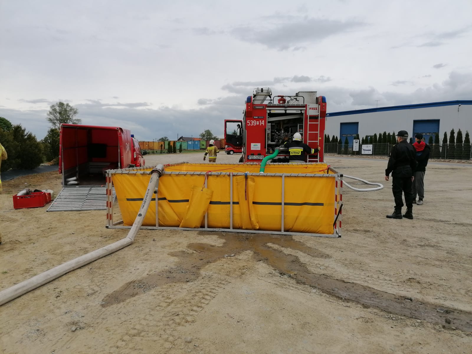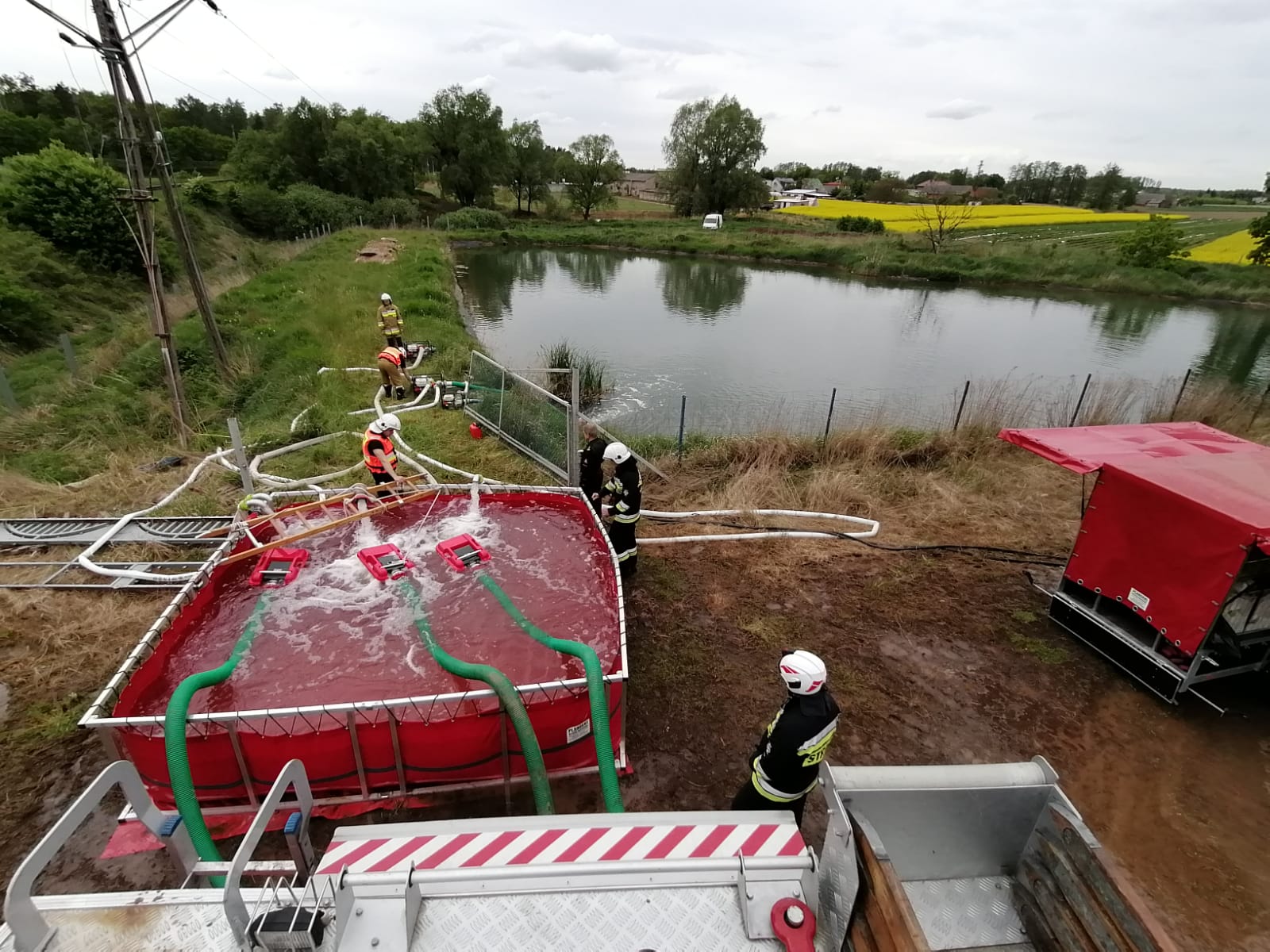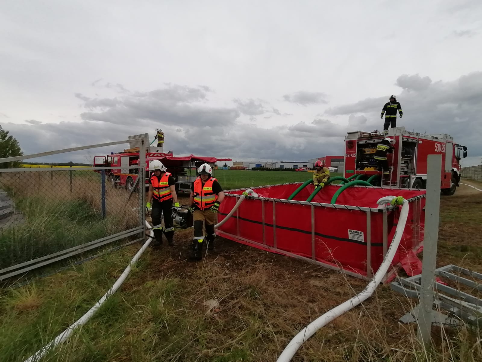 Kolejnym elementem warsztatów były praktyczne ćwiczenia, przy wykorzystaniu jednostek tworzących pluton wsparcia w ramach odwodów operacyjnych. Głównym celem przyjętych założeń do ćwiczeń było doskonalenie umiejętności w zakresie przetłaczania wody na duże odległości. Przyjęty scenariusz ćwiczeń zakładał budowę magistrali wodnej o długości ok. 500 metrów z wykorzystaniem zasobów wodnych pobliskiego stawu, osiągniecie przyjętego wydatku końcowego na liniach gaśniczych oraz zapewnienie ciągłości podawania wody przez określony czas.