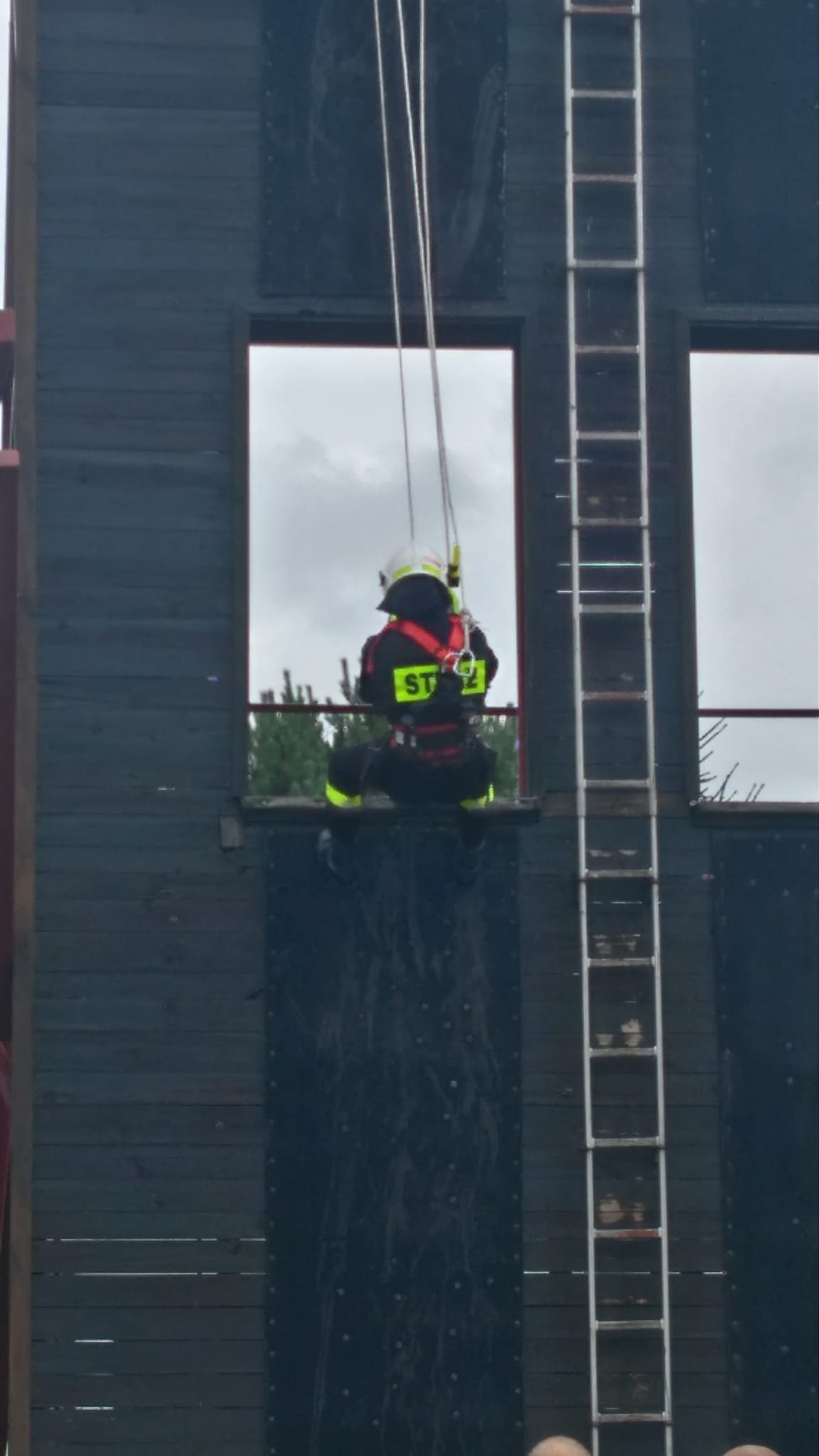 - dotarcie ratownika na wysokość z wykorzystaniem drabin pożarniczych,