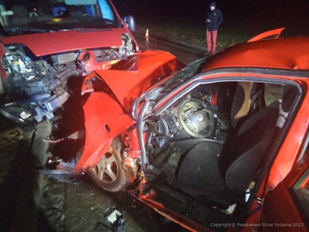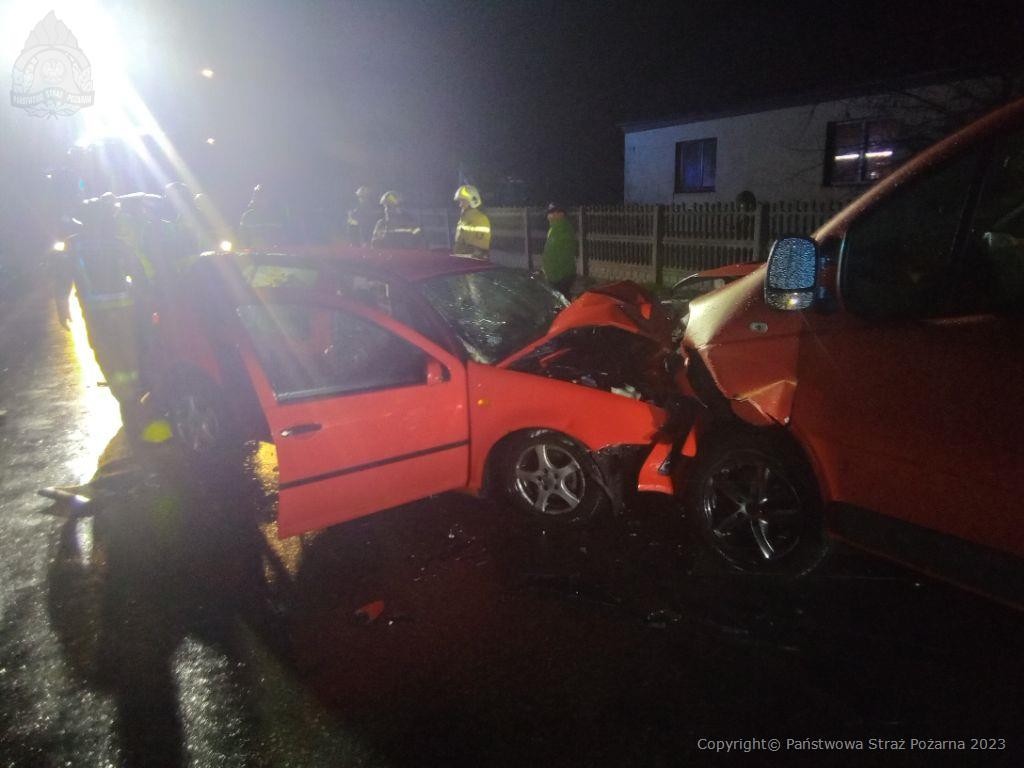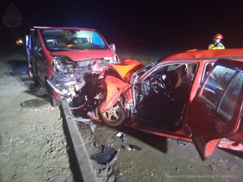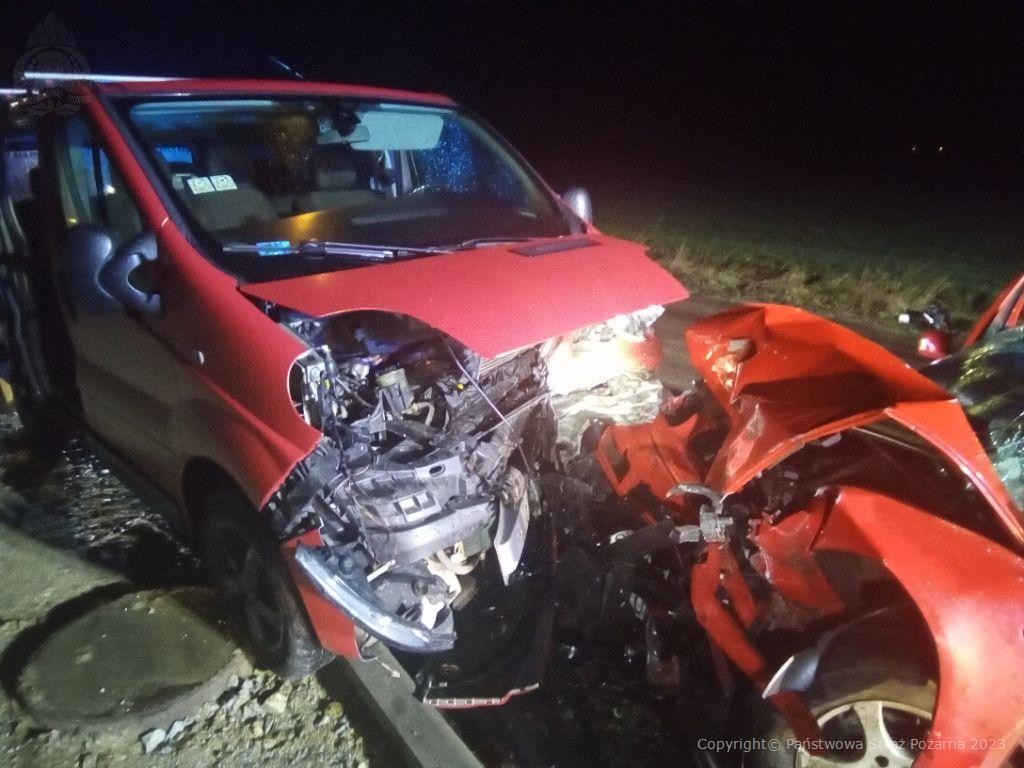 Na miejsce zdarzenia zadysponowano trzy zastępy PSP oraz dwa zastępy OSP. Po przybyciu pierwszych zastępów stwierdzono zderzenie samochodu osobowego z busem na prostym odcinku drogi powiatowej. W momencie przybycia pięć osób uczestniczących w zdarzeniu znajdowało się poza pojazdami, a jeden poszkodowany, nieprzytomny kierowca samochodu osobowego znajdował się we wraku.