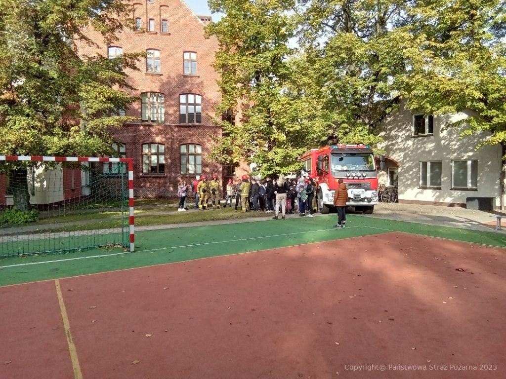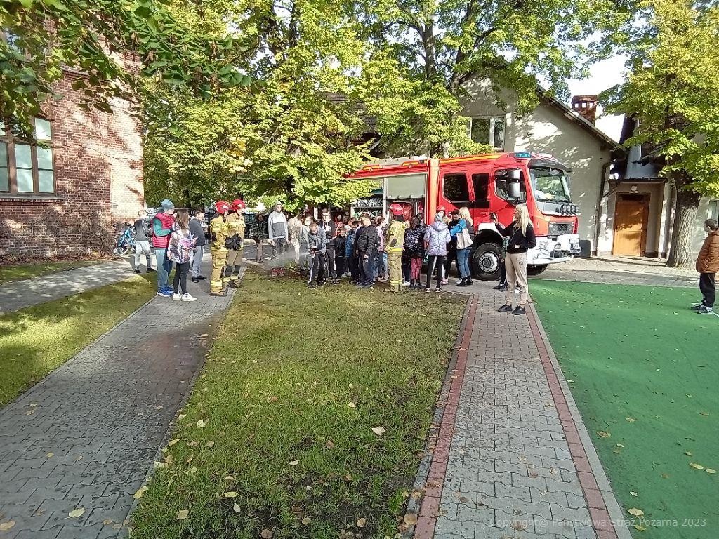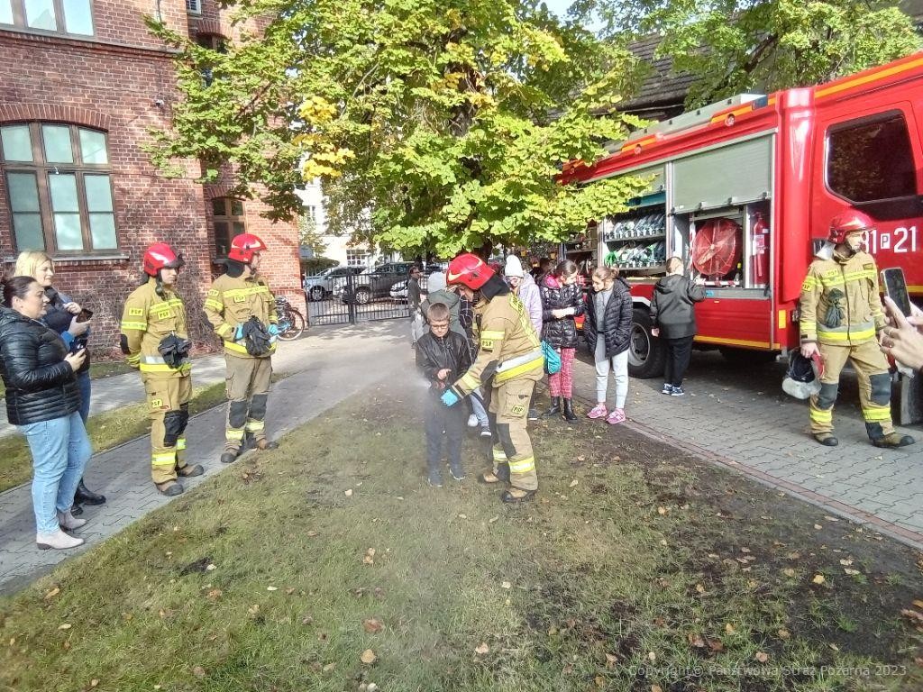 Około godziny 10.00 został uruchomiony alarm zapowiadający ewakuację szkoły. Dzieci pod opieką opiekunów i nadzorem Pani Dyrektor sprawnie opuściły pomieszczenia szkoły i zebrały się na boisku szkolnym. Następnie strażacy opowiedzieli dzieciom po co w ogóle przeprowadzane są tego typu ćwiczenia, jak ważnym aspektem jest sprawna ewakuacja z pomieszczeń objętych zagrożeniem. Korzystając z okazji i na prośbę dzieci i opiekunów została przedstawiona pokrótce praca strażaków, jakie czynności strażacy wykonują w trakcie działań ratowniczo-gaśniczych podczas zdarzeń wymagających ich udziału. Zaprezentowano również wóz strażacki, a każde z dzieci miało możliwość spróbowania swoich sił podczas gaszenia pożaru ze strażackiej „sikawki”.