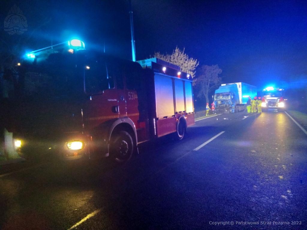 Na miejsce zdarzenia zadysponowano trzy zastępy PSP oraz dwa zastępy OSP KSRG. Po przybyciu pierwszych zastępów stwierdzono, że samochód ciężarowy najechał na tył poprzedzającego pojazdu, również samochodu ciężarowego. W wyniku zdarzenia poszkodowany został jeden z kierowców. Na czas prowadzenia działań droga krajowa była całkowicie zablokowana. Działania SP polegały na zabezpieczeniu miejsca zdarzenia, udzieleniu kwalifikowanej pierwszej pomocy osobie poszkodowanej oraz przekazaniu jej przybyłemu Zespołowi Ratownictwa Medycznego. Dalsze działania SP polegały na zabezpieczeniu pojazdów oraz usunięciu pozostałości powypadkowych z jezdni.