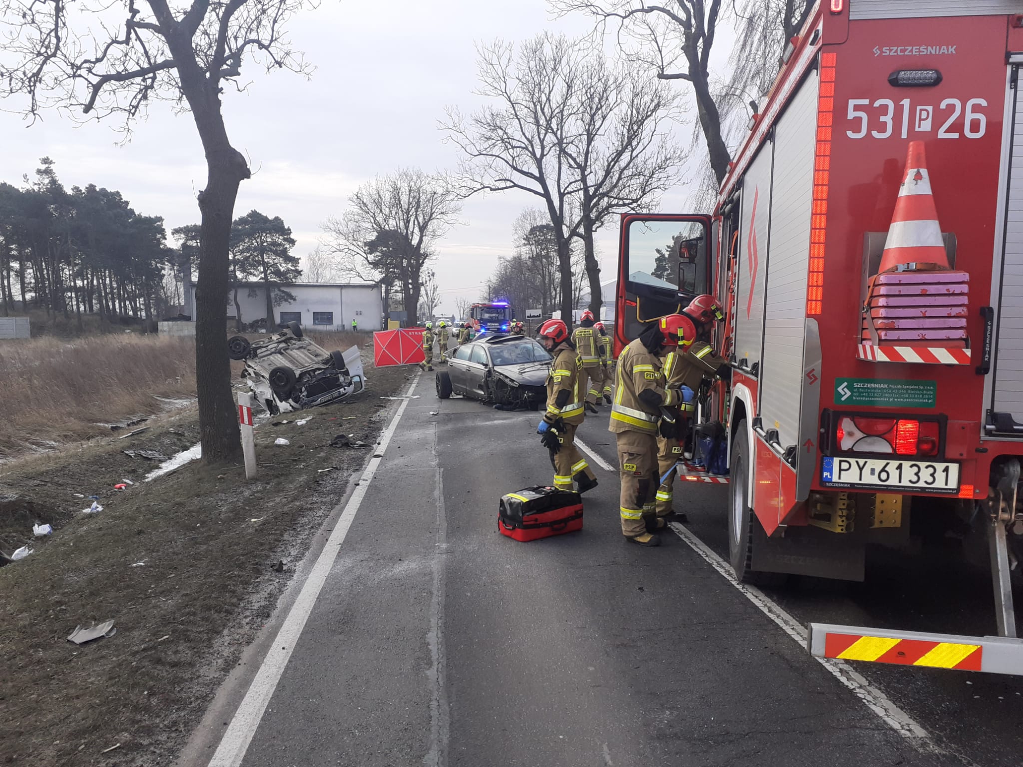 Działania SP polegały na zabezpieczeniu miejsca zdarzenia oraz udzieleniu kwalifikowanej pierwszej pomocy poszkodowanym osobom. Niestety przybyły na miejsce zdarzenia lekarz ZRM stwierdził zgon 29-letniego uczestnika zdarzenia. Pozostałe osoby poszkodowane uczestniczące w zdarzeniu zostały zabrane do szpitala. Na czas prowadzenia działań droga wojewódzka DW445 była całkowicie zablokowana w obu kierunkach.