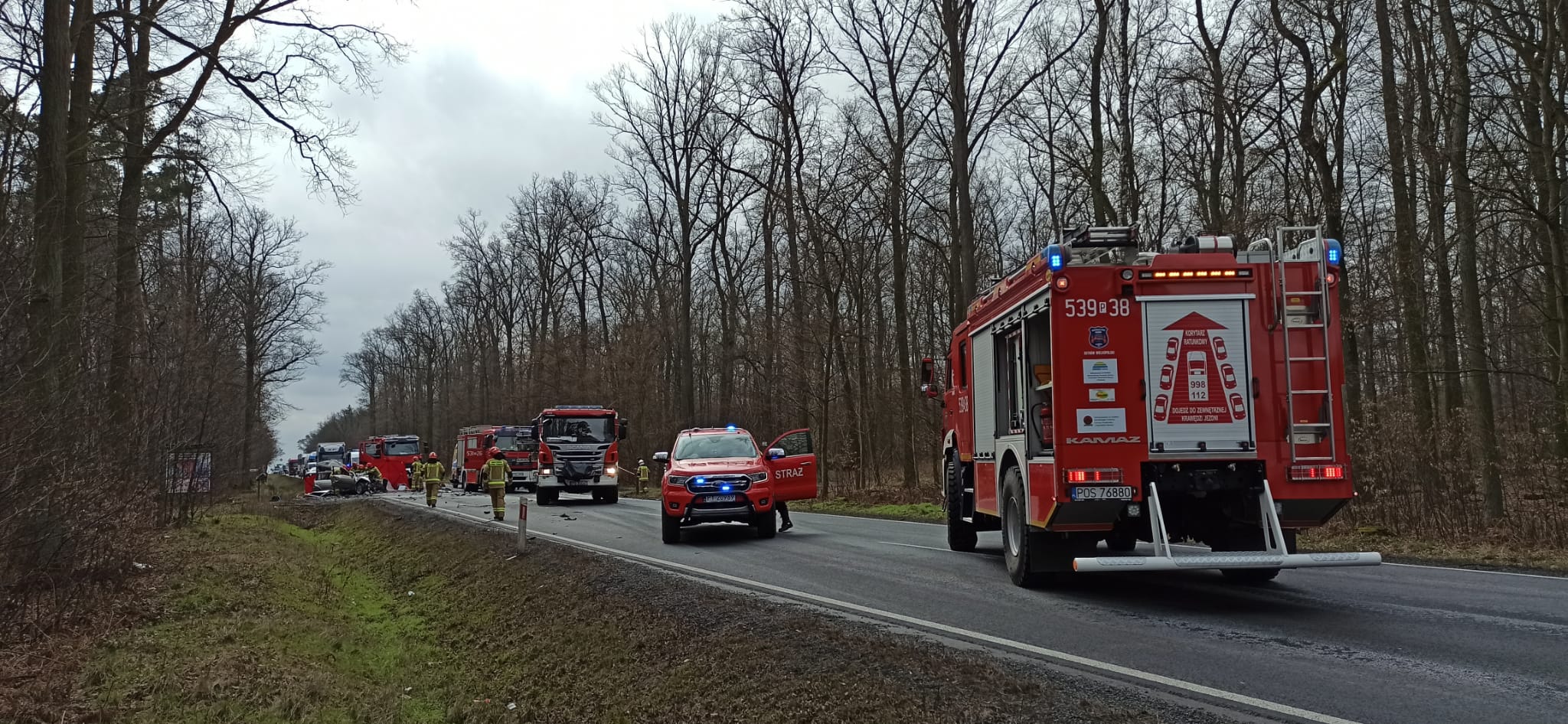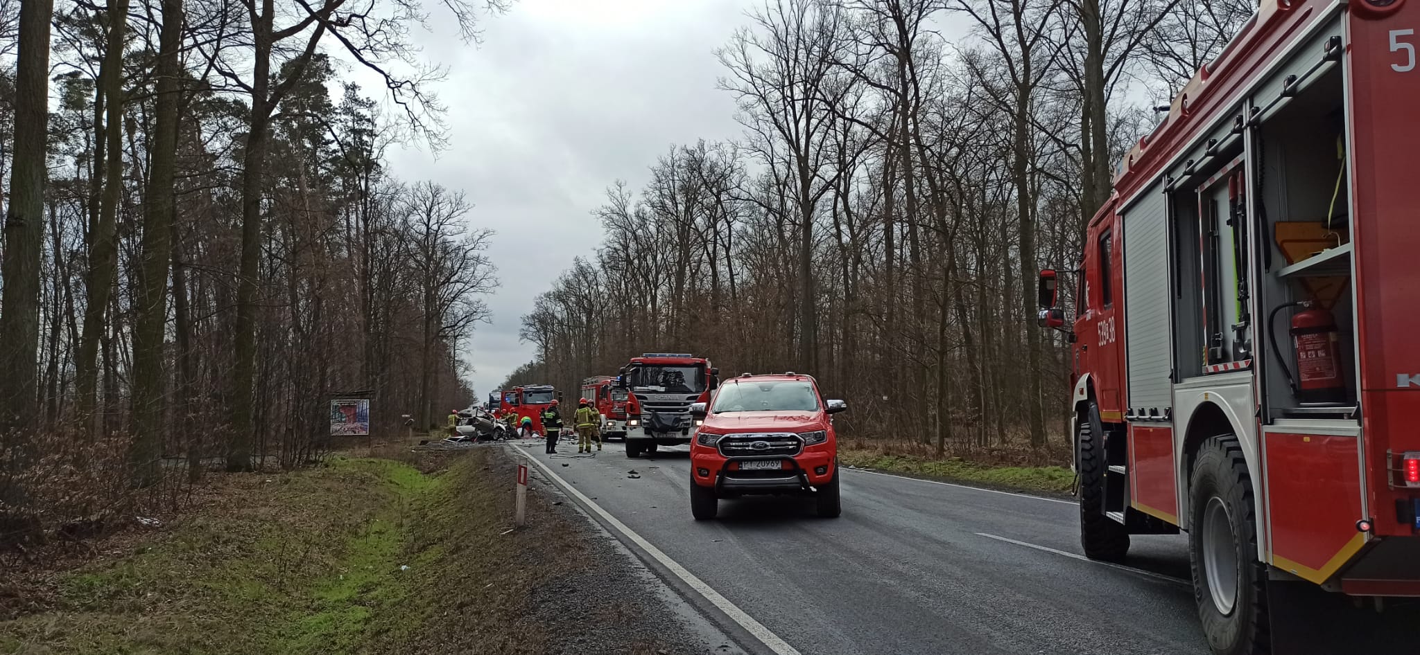 Na miejsce zdarzenia zadysponowano pięć zastępów PSP oraz jeden zastęp OSP. Po przybyciu pierwszych zastępów stwierdzono zderzenie samochodu osobowego z samochodem ciężarowym na prostym odcinku drogi. W momencie przybycia kierujący pojazdem ciężarowym znajdował się poza pojazdem. W wyniku zdarzenia trzy poszkodowane, nieprzytomne osoby znajdowały się we wraku pojazdu osobowego. Działania SP polegały na zabezpieczeniu miejsca zdarzenia oraz, ze względu na mocno zniekształcone elementy karoserii, wykonaniu dostępu do osób poszkodowanych przy użyciu sprzętu hydraulicznego. Niestety przybyły na miejsce zdarzenia lekarz stwierdził zgon dwóch osób – mężczyzny oraz dziecka. Poszkodowana kobieta po przekazaniu Zespołowi Ratownictwa Medycznego została zabrana do szpitala.