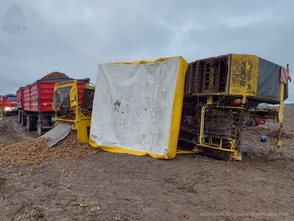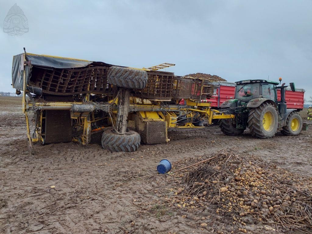 17 listopada 2025 r. w godzinach porannych Stanowisko Kierowania Komendanta Powiatowego PSP w Ostrowie Wielkopolskim otrzymało zgłoszenie dotyczące przewrócenia się kombajnu do zbioru ziemniaków podczas prac polowych w miejscowości Sobótka.