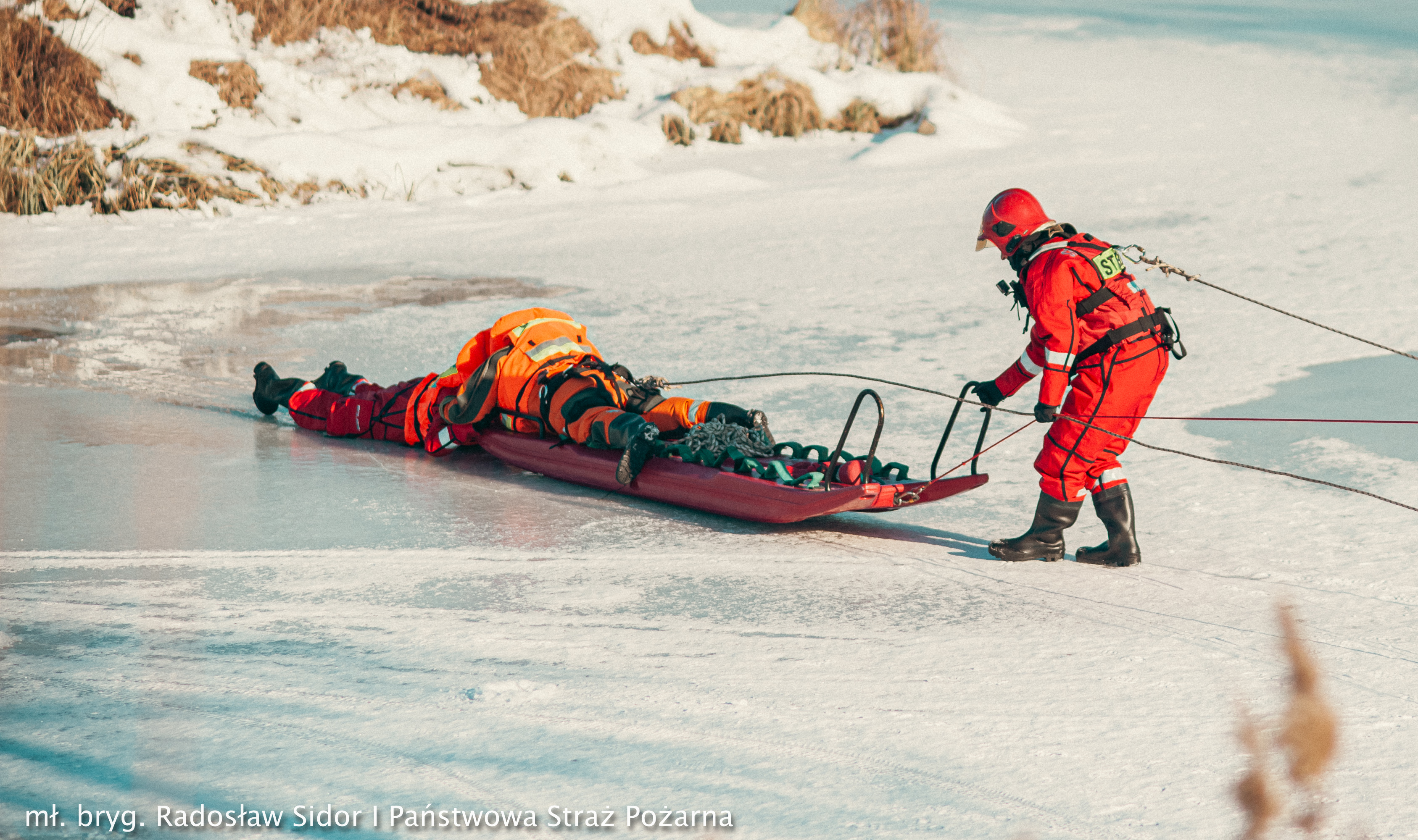 z lodowatą wodą. Ćwiczenia obejmowały różne techniki ewakuacji poszkodowanych