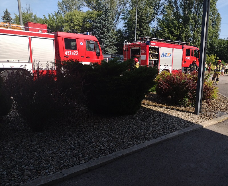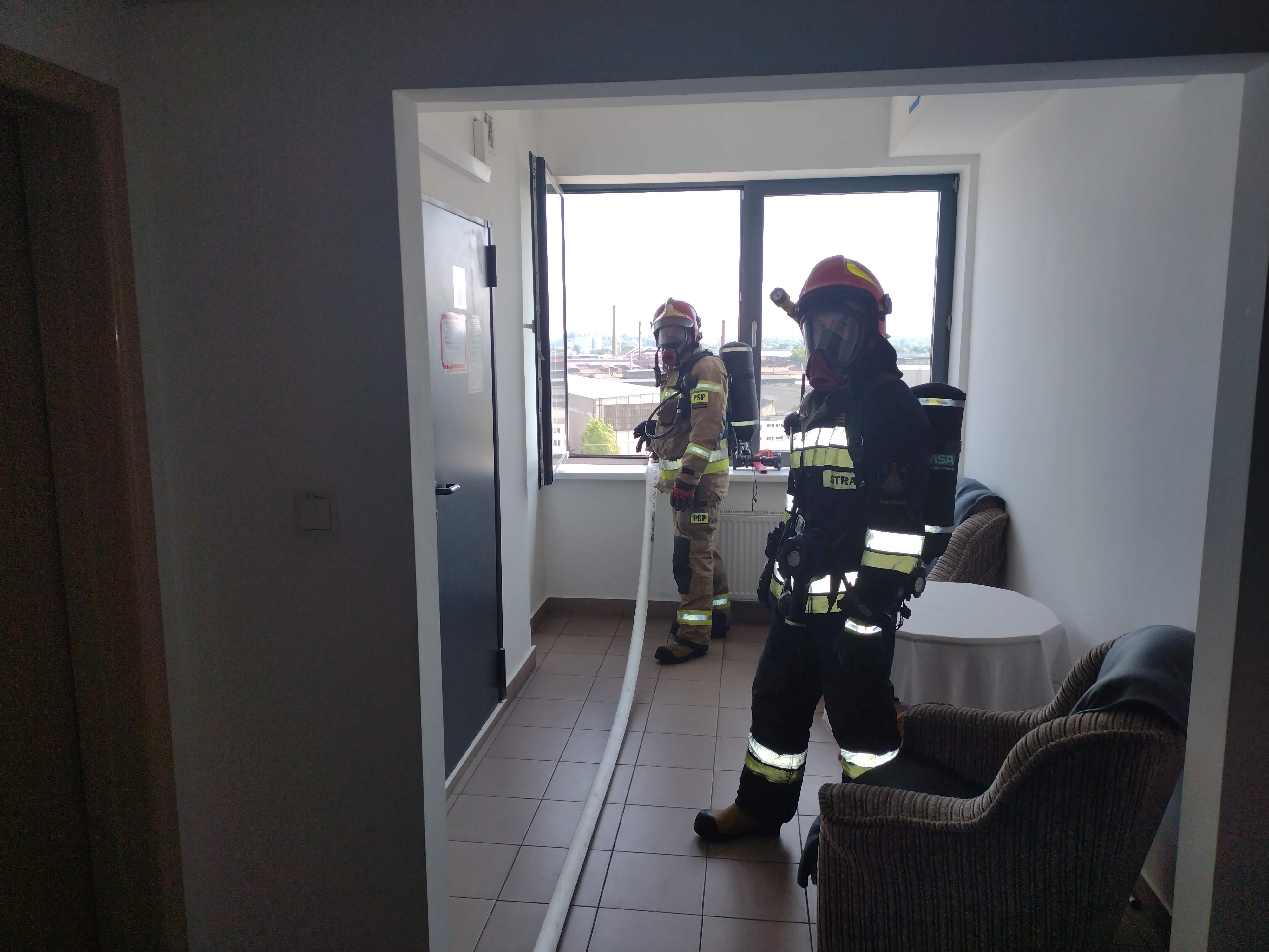 Pracownik straży miejskiej zauważa pożar w jednym z pomnieszczeń na 9 piętrze w budynku administracyjno-biurowym przy ul. Świętokrzyskiej w Ostrowcu Św. Następnie podejmuje próbę ugaszenia pożaru gaśnicą proszkową i wodą z hydrantu wewnętrznego i informuje straż pożarną o zaistniałej sytuacji. Dużyrny operacyjny KP PSP w Ostrowcu Św. dysponuje na miejsce zdarzenia zastępy z JRG Nr 2 w Ostrowcu Św. Po dojeździe na miejsce zdarzenia dowódca akcji dokonuje rozpoznania. Następnie informuje dyżurnego operacyjnego, że pożarem objęte jest jedno z pomieszczeń na wysokości 9 piętra. W tym czasie strażacy udają się windą pożarową na 8 piętro i rozwijają linię gaśniczą z nasady hydrantowej w budynku. Jednoczśnie trwa ewakuacja ludzi z obiektu . Po ugaszeniu pożaru następuje przeszukanie budynku i przewietrzenie. W zdarzeniu brało udział 4 samochody i 10 ratowników .