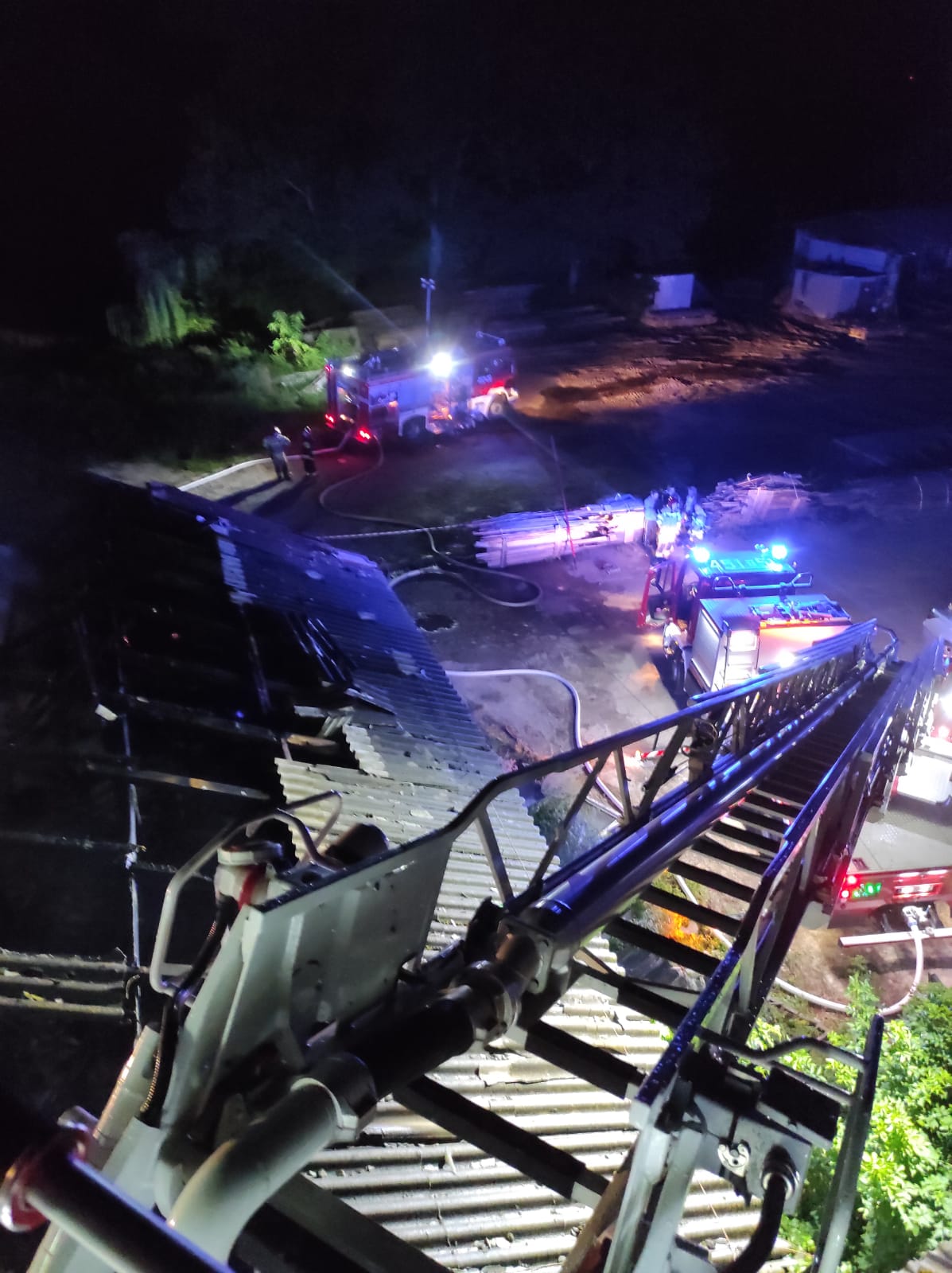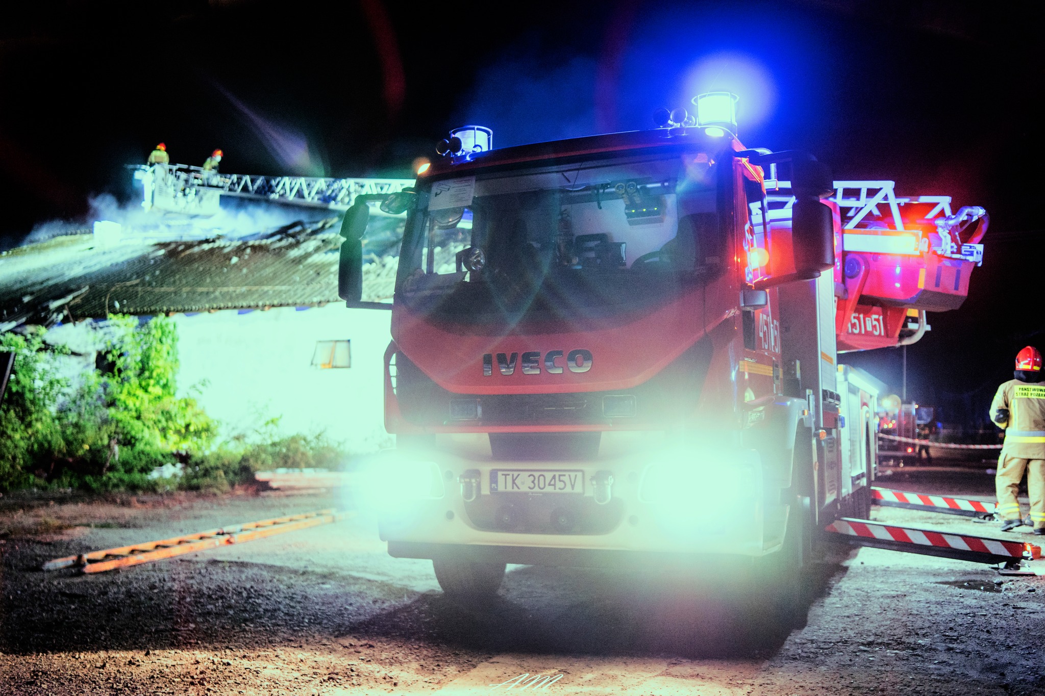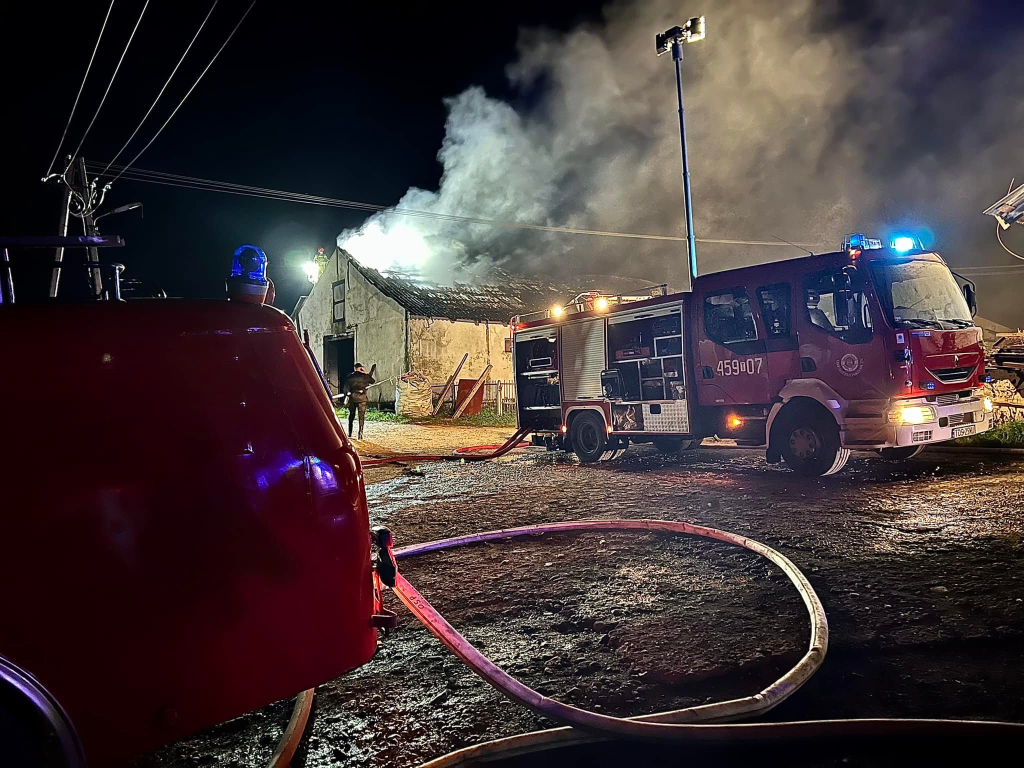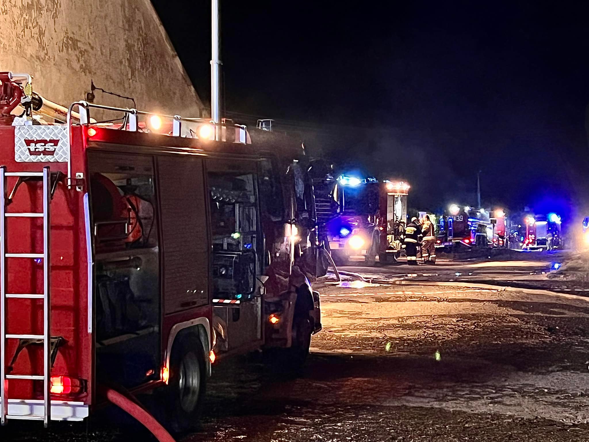 2 września 2022r. tuż przed godziną 22 do Stanowiska Kierowania Komendanta Powiatowego PSP w Ostrowcu Św. wpłynęło zgłoszenie o pożarze budynku gospodarczego w miejscowości Chocimów gm. Kunów. Do zdarzenia łącznie zadysponowano 17 samochodów ratowniczo-gaśniczych – 60 strażaków. Po przybyciu ratowników na miejsca akcji stwierdzono, że pożarem objęty jest w całości drewniany dach budynku gospodarczego, murowanego, pokrytego eternitem o powierzchni około 650 m2. Ogień zajął również cześć wnętrza obiektu wraz z magazynowanymi płodami rolnymi. Budynek ten wchodził w skład kompleksu zabudowań po byłym PGR-rze. Wobec czego istniało poważne zagrożenie rozprzestrzenienia się pożaru na sąsiednie budynki. W pierwszej fazie działania strażaków polegały zabezpieczeniu miejsca zdarzenia oraz podaniu wody w obronie do przylegających obiektów. Palący się dach gaszono z drabiny mechanicznej i drabin przystawnych. Zmagazynowane zboże zabezpieczono przy użyciu plandek dostarczonych z siedziby JRG Nr 2. Z budynku ewakuowano mienie w postaci ciągnika rolniczego oraz butle z tlenem, które bezpiecznie schłodzono. Po przygaszeniu pożaru wszystkie pomieszczenia przeszukano nie znajdując osób poszkodowanych. Przeprowadzono pracę rozbiórkowe tlących się elementów konstrukcji. Następnie przy użyciu kamery termowizyjnej sprawdzano obiekt nie stwierdzając zagrożenia. W wyniku prowadzonych działań ogień nie zdołał się rozprzestrzenić na sąsiednie obiekty a spaleniu uległo wnętrze budynku objętego pożarem na około 1/3 powierzchni. Działaniami dowodził mł. bryg. Tomasz Łyjak – Zastępca Komendanta Powiatowego PSP w Ostrowcu Św. Akcja trwała ponad 6 godzin.