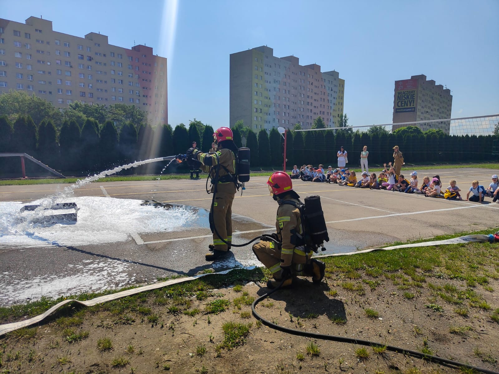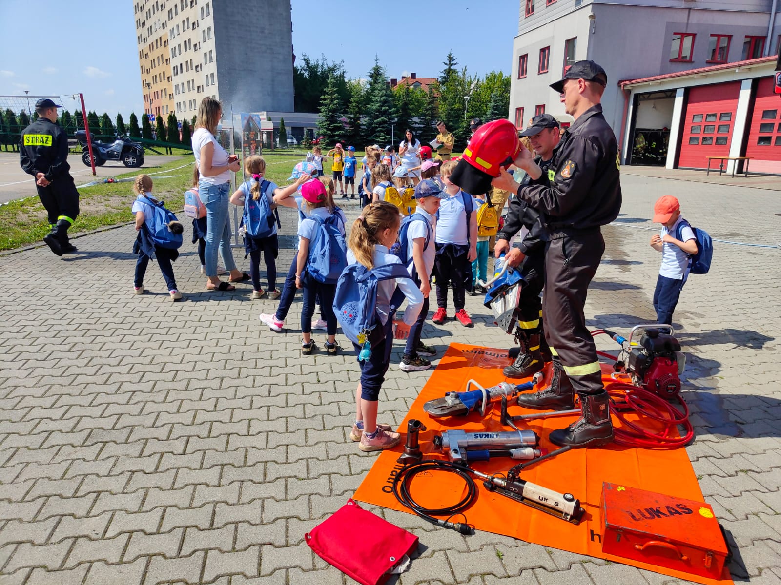 Podczas dzisiejszych prelekcji nasi uczestnicy mogli zobaczyć pokazy gaszenia tacy z olejem, wziąć do rąk sprzęt hydrauliczny, pneumatyczny, sprawdzić się na stacji ratownictwa medycznego oraz samodzielnie potrzymać prądownicę z wodą i poczuć się prawdziwym strażakiem. Dzieci dowiedziały się w jakich okolicznościach można wezwać Straż Pożarną oraz utrwaliły sobie numer alarmowy 112. Mówiliśmy również jak bezpiecznie spędzić wakacje i przestrzegaliśmy przed kąpaniem się w miejscach niedozwolonych. Na zakończenie spotkania po instruktarzach strażaków na wciąż aktualny temat związany z niebezpieczeństwami ze strony tlenku węgla rozdaliśmy czujki tlenku węgla i dymu zakupione przy pomocy środków z Fundacji imienia Stefana Artwińskiego.