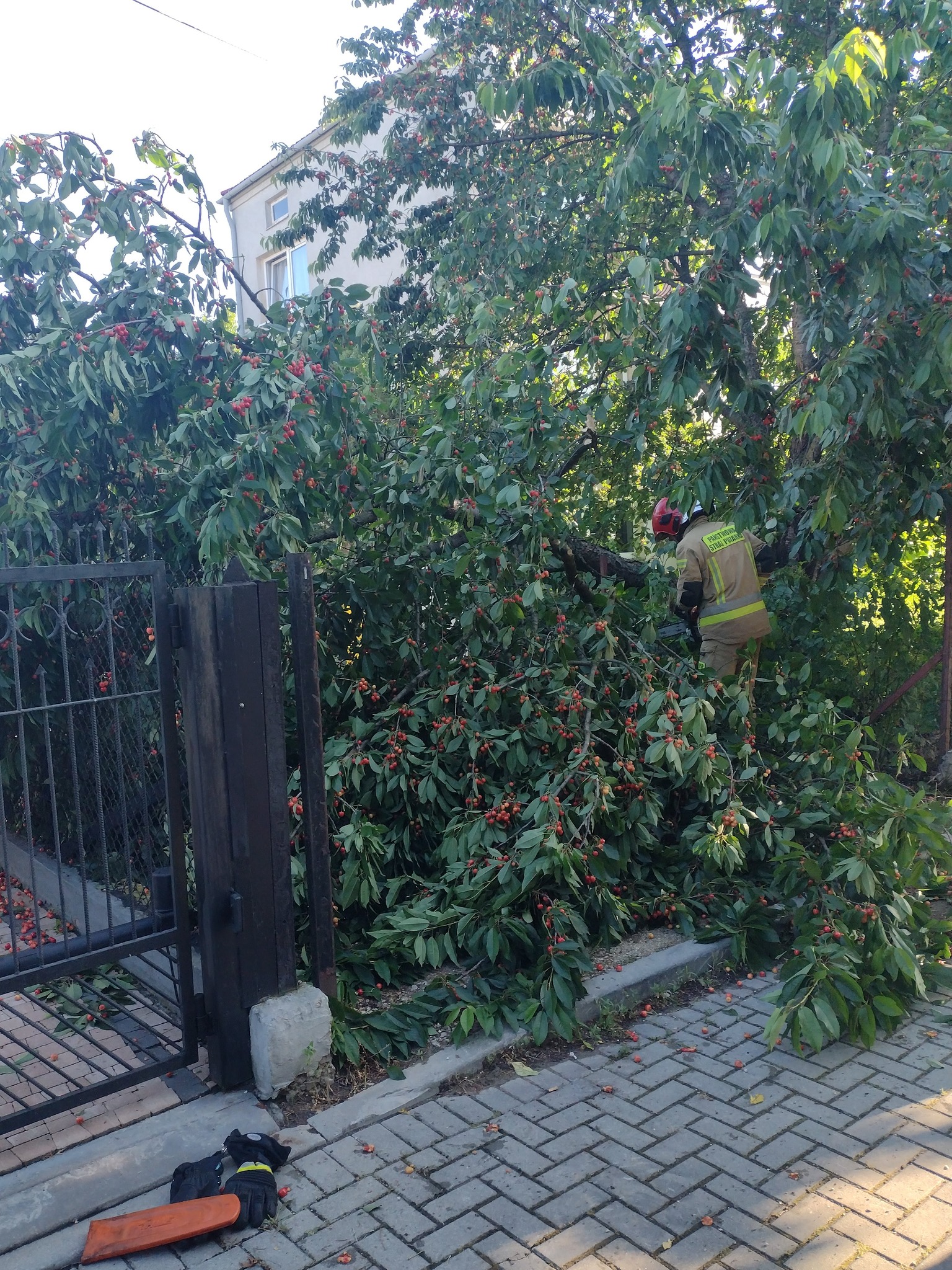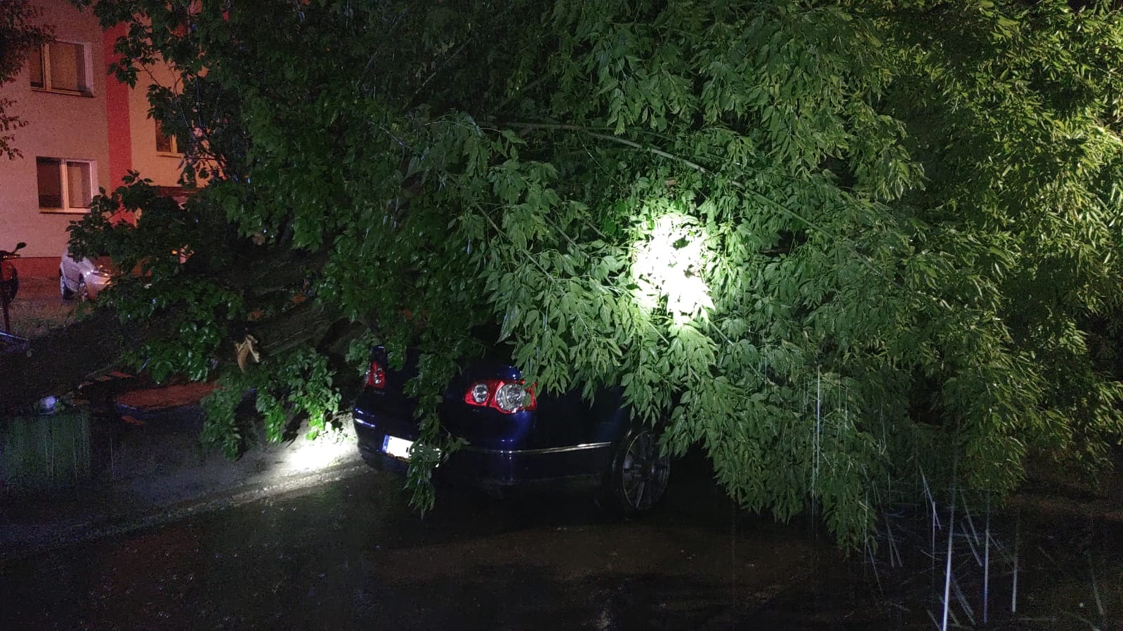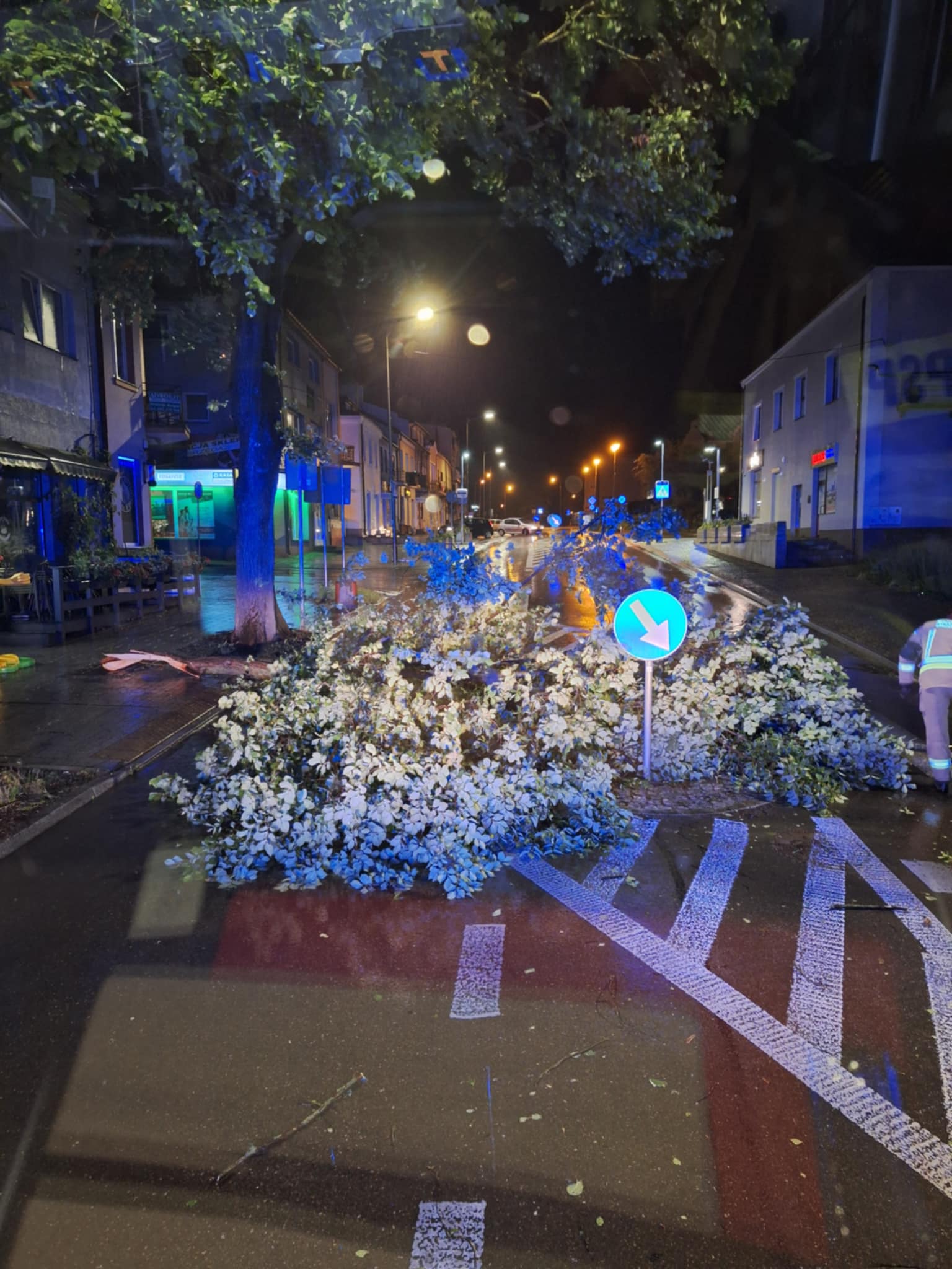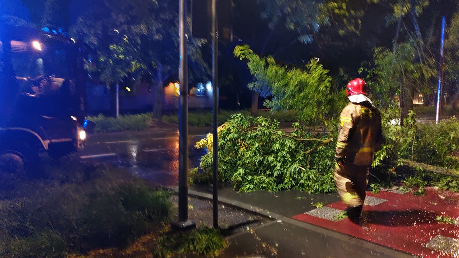Nocna burza mocno zaznaczyła swoją obecność nad naszym miastem i powiatem. Tuz po godzinne 22 zaczęły wpływać zgłoszenia o powalonych konarach drzew na drogi, chodniki, ogrodzenia, posesje lub linie energetyczne co stanowiło zagrożenie dla bezpieczeństwa ruchu drogowego i pieszego. Natomiast przy ul. Sienkiewicza w Ostrowcu Św. spadające gałęzie uszkodziły zaparkowane 2 samochody osobowe a przy ul. Wałowej porywisty wiatr naruszył obróbkę blacharską dachu nad budynkiem mieszkalnym.