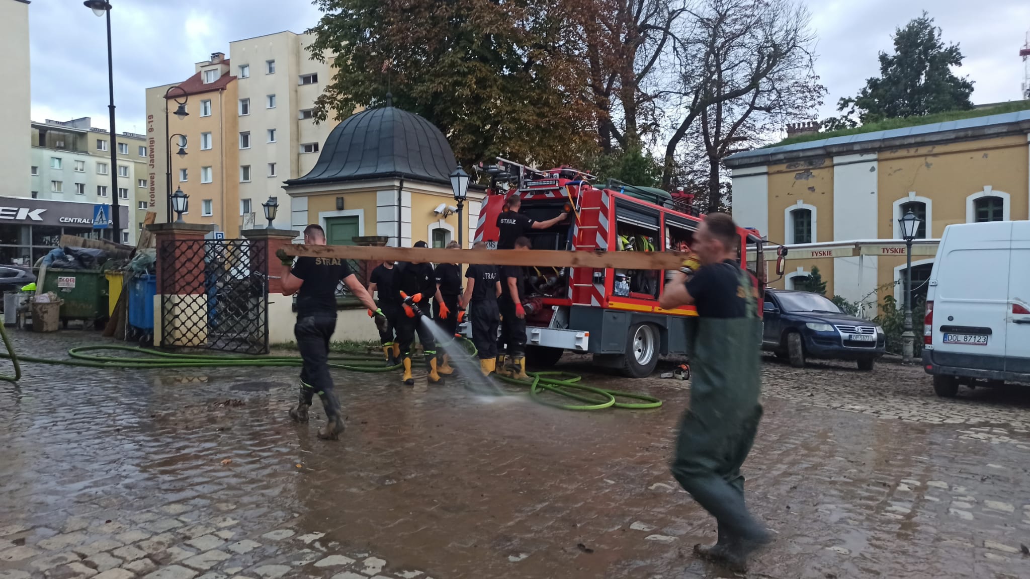Działania Kompanii Specjalnej Kielce I w której skład wchodzi 6 ostrowieckich strażaków polegają w chwili obecnej na usuwaniu skutków powodzi w Bastionie Św. Jadwigi przy ul. Piastowskiej 19 w Nysie. Bastion znajduje się na starym mieście, na terenie zagłębionym stąd zalegająca duża ilość mułu zarówno na dziedzińcu, jak i na najniższej kondygnacji budynków. Strażacy nieustannie usuwają błoto z dziedzińca, rozbierają uszkodzone konstrukcje drewniane, oraz przygotowują teren pod kątem przyjętego sposobu realizacji zadań na dzień następny. Cała kompania stacjonuje i nocuje w Sali Sportowej przy ul. Grodkowskiej i pozostanie tam tak długo jak wymaga tego sytuacja.