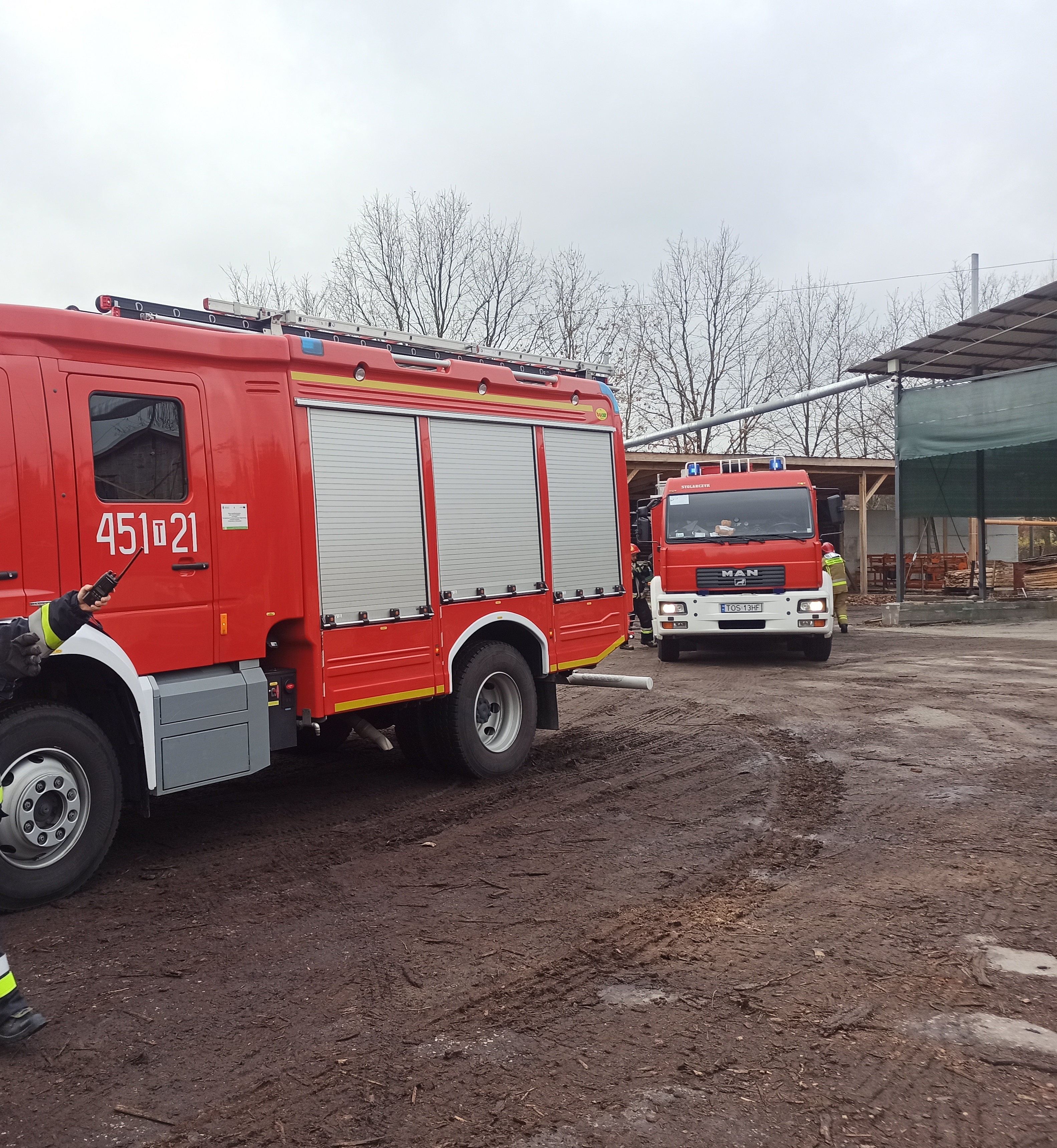 2. W jednej z hal produkcyjnych na skutek zwarcia w instalacji elektrycznej dochodzi do zapalenia się maszyny i przeniesienia ognia na składowane elementy drewniane. Do pożaru dochodzi podczas przerwy śniadaniowej, dlatego pożar został zauważony w fazie rozwiniętej. Działania pracowników tartaku polegały na odłączeniu energii elektrycznej, powiadomieniu straży pożarnej, a także właściciela zakładu. W między czasie przy pomocy wózków transportowych z hali usunięto część składowanego drewna. Działania strażaków polegały na rozpoznaniu i zabezpieczeniu miejsca zdarzenia. W wyniku rozpoznania kierujący działaniem ratowniczym uznał, iż należy niezwłocznie przystąpić do gaszenia pożaru w natarciu, aby zapobiec jego „wyjściu” poza halę produkcyjną. Po ugaszeniu pożaru zapoznano się z zakładem, a w szczególności niebezpieczeństwami, jakie mogą napotkać strażacy w tego typu obiektach.