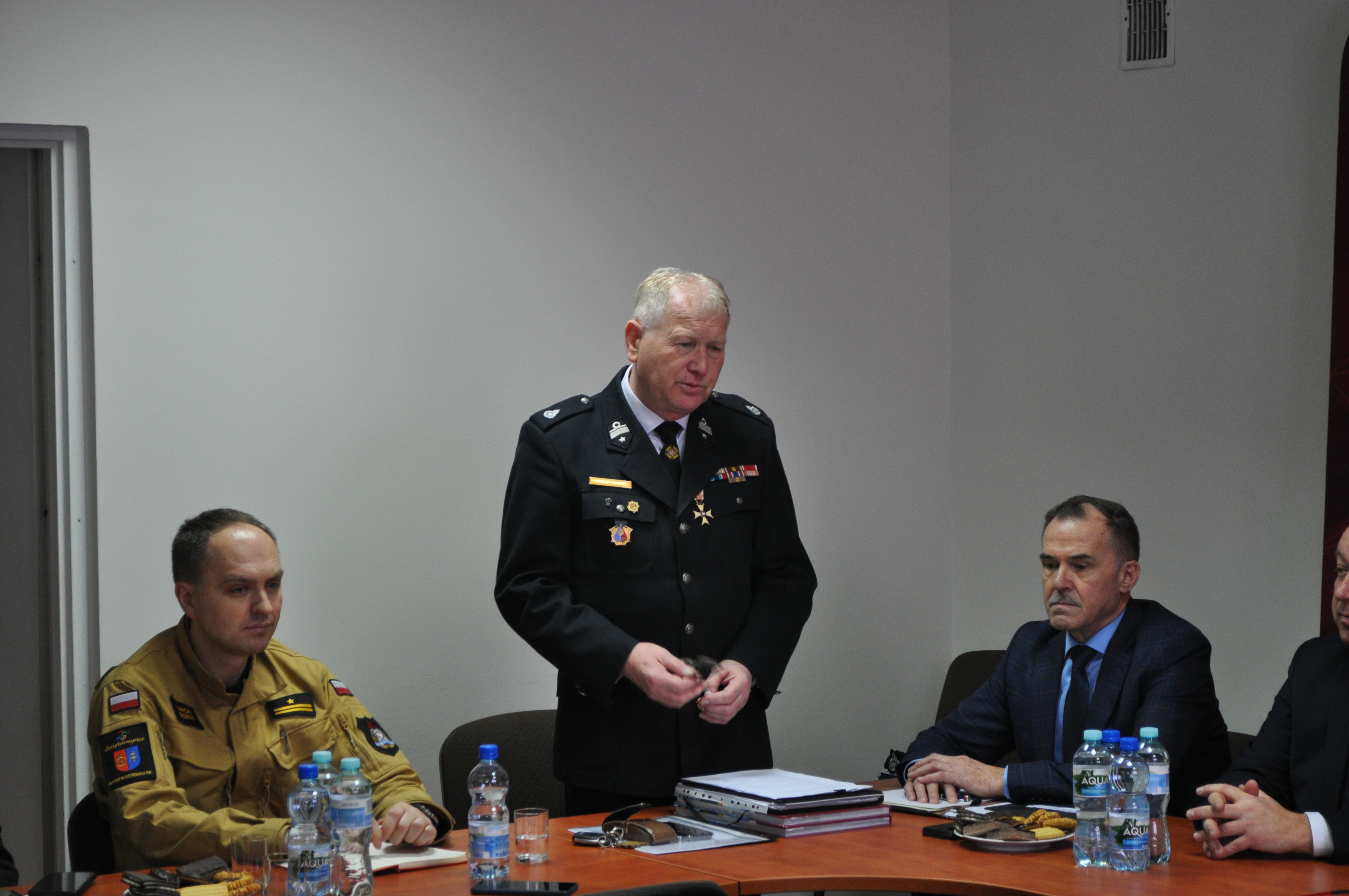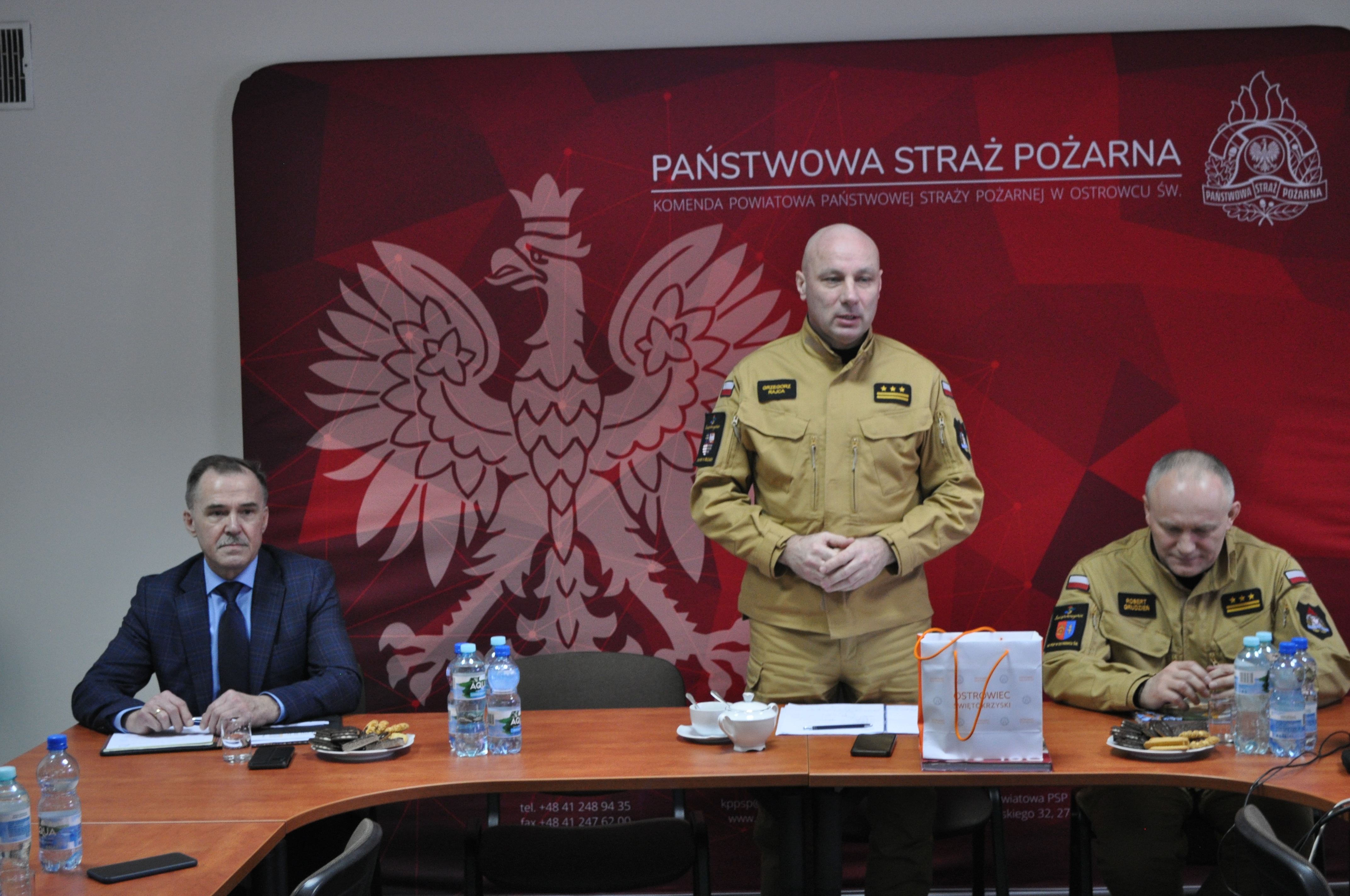 Spotkanie rozpoczęło się złożeniem meldunku st. bryg. Grzegorzowi Rajcy - Zastępcy Świętokrzyskiego Komendanta Wojewódzkiego PSP przez Zastępcę Komendanta Powiatowego w Ostrowcu Świętokrzyskim mł. bryg. Tomasza Łyjaka. Następnie gospodarz spotkania Komendant Powiatowy PSP w Ostrowcu Świętokrzyskim st. bryg. Robert Grudzień przywitał przybyłych gości w osobach: Zastępcy Świętokrzyskiego Komendanta Wojewódzkiego PSP w Kielcach st. bryg. Grzegorza Rajcy, Wicestarosty Powiatu Ostrowieckiego Andrzeja Jabłońskiego, Wiceprezydenta Miasta Ostrowca Św. Artura Łakomca, , Wiceprezesa Zarządu Oddziału Wojewódzkiego ZOSP dha Krzysztofa Gajewskiego, komendantów gminnych ochotniczych straży pożarnych, przedstawicieli służb i instytucji współdziałających, a także pracowników i funkcjonariuszy ostrowieckiej komendy.