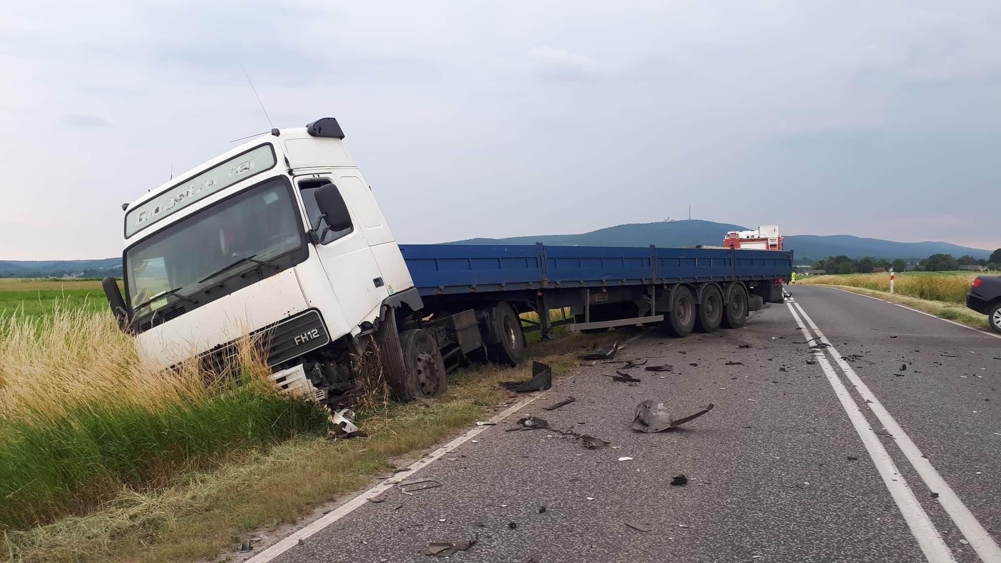 Po dojeździe na miejsce zdarzenia strażacy stwierdzili, że doszło do zderzenia samochodu osobowego Audi A6 samochodem ciężarowym Volvo. Samochodem osobowym podróżowało 2 osoby tj. kierująca kobieta oraz dziecko, natomiast samochodem ciężarowym podróżował tylko kierowca. Na miejscu akcji znajdowała się policja. Wszystkie osoby uczestniczące w zdarzeniu znajdowały się poza pojazdami. Kierująca samochodem osobowym była nieprzytomna z zachowanymi funkcjami życiowymi, dziecko było przytomne z widocznymi otarciami i stłuczeniami. Kierujący samochodem ciężarowym nie uskarżał się na żadne dolegliwości. Pojazdy znajdowały się w przydrożnych rowach po przeciwnej stronie jezdni. Droga była całkowicie zablokowana.