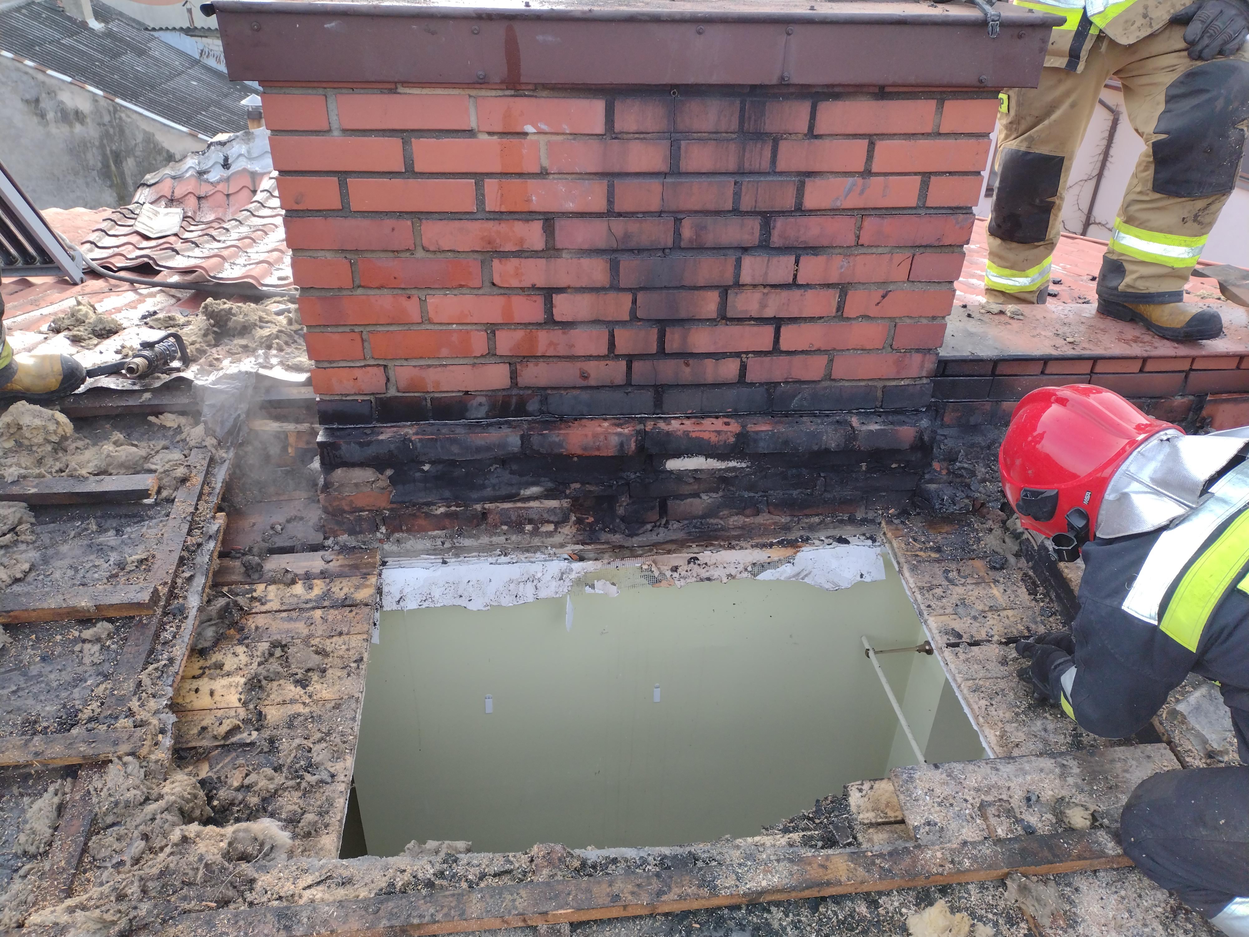 Działania strażaków polegały na zabezpieczeniu miejsca zdarzenia oraz odłączeniu dopływu energii elektrycznej. Następnie ratownicy dostali się na dach budynku przy pomocy drabiny przenośnej. Z dachu usunięto pokrycie w pobliżu komina, w celu ustalenia źródła pożaru oraz podano jeden prąd wody na palącą się konstrukcję dachu, cały czas monitorując sytuację kamerą termowizyjną. Usunięto elementy konstrukcji dachu, które objęte były pożarem. Pomieszczenia oddymiono oraz sprawdzono przy pomocy kamery termowizyjnej i detektorów wielogazowych. Miejsce po usuniętym poszyciu dachu zabezpieczono plandeką przekazaną przez domowników oraz wcześniej zdemontowanymi arkuszami blachy. Na tym działania zakończono. Akcja gaśnicza trwała prawie 2 godziny.