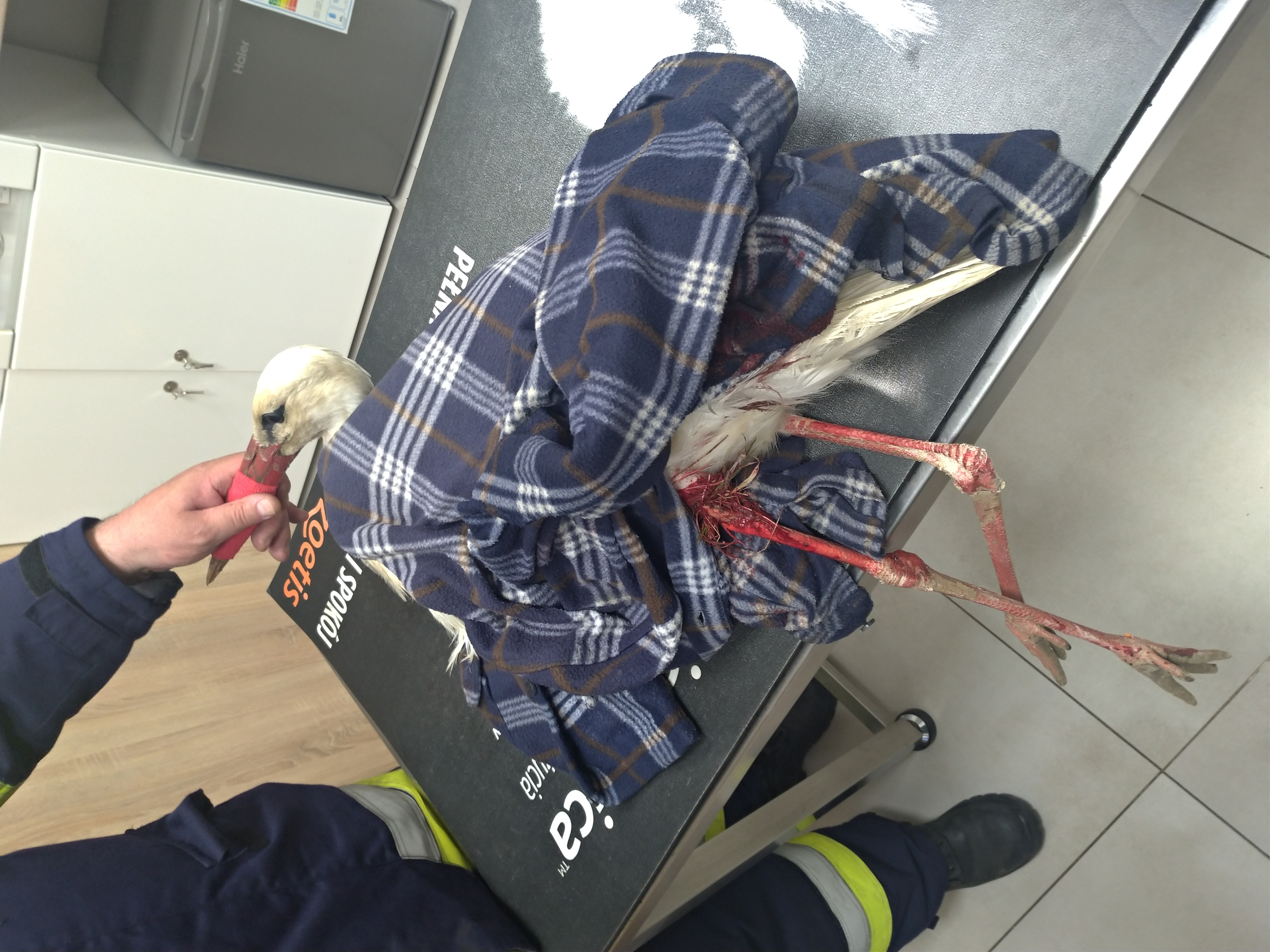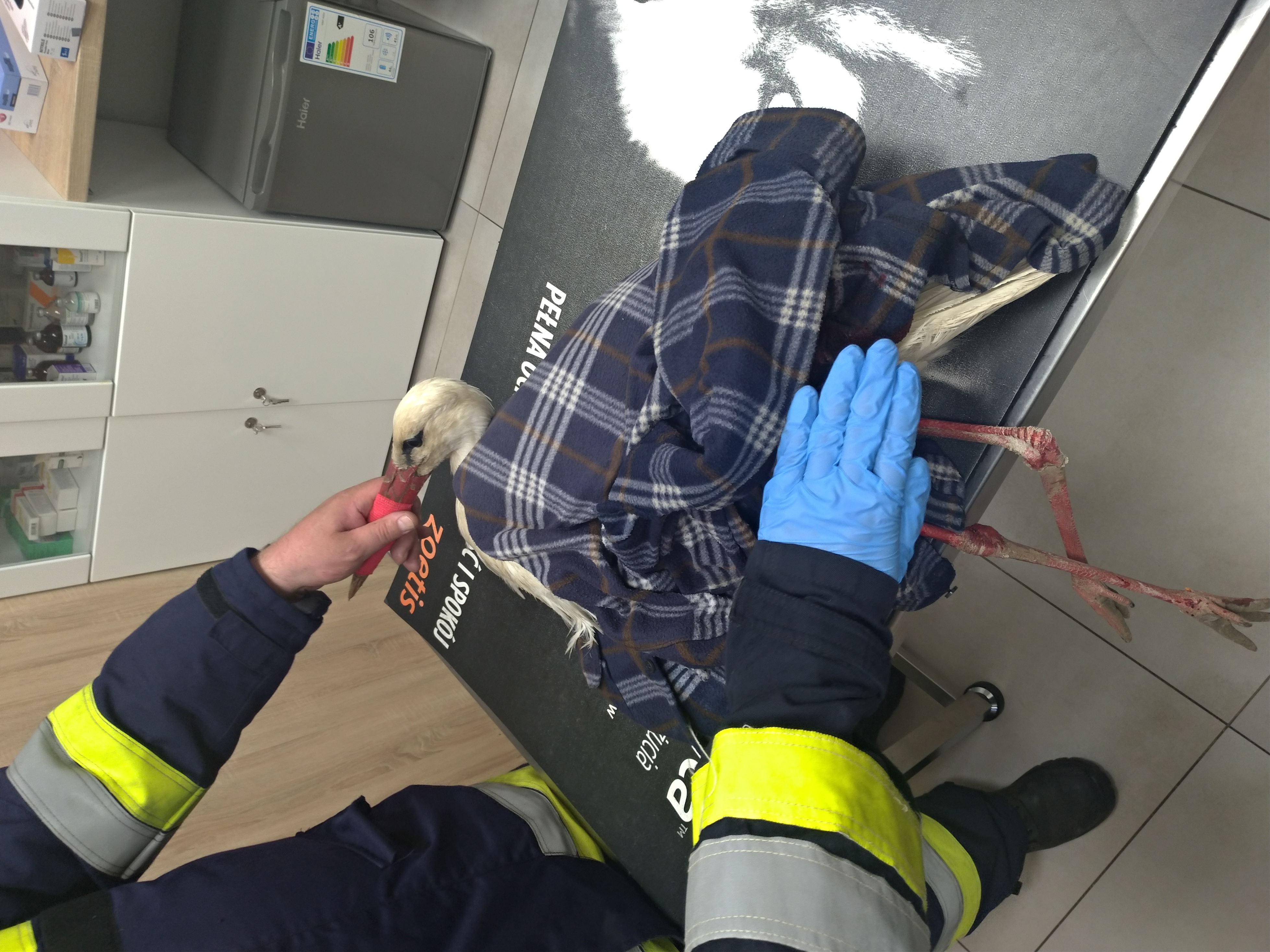 Powiat ostrowiecki - Strażacy pomagają rannemu bocianowi