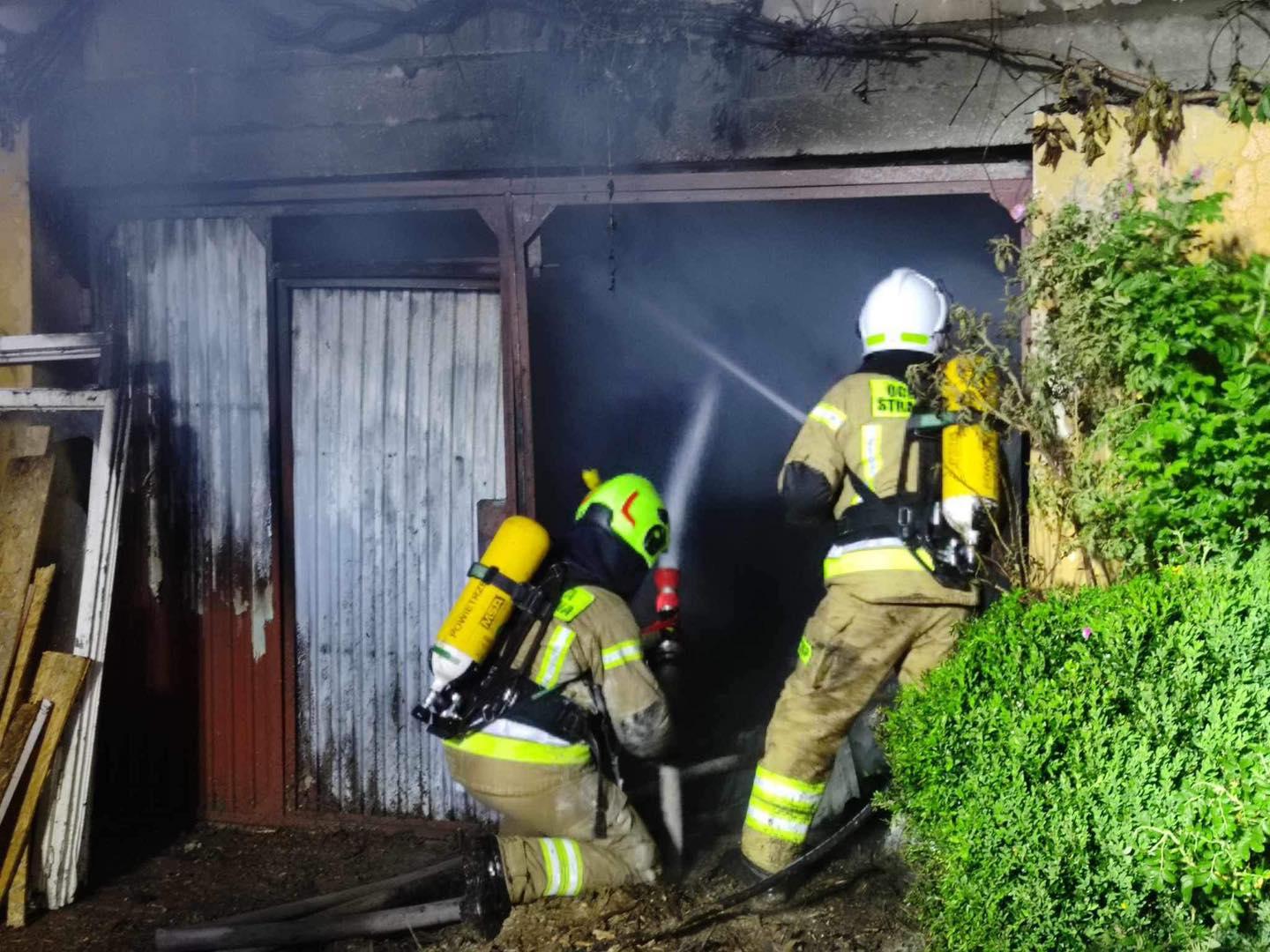 Do zdarzenia natychmiast zadysponowano 5 samochodów ratowniczo gaśniczych, 23 strażaków. Po przybyciu strażaków na miejsce zdarzenia, stwierdzono, że pożarem objęty jest budynek gospodarczy przylegający do garażu oraz składowane w nim materiały. Brak osób poszkodowanych. Działania strażaków polegały na zabezpieczeniu miejsca zdarzenia, podaniu prądów wody na objęty pożarem budynek gospodarczy oraz w obronie na przylegający garaż. Po ugaszeniu pożaru ratownicy przystąpili do wynoszenia zalegających w budynku materiałów oraz do dogaszania tlących się elementów konstrukcji. Działania trwały ponad dwie godziny.