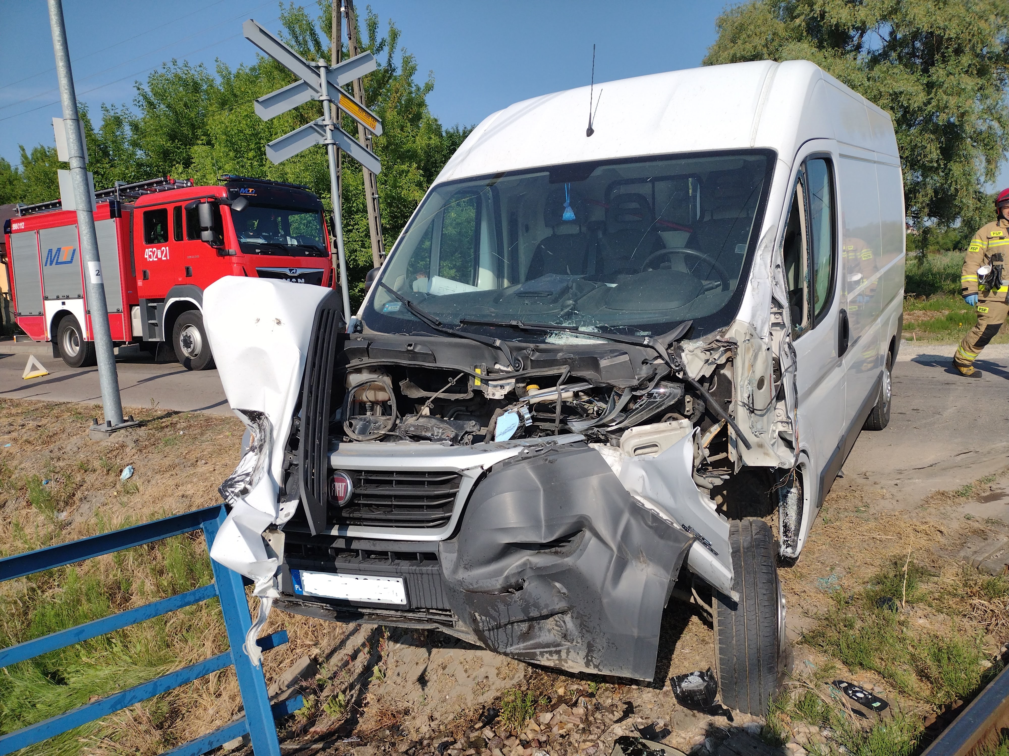 10 czerwca 2021 r. tuż po godzinie 8 do Stanowiska Kierowania Komendanta Powiatowego PSP w Ostrowcu Św. wpłynęło zgłoszenie o kolizji drogowej na przejeździe kolejowym w Ćmielowie przy ul. Zamkowej. Do zdarzenia natychmiast zadysponowano 4 samochody ratowniczo-gaśnicze – 12 strażaków. Po dojeździe na miejsce akcji stwierdzono, że na niestrzeżonym przejeździe kolejowym doszło do zderzenia samochodu dostawczego marki Fiat Ducato z lokomotywą. W wyniku kolizji doszło do uszkodzenia samochodu dostawczego oraz niewielkiego wycieku płynów eksploatacyjnych. Na szczęście nikt nie został ranny. Prowadzący auto przed przyjazdem zastępów samodzielnie opuścił pojazd. Działania ratowników polegały na zabezpieczeniu miejsca zdarzenia, odłączeniu zasilania w samochodzie dostawczym oraz zebraniu powstałej plamy płynów przy pomocy sorbentu. Następnie używając pilarki tarczowej usunięto część barierki, która uległa uszkodzeniu w trakcie zdarzenia. Maszynista i kierowca samochodu po przebadaniu przez ZRM pozostali na miejscu zdarzenia. Akcja trwała ponad godzinę.
