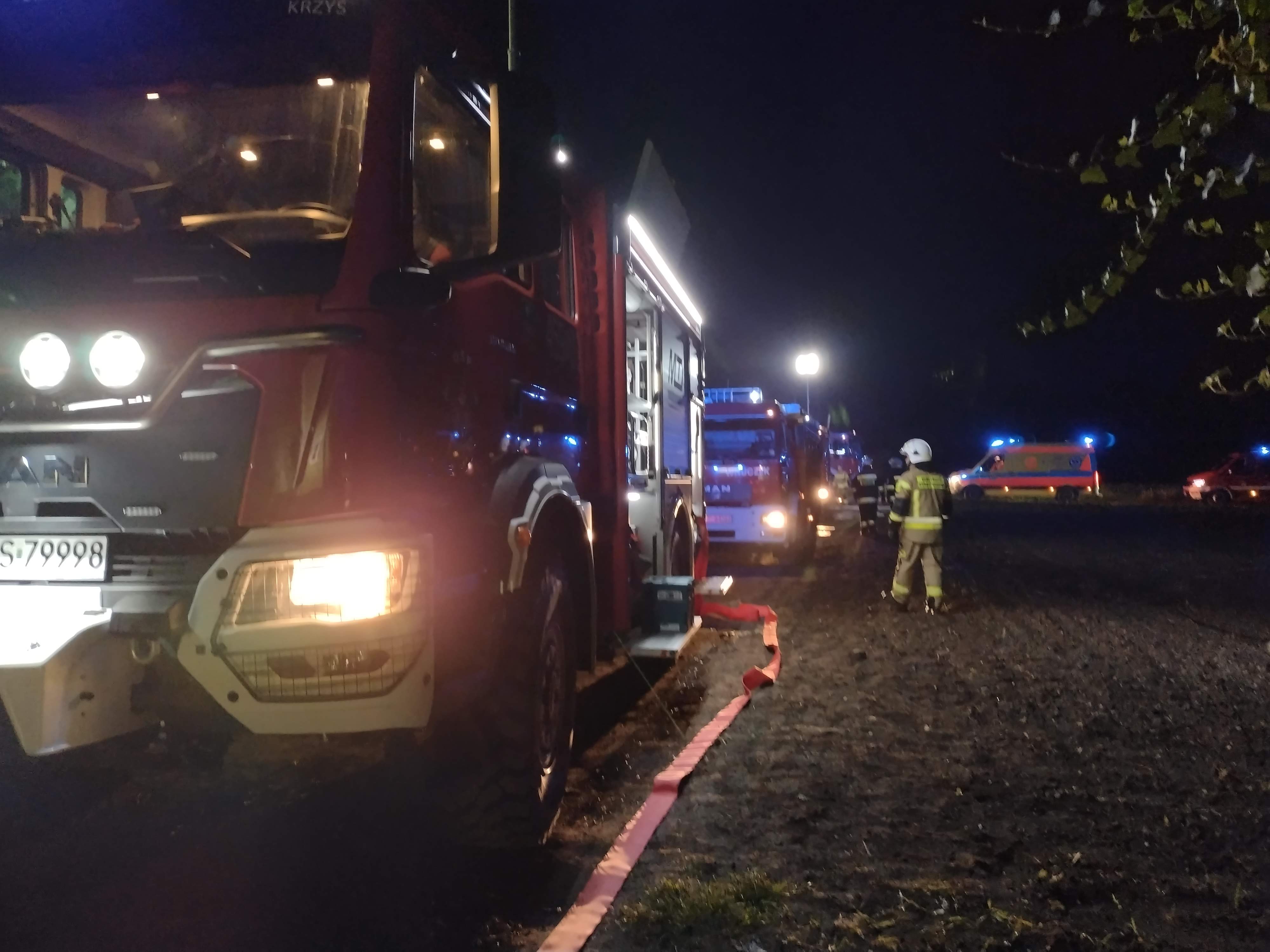 W dniu dzisiejszym tuż po godzinie 1 w nocy otrzymaliśmy zgłoszenie o pożarze w miejscowości Zajączkowice gmina Waśniów. Do zdarzenia łącznie zadysponowaliśmy 10 samochodów ratowniczo-gaśniczych – 42 strażaków. Po dojeździe na miejsce zdarzenia okazało się, że pożarem objęte są 2 obiekty w zabudowie zagrodowej. Panowało silne zadymienie. Ogień wychodził już na zewnątrz konstrukcji. Niestety przed wejściem do jednego z budynków znaleziono zwęglone zwłoki starszej kobiety. W tym przypadku żywioł nie dał nam żadnych szans.