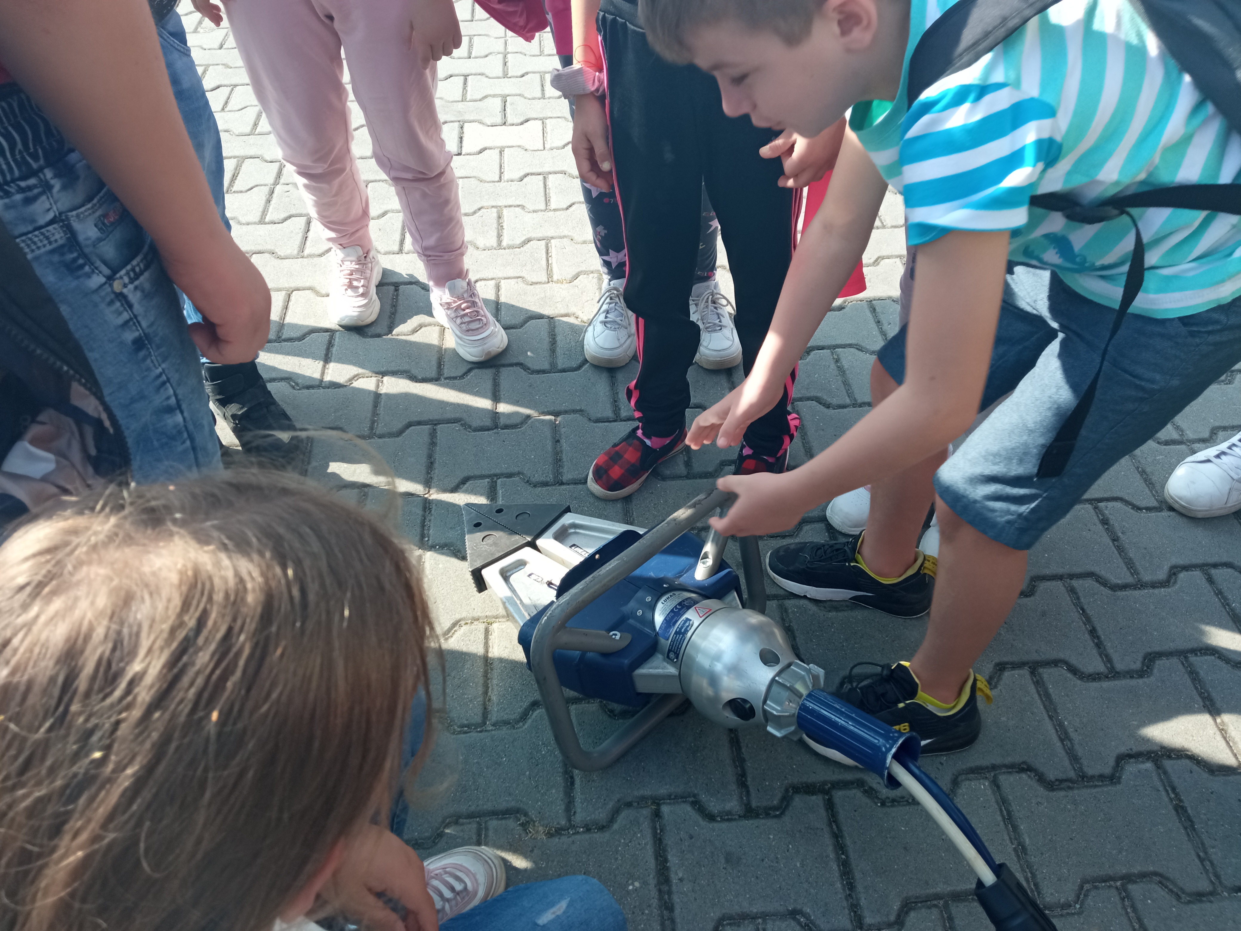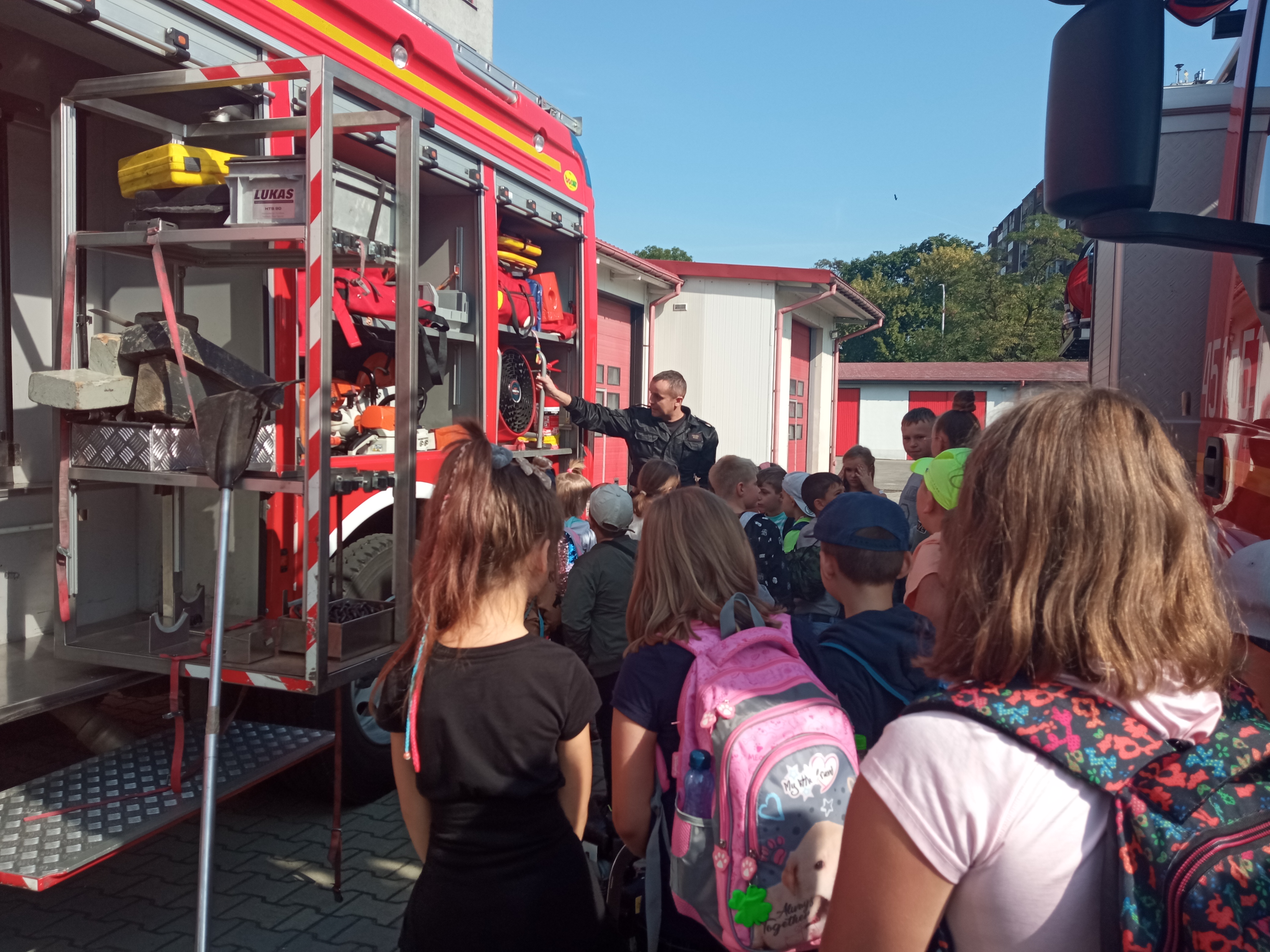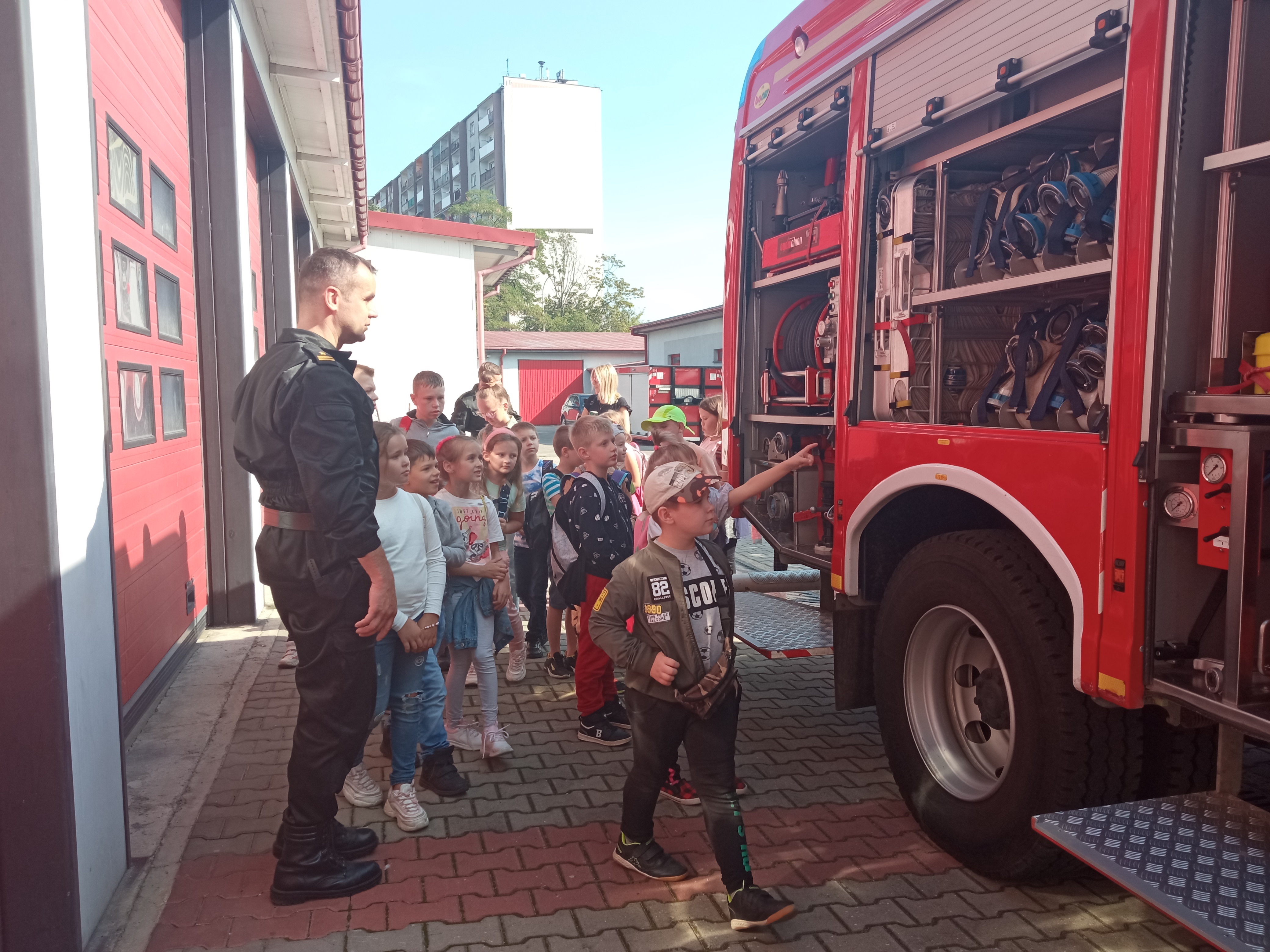 W dniu 8.09.2021 r. naszymi gośćmi były dzieci z Zespołu Edukacyjnego „Dwunastka” w Ostrowcu Św. W ramach spotkania strażacy zapoznali młodzież ze sprzętem, którym dysponują. Każdy maluch mógł zasiąść za kierownicą samochodu pożarniczego, oraz sprawdzić ile ważą nożyce hydrauliczne czy aparat powietrzny. Dużo radości sprawiły dzieciom pokazy umundurowania a szczególnie możliwość przymierzenia prawdziwego hełmu aby poczuć się choć przez chwilę strażakiem. Skontrolowano też znajomości numerów alarmowych oraz omówiono zasady zgłaszania zdarzeń do stanowiska kierowania. Wszyscy z wielkim zaciekawieniem wysłuchali opowieści o akcjach ratowniczo - gaśniczych. Prowadzący spotkanie mł.bryg. Tomasz Łyjak - Zastępca Komendanta Powiatowego PSP w Ostrowcu Św. relacjonował, że w ramach edukacji społecznej i promocji bezpiecznych zachowań, strażacy kładą duży nacisk na zagrożenia związane z okresem grzewczym i tlenkiem węgla. Nie brakuje też działań edukacyjnych w okresie ferii zimowych i letniego wypoczynku dzieci i młodzieży, a także w czasie wzmożonych prac polowych. Nasze spotkanie przebiegło w miłej atmosferze a zadowolone dzieci pożegnały nas z uśmiechem.
