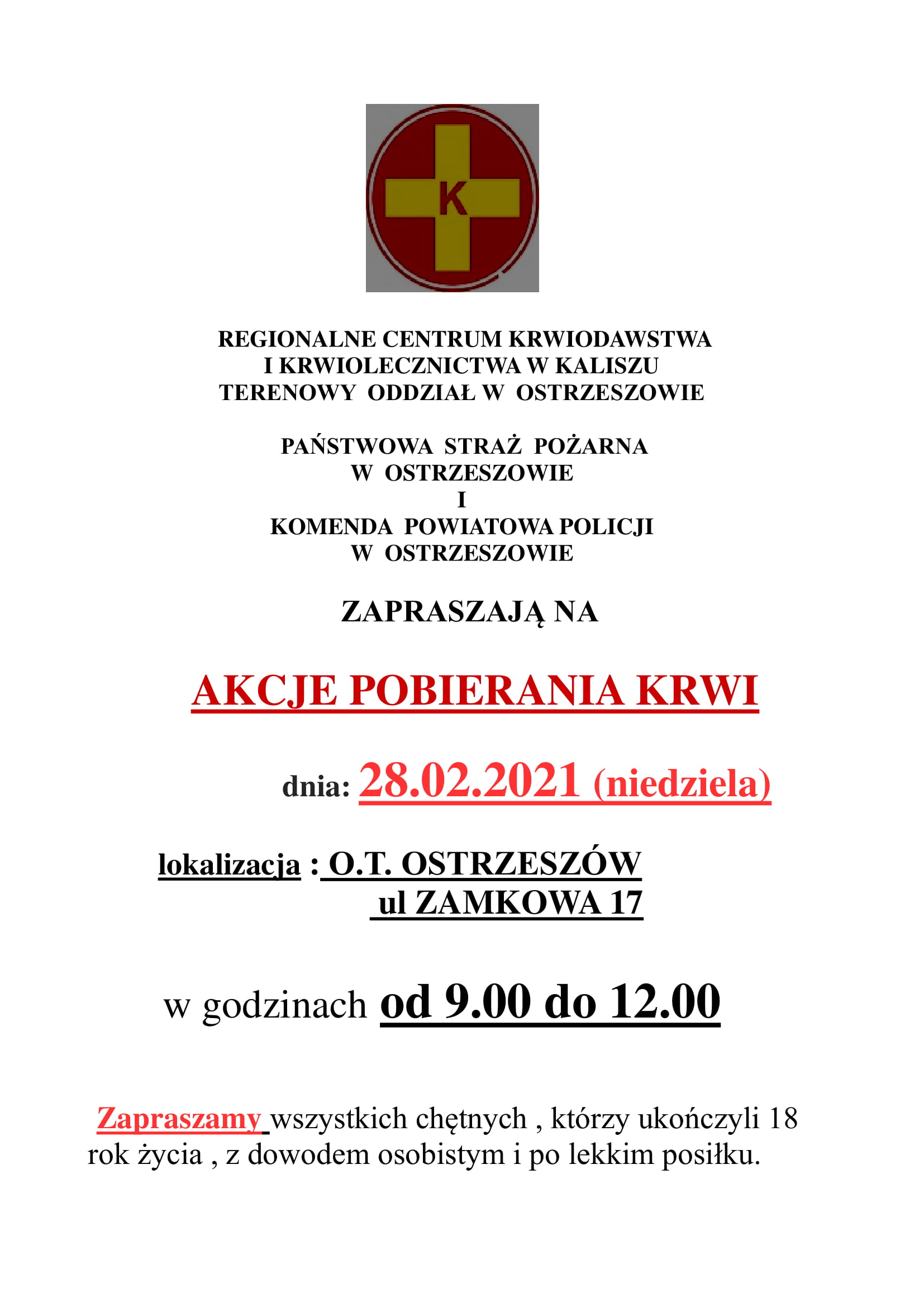 Terenowy oddział w Ostrzeszowie Regionalnego Centrum Krwiodawstwa i Krwiolecznictwa w Kaliszu wraz Komendą Powiatową Państwowej Straży Pożarnej w Ostrzeszowie i Komendą Powiatową Policji w Ostrzeszowie zaprasza na akcję pobierania krwi, która odbędzie się w dniu 28.02.2021 roku. Lokalizacją akcji będzie Oddział Terenowy w Ostrzeszowie przy ulicy Zamkowej 17.