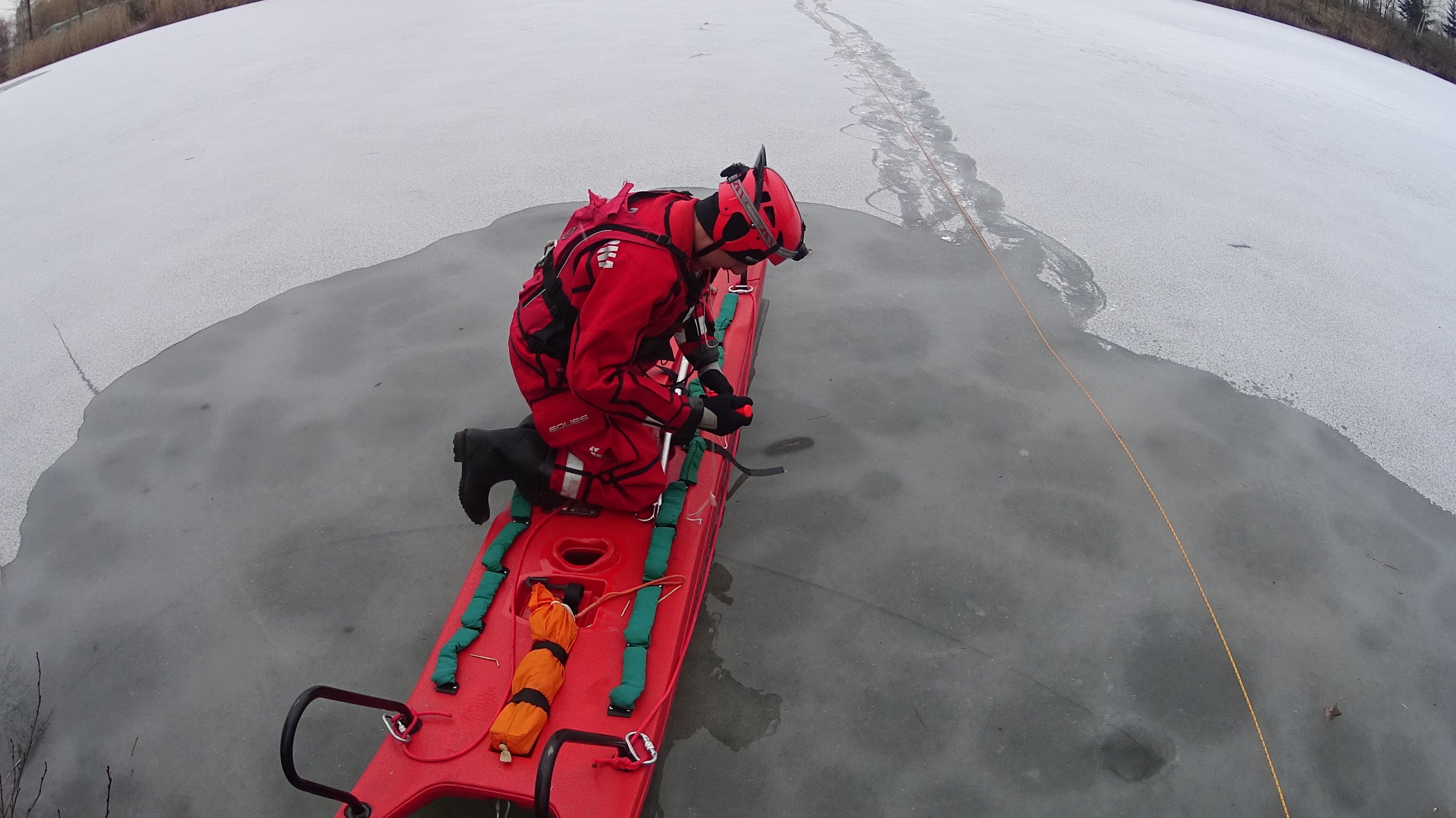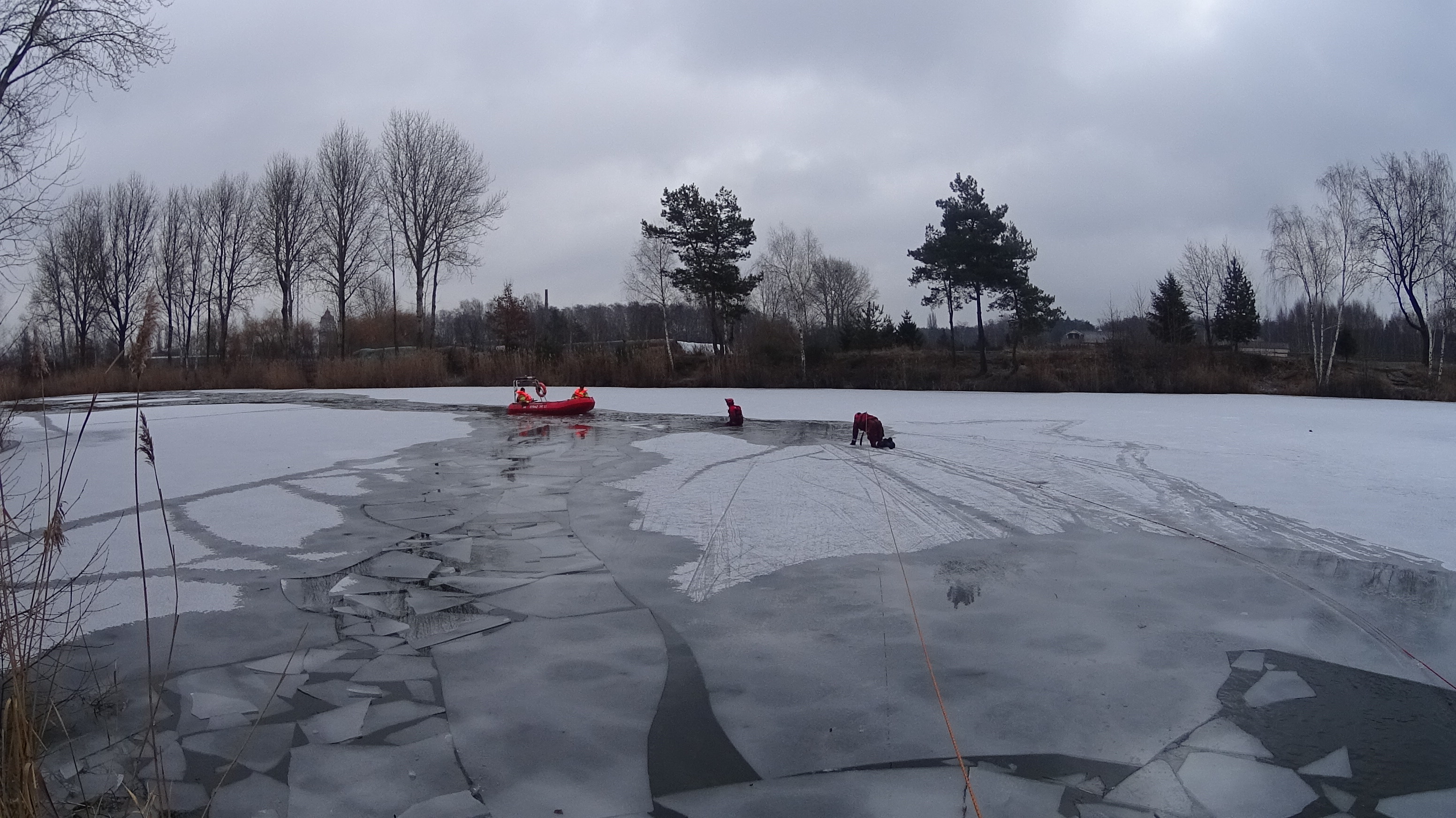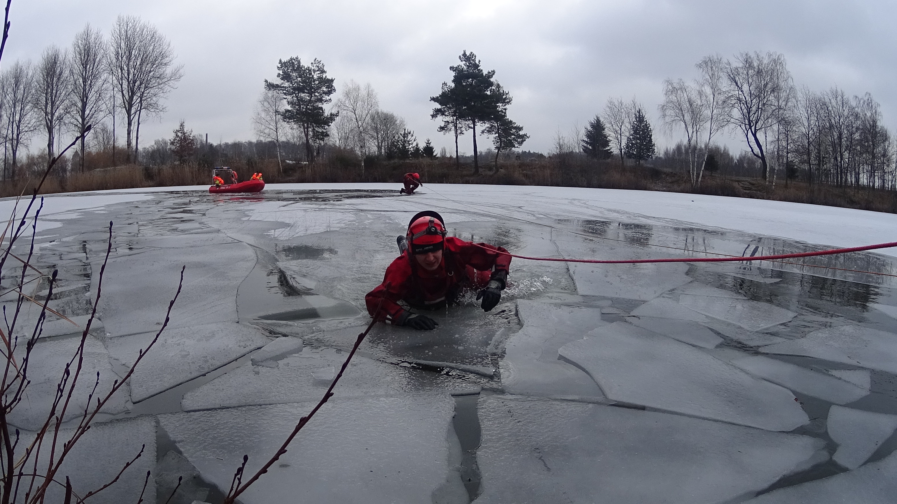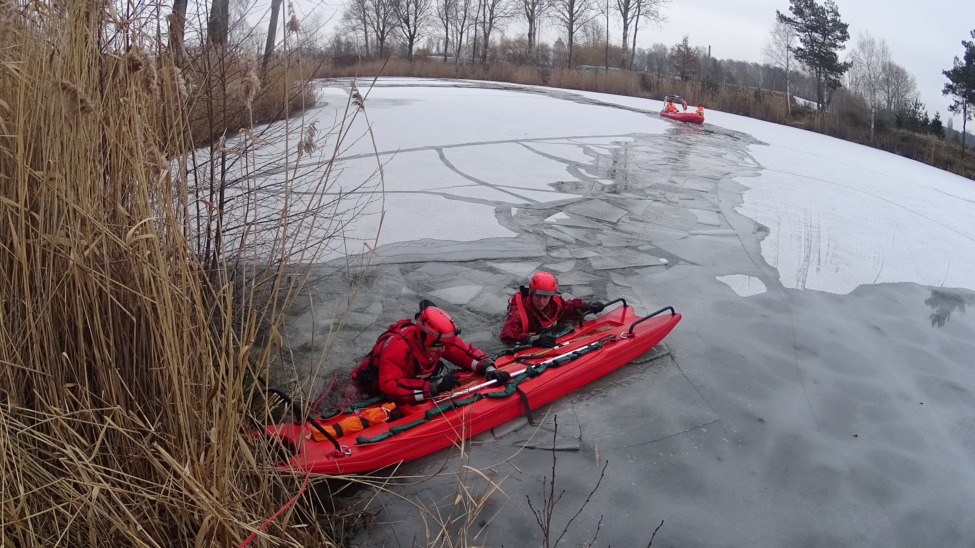 Ratownicy z wykorzystaniem łodzi, deski lodowej, skafandrów ratowniczych i pełnego wyposażenia asekuracyjnego przećwiczyli różne warianty ratowania osób poszkodowanych na zamarzniętych zbiornikach wodnych o grubości lodu na pograniczu wytrzymałości ciężarem osoby dorosłej.