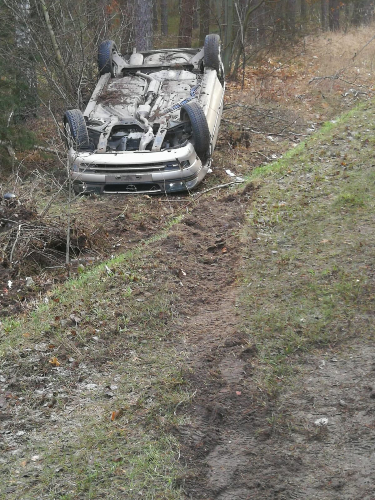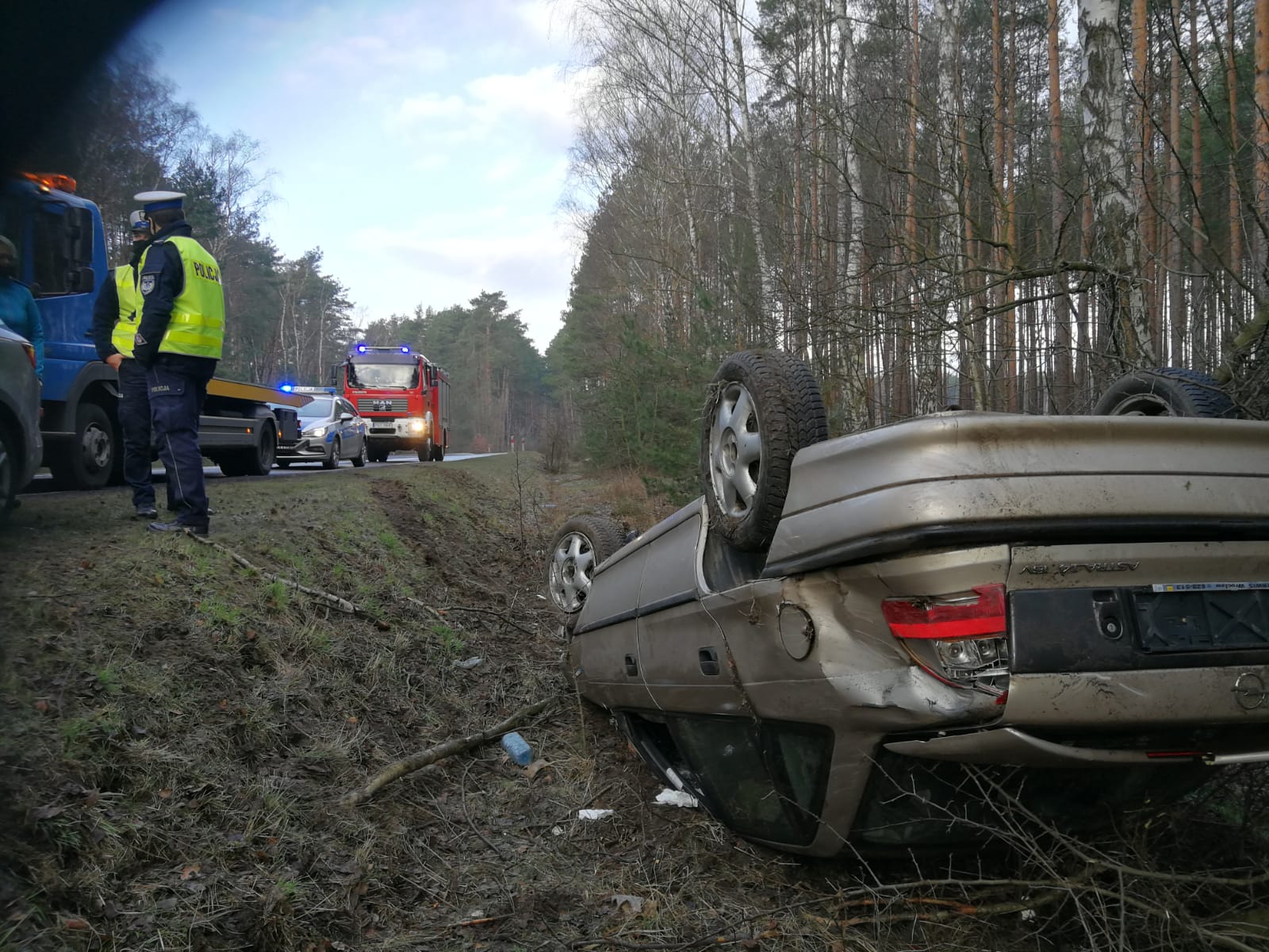 Po dojeździe na miejsce zdarzenia, zastaliśmy pojazd znajdujący się poza jezdnią na dachu oraz uzyskaliśmy informację, że przed naszym przybyciem 2 osoby poszkodowane zostały zabrane przez Zespól Ratownictwa Medycznego do szpitala.