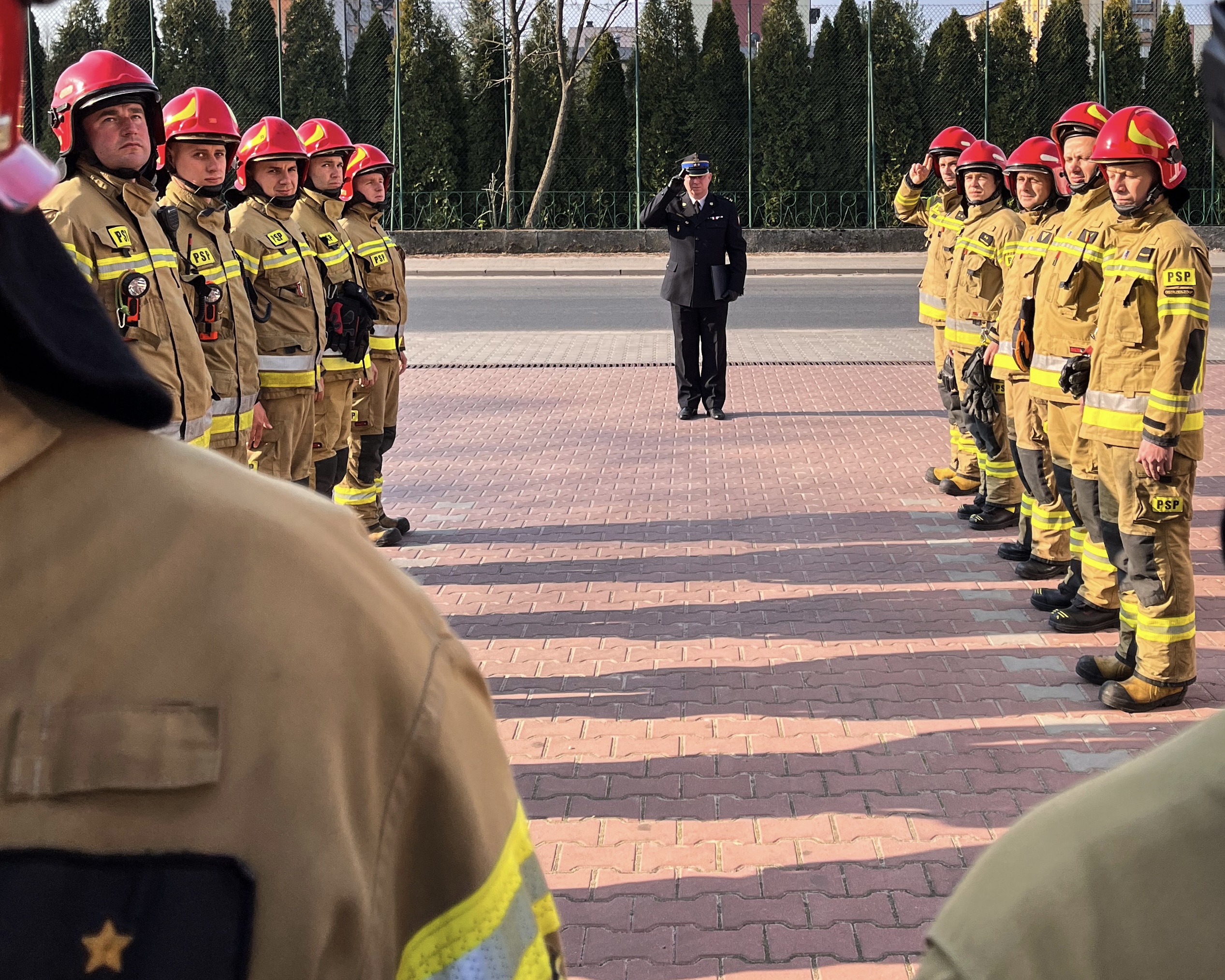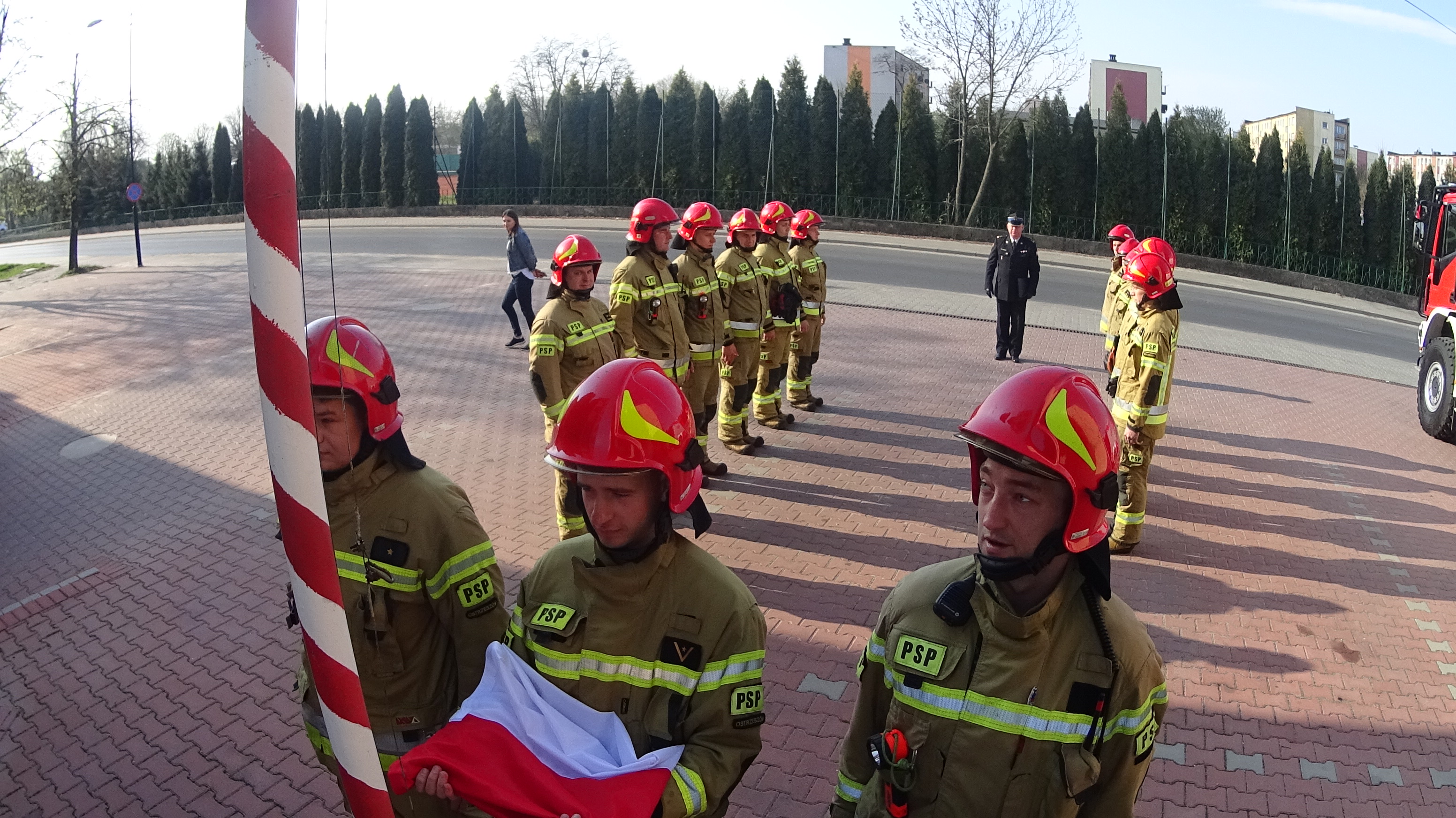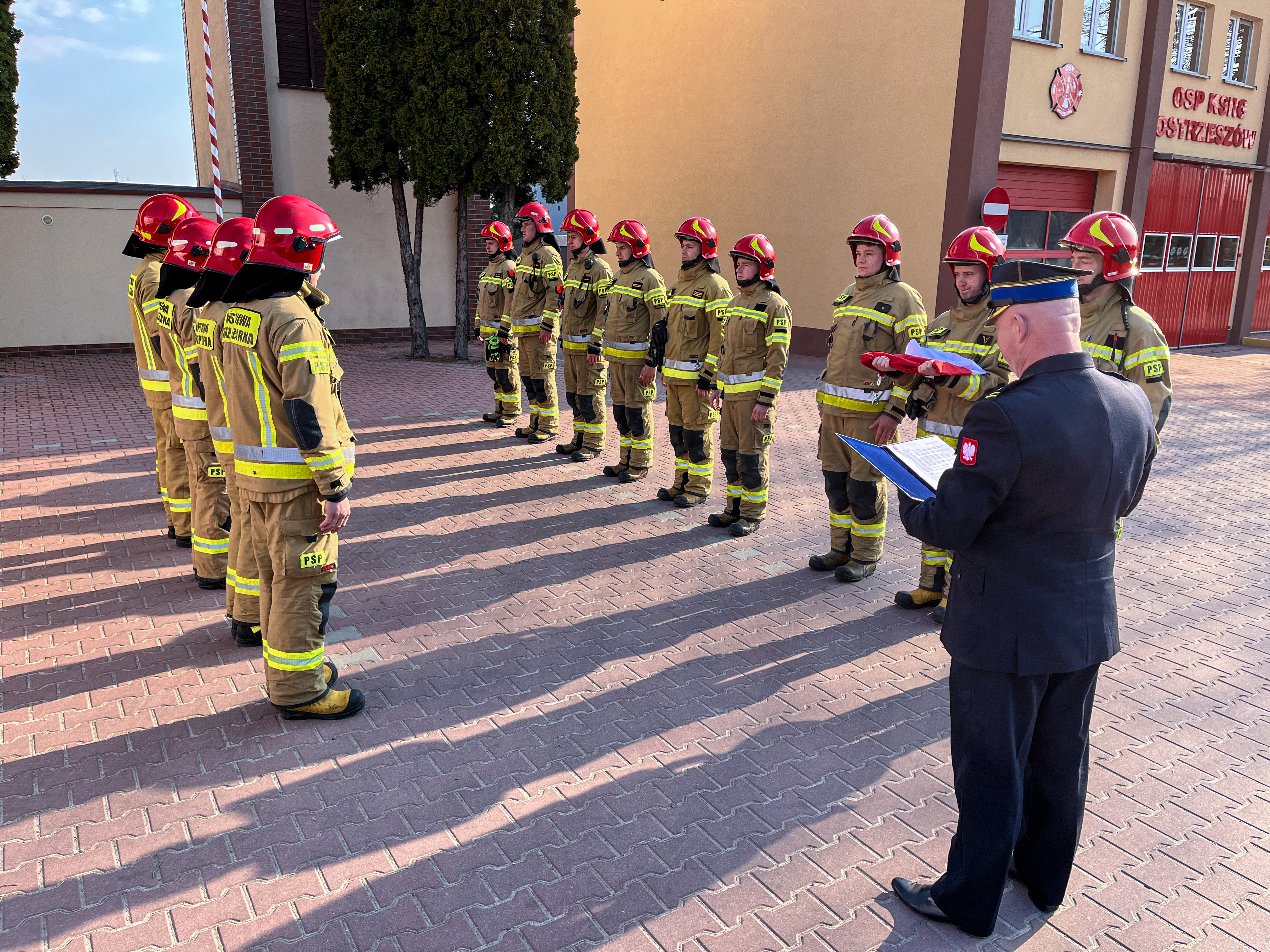 W uroczystości brały udział zmiany służbowe Jednostki Ratowniczo-Gaśniczej Państwowej Straży Pożarnej w Ostrzeszowie pod dowództwem bryg. Mariusza Szczepańskiego - Zastępcy Komendanta Powiatowego Państwowej Straży Pożarnej w Ostrzeszowie.
