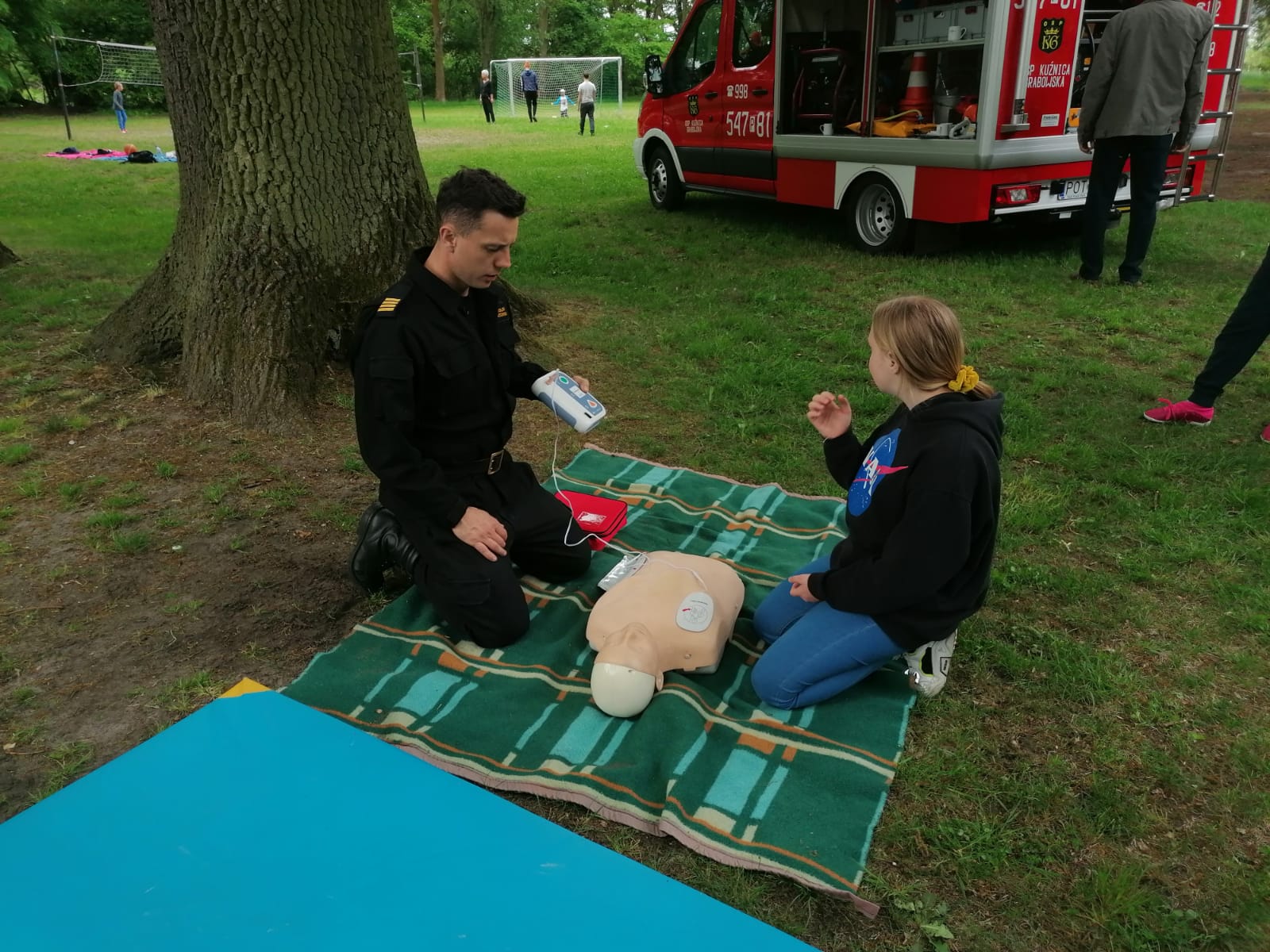 Funkcjonariusze Państwowej Straży Pożarnej w Ostrzeszowie przeprowadzili także pokaz udzielania pierwszej pomocy przedmedycznej z zastosowaniem AED i przekazali podstawowe informacje jak wzywać pomoc i co zrobić jeżeli będziemy świadkiem zdarzenia z osobą poszkodowaną co cieszyło się bardzo dużym zainteresowaniem wśród uczestników pogadanki.
