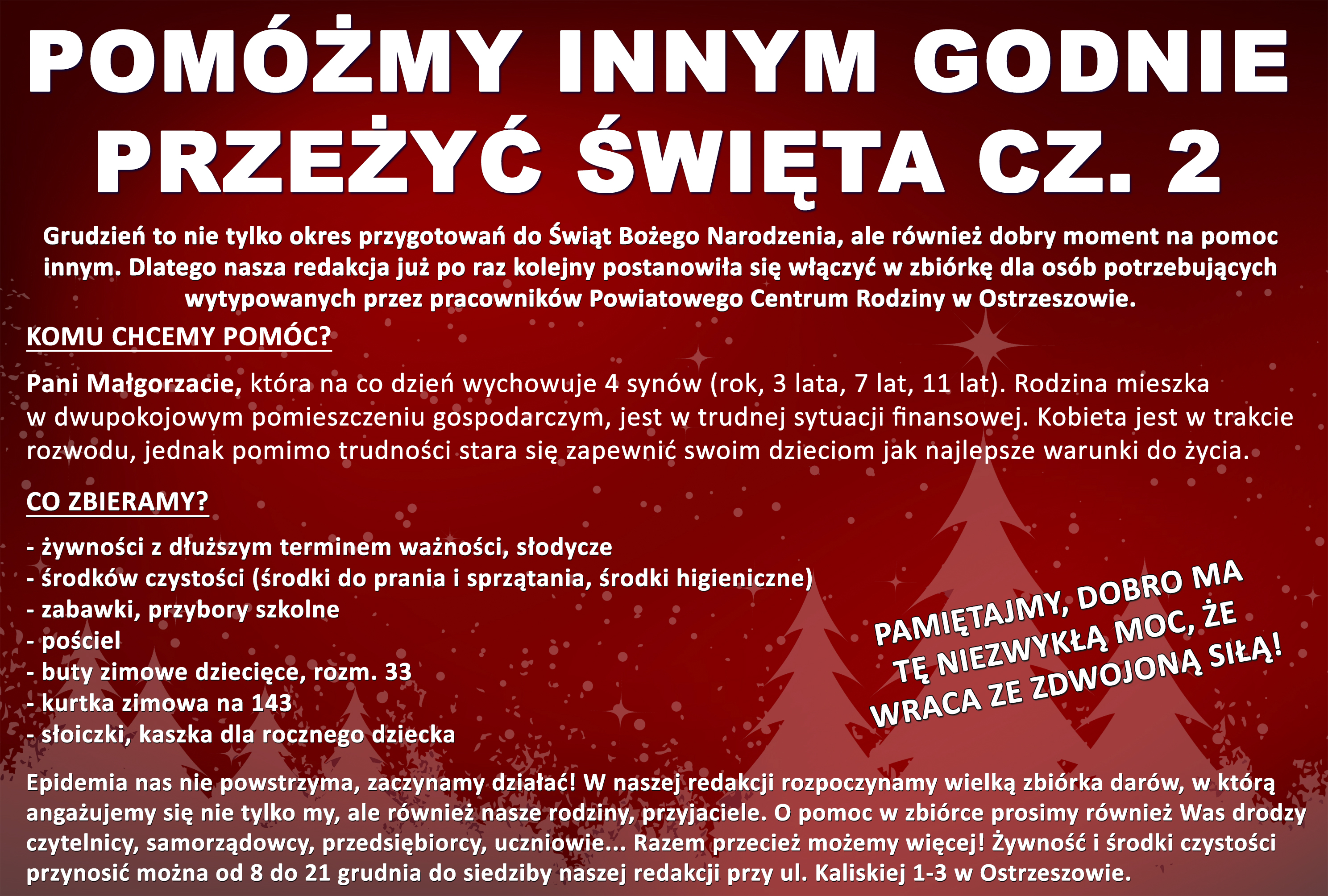 Żywność i środki czystości przynosić można od 8 do 21 grudnia do siedziby redakcji "Nasze strony ostrzeszowskie" przy ulicy Kaliskiej 1-3 w Ostrzeszowie.