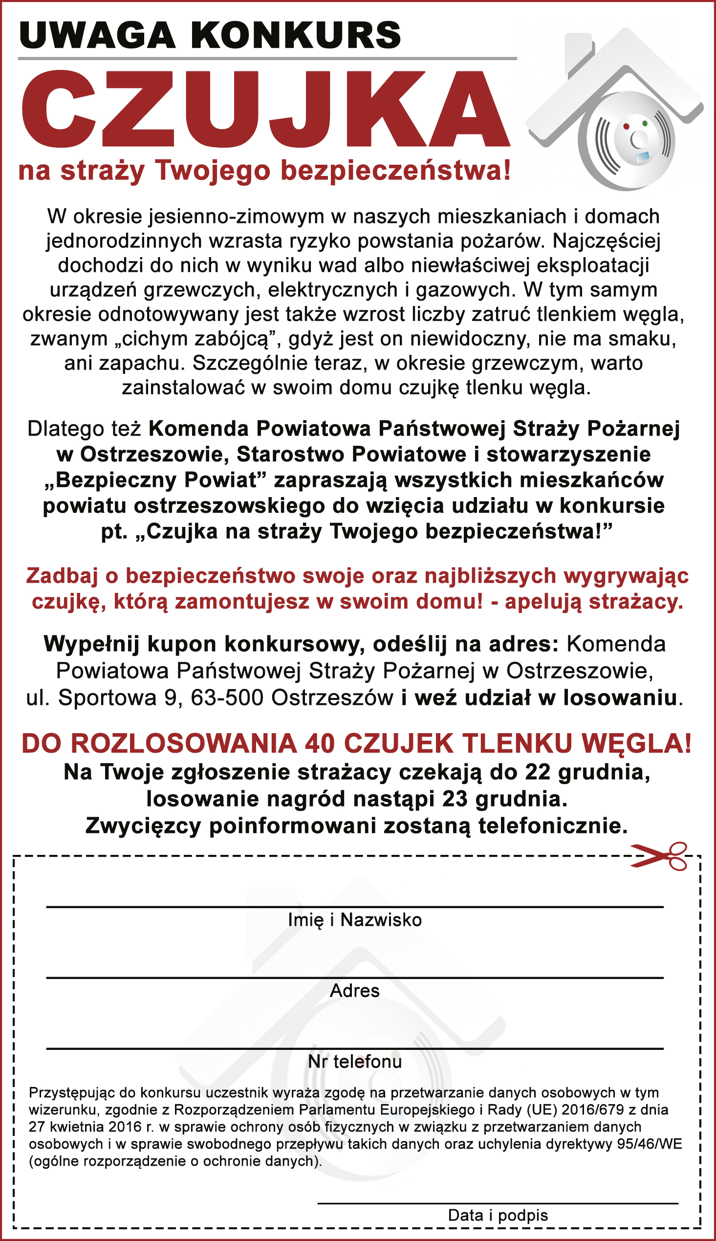 Komenda Powiatowa Państwowej Straży Pożarnej w Ostrzeszowie zaprasza wszystkich mieszkańców powiatu ostrzeszowskiego do wzięcia udziału w konkursie pt. „Czujka na straży Twojego bezpieczeństwa!” Zadbaj o bezpieczeństwo swoje oraz najbliższych wygrywając czujkę, którą zamontujesz w swoim domu. Wypełnij kupon konkursowy, odeślij na podany adres i weź udział w losowaniu. DO ROZLOSOWANIA 40 CZUJEK TLENKU WĘGLA!