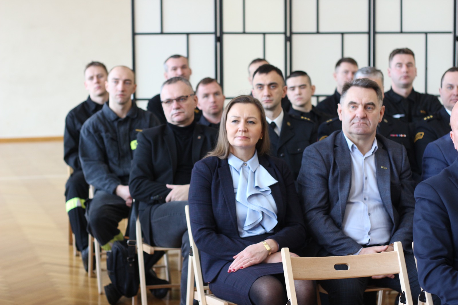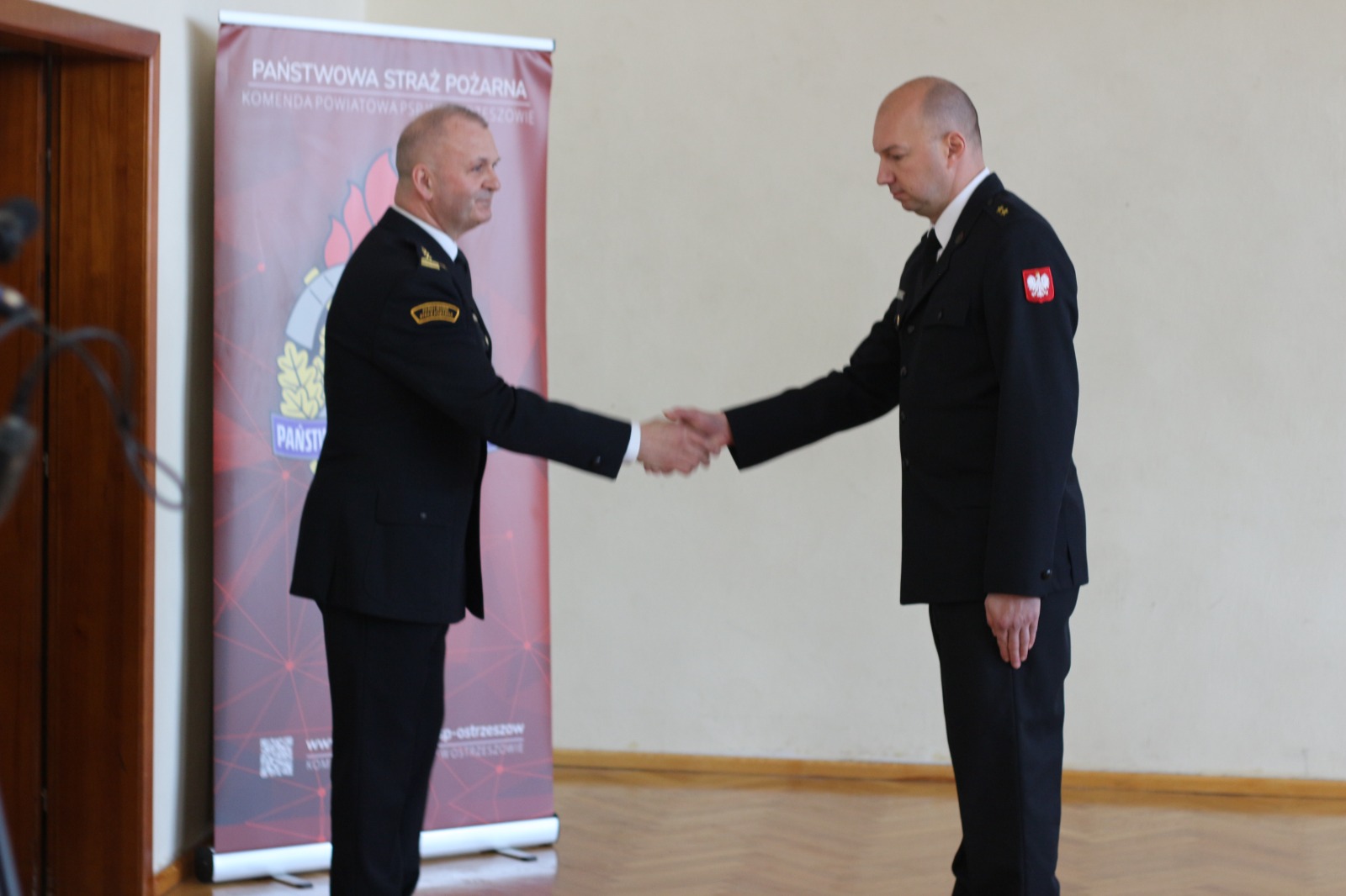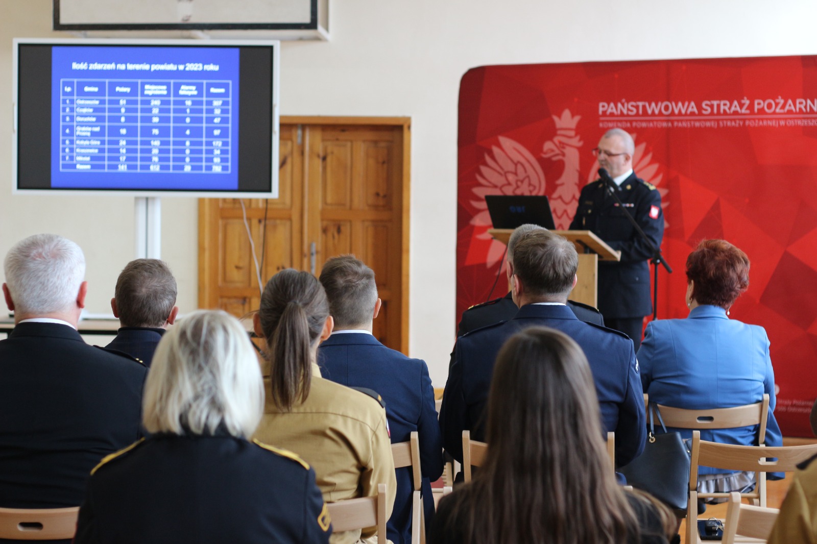 Komendant Powiatowy st. bryg. Piotr Mazurkiewicz przedstawił informacje dotyczące działalności Komendy Powiatowej PSP w Ostrzeszowie w roku 2023 oraz główne kierunki działań i cele wyznaczone dla Ostrzeszowskiej Komendy na rok 2024. Skierował słowa podziękowania dla władz samorządowych dziękując za całoroczną współpracę. Następnie zwrócił się do funkcjonariuszy oraz pracowników komendy, dziękując za zaangażowanie oraz wzorowe wykonywanie obowiązków służbowych.