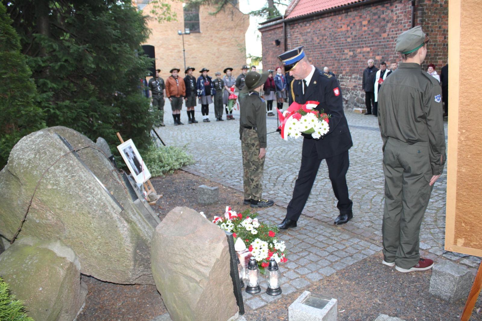 Komendant Powiatowy Państwowej Straży Pożarnej w Ostrzeszowie st. bryg. Piotr Mazurkiewicz reprezentując ostrzeszowskich strażaków złożył kwiaty pod pomnikiem.